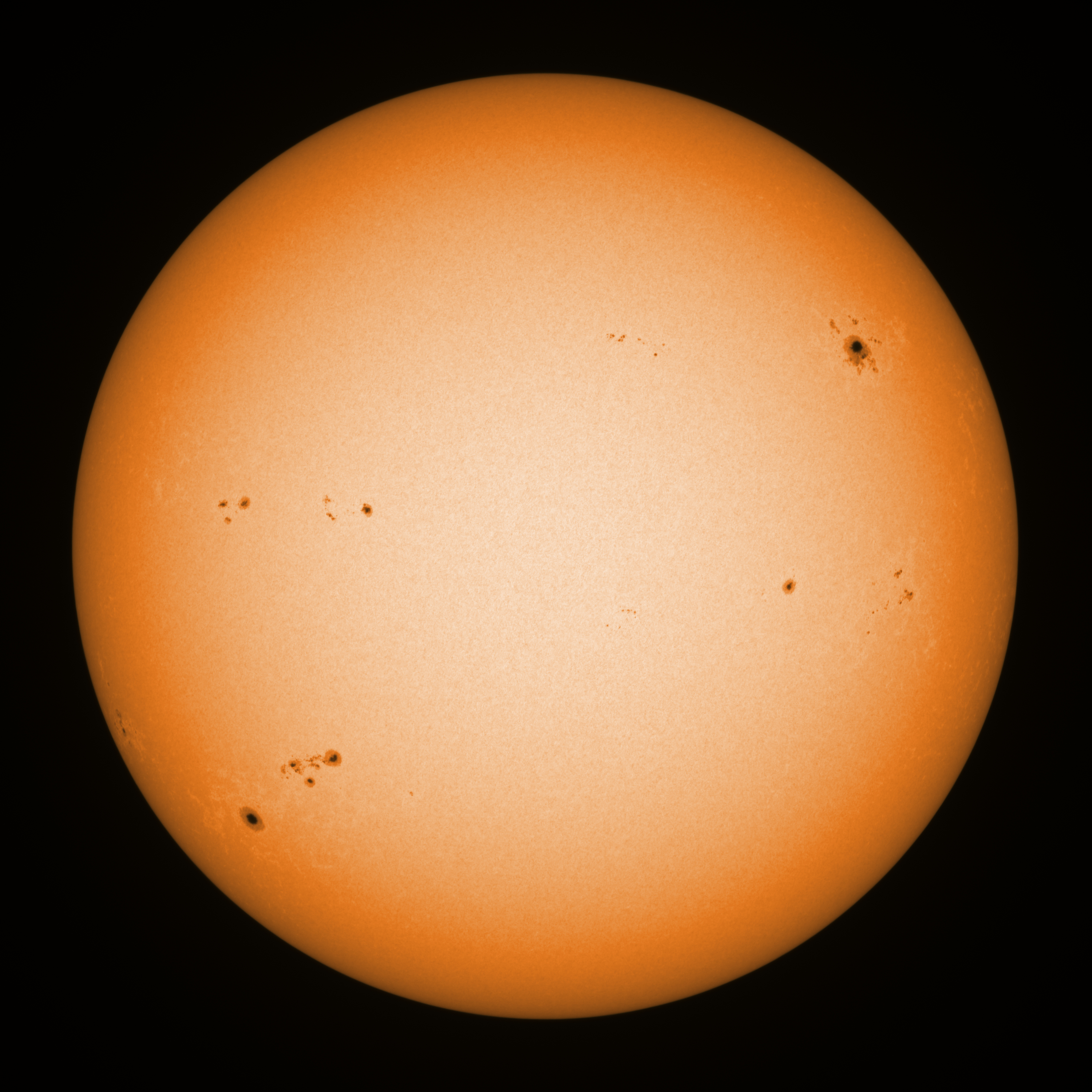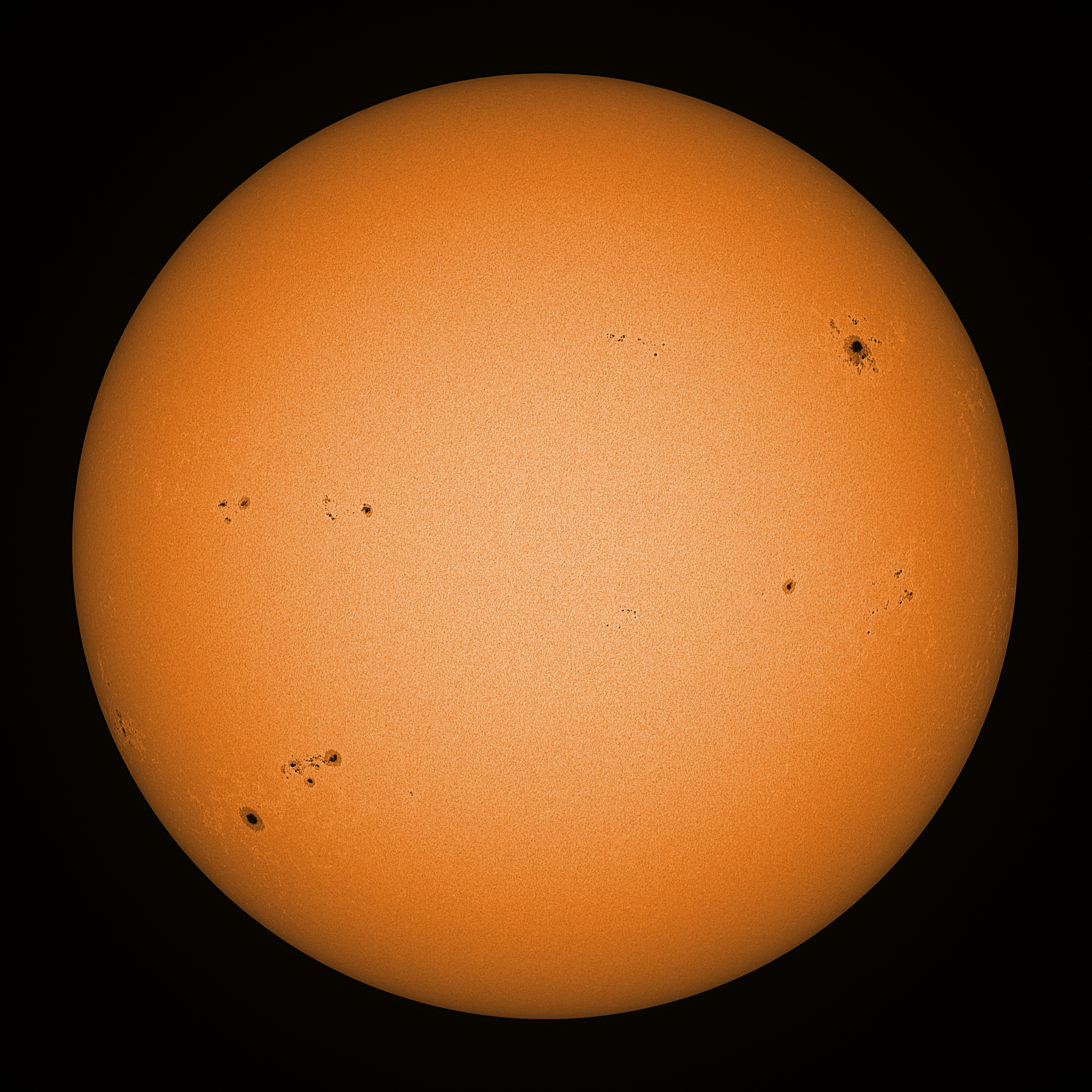 Observation date/time: 18 August 2024 13:14 UTC Telescope: GTT60 (Galileo Type Telescope) Focal length: 1490mm (plano convex singlet) Aperture: 60mm Stop: 30mm Eyepiece: -75mm (plano concave singlet, 24mm aperture) Observation type: projection (349mm distance, 80mm diameter) Reference: Earth's rotation axis Exposure (transparency): 0.680ms (using 82nm bandwidth green filter) Seeing (SSSMon): 4.0-4.5" (3.0" at best) =================================================================== Total number of sunspots: 51 | |