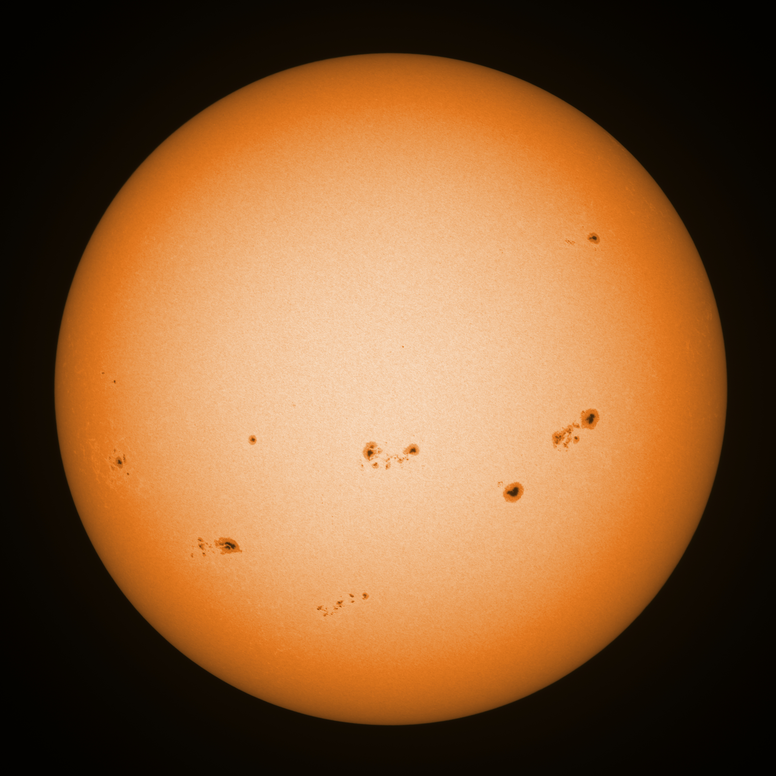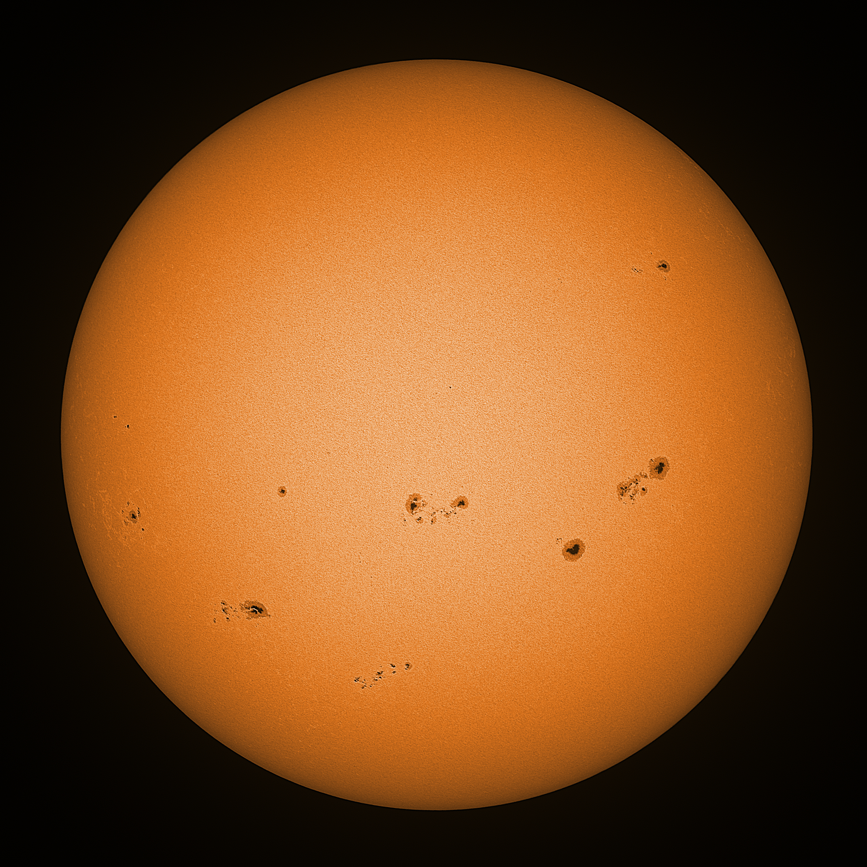 Observation date/time: 23 August 2024 16:30 UTC Telescope: GTT60 (Galileo Type Telescope) Focal length: 1490mm (plano convex singlet) Aperture: 60mm Stop: 30mm Eyepiece: -75mm (plano concave singlet, 24mm aperture) Observation type: projection (349mm distance, 80mm diameter) Reference: Earth's rotation axis Exposure (transparency): 0.910ms (using 82nm bandwidth green filter) Seeing (SSSMon): 2.0-3.0" (1.5" at best) =================================================================== Total number of sunspots: 63 | |