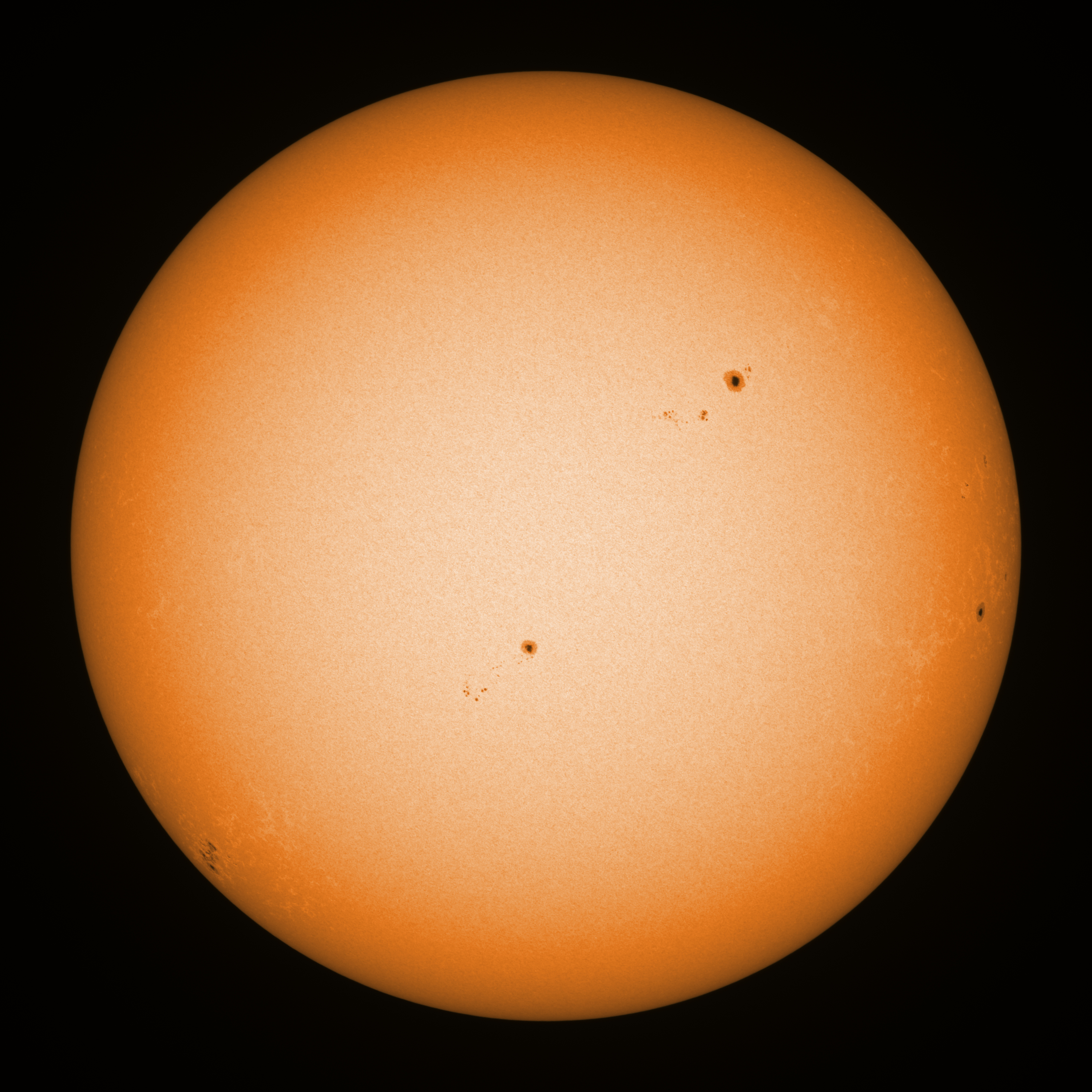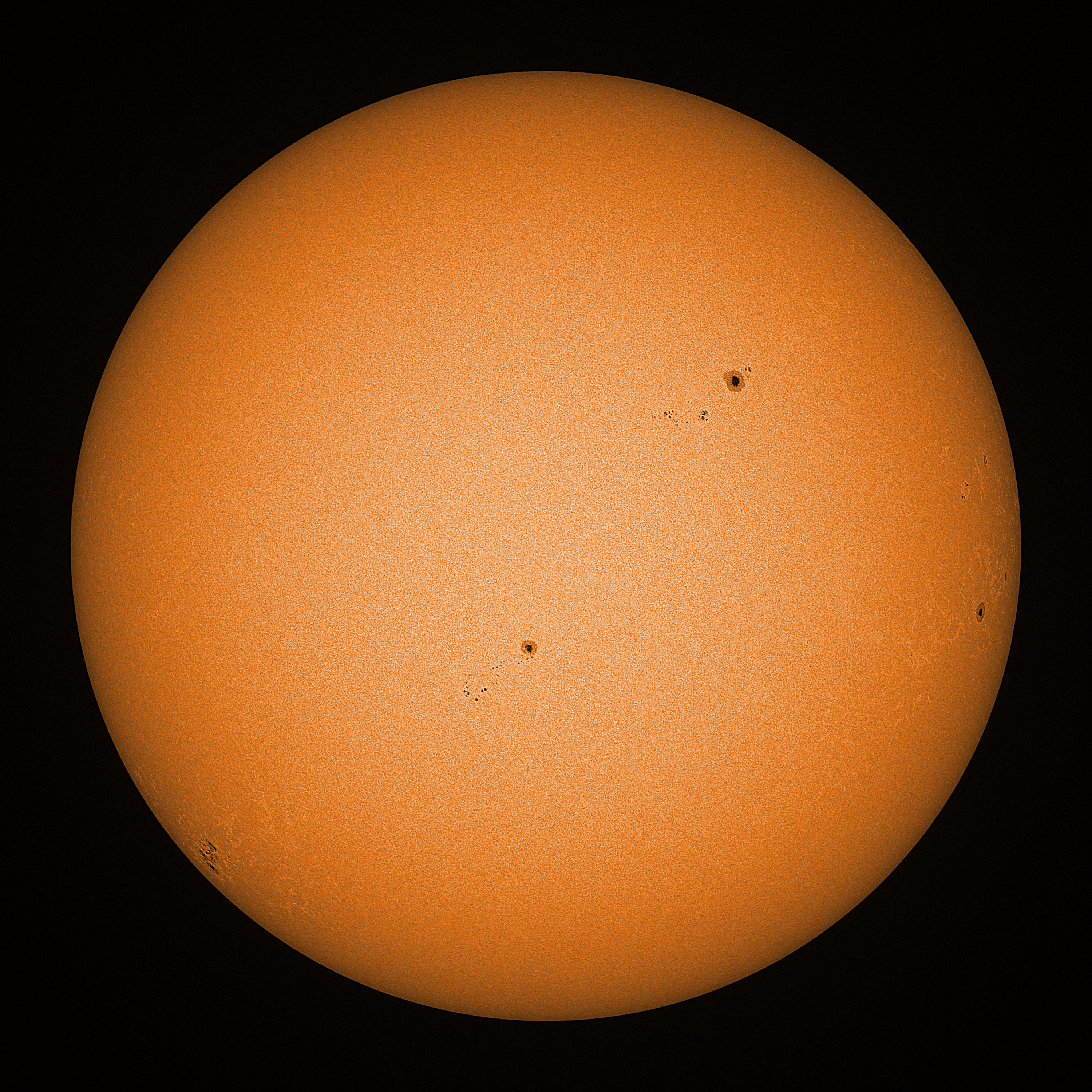 Observation date/time: 13 September 2024 08:51 UTC Telescope: GTT60 (Galileo Type Telescope) Focal length: 1490mm (plano convex singlet) Aperture: 60mm Stop: 30mm Eyepiece: -75mm (plano concave singlet, 24mm aperture) Observation type: projection (347mm distance, 80mm diameter) Reference: Earth's rotation axis Exposure (transparency): 0.430ms (using 82nm bandwidth green filter) Seeing (SSSMon): 2.5-3.0" (1.5" at best) =================================================================== Total number of sunspots: 22 | |