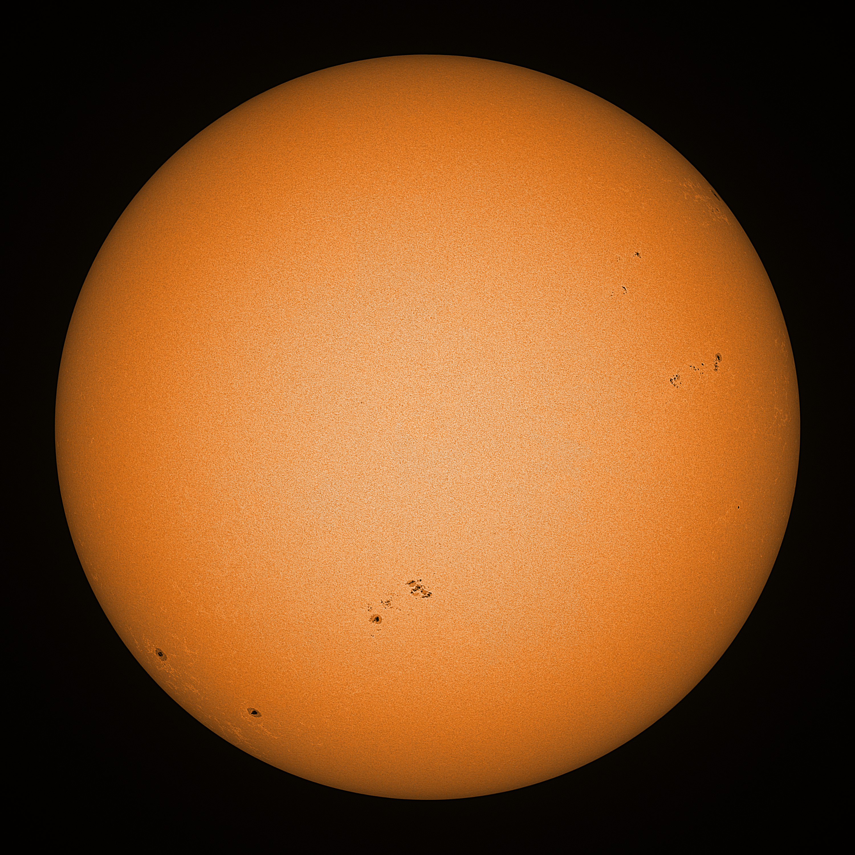 Observation date/time: 17 September 2024 09:45 UTC Telescope: GTT60 (Galileo Type Telescope) Focal length: 1490mm (plano convex singlet) Aperture: 60mm Stop: 30mm Eyepiece: -75mm (plano concave singlet, 24mm aperture) Observation type: projection (347mm distance, 80mm diameter) Reference: Earth's rotation axis Exposure (transparency): 0.480ms (using 82nm bandwidth green filter) Seeing (SSSMon): 4.5-5.5" (3.0" at best) =================================================================== Total number of sunspots: 36 | |