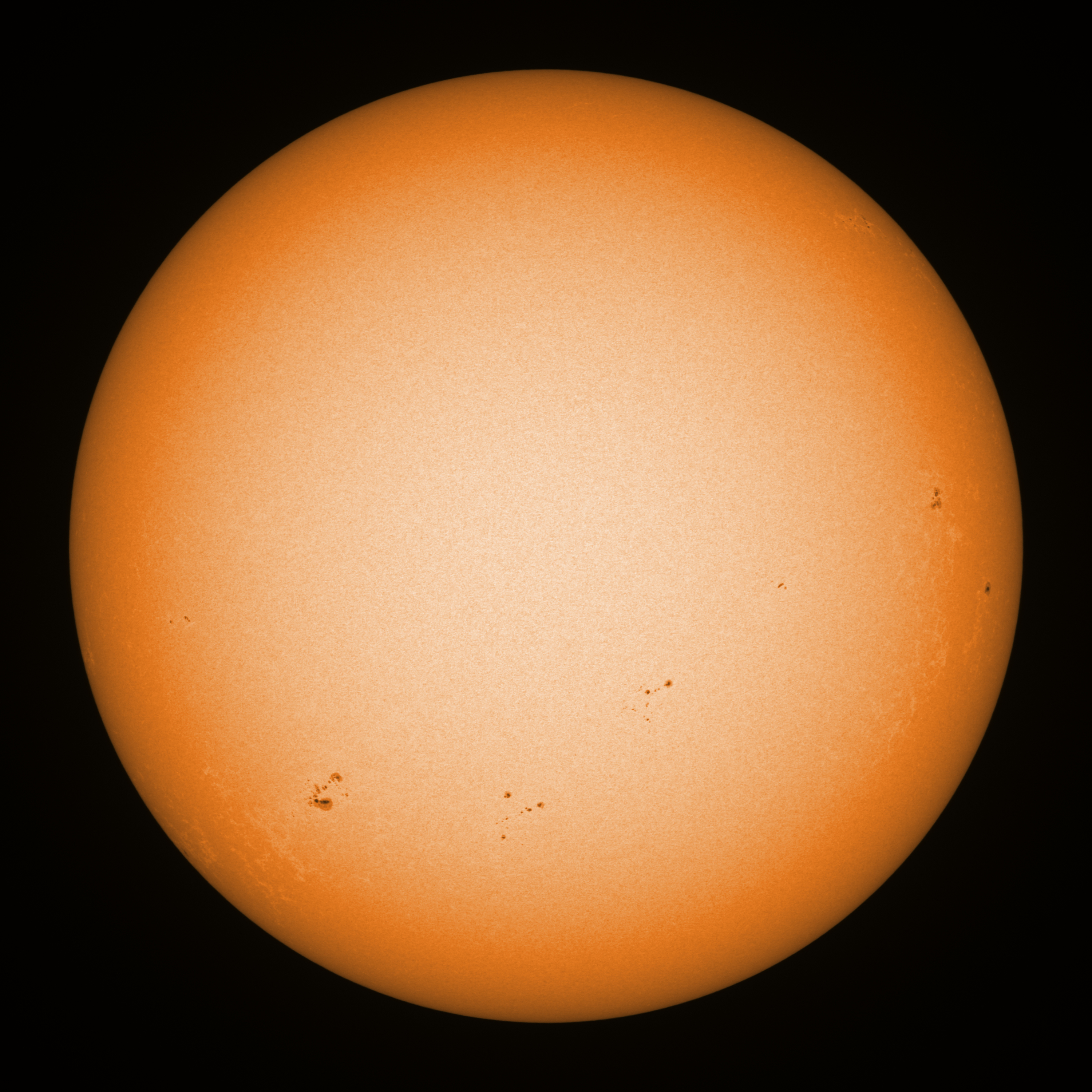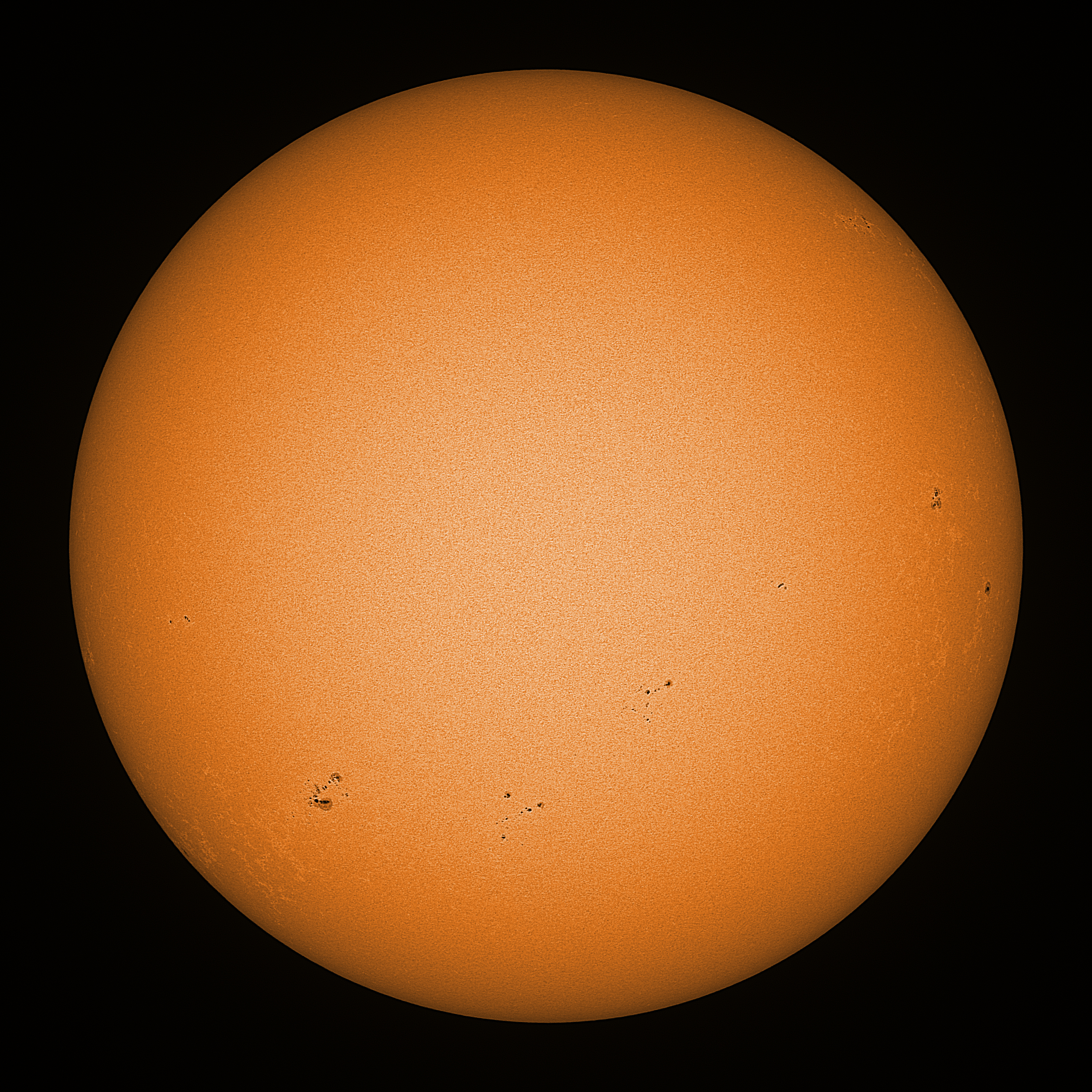 Observation date/time: 26 September 2024 08:36 UTC Telescope: GTT60 (Galileo Type Telescope) Focal length: 1490mm (plano convex singlet) Aperture: 60mm Stop: 30mm Eyepiece: -75mm (plano concave singlet, 24mm aperture) Observation type: projection (347mm distance, 80mm diameter) Reference: Earth's rotation axis Exposure (transparency): 0.480ms (using 82nm bandwidth green filter) Seeing (SSSMon): 1.0-1.2" (0.6" at best) =================================================================== Total number of sunspots: 27 | |