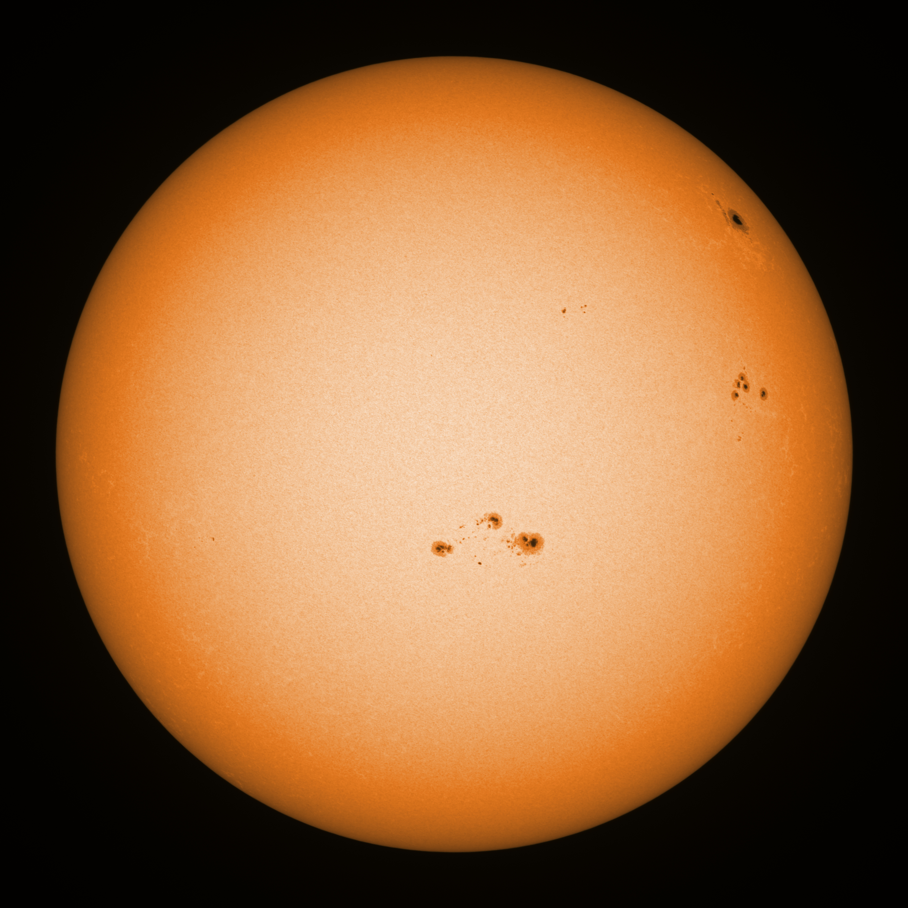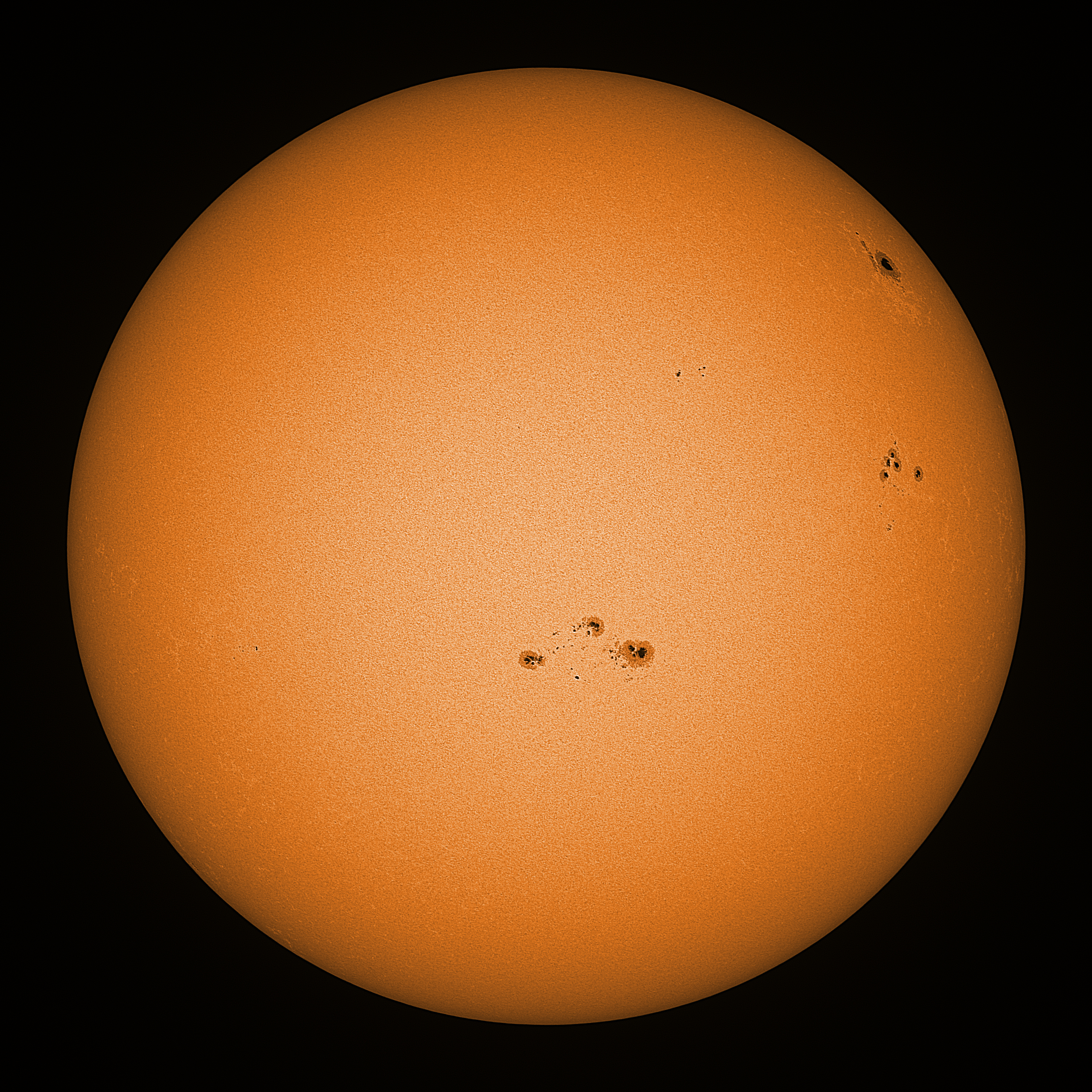 Observation date/time: 13 October 2024 09:24 UTC Telescope: GTT60 (Galileo Type Telescope) Focal length: 1490mm (plano convex singlet) Aperture: 60mm Stop: 30mm Eyepiece: -75mm (plano concave singlet, 24mm aperture) Observation type: projection (347mm distance, 80mm diameter) Reference: Earth's rotation axis Exposure (transparency): 0.480ms (using 82nm bandwidth green filter) Seeing (SSSMon): 2.0-2.5" (1.2" at best) =================================================================== Total number of sunspots: 33 | |