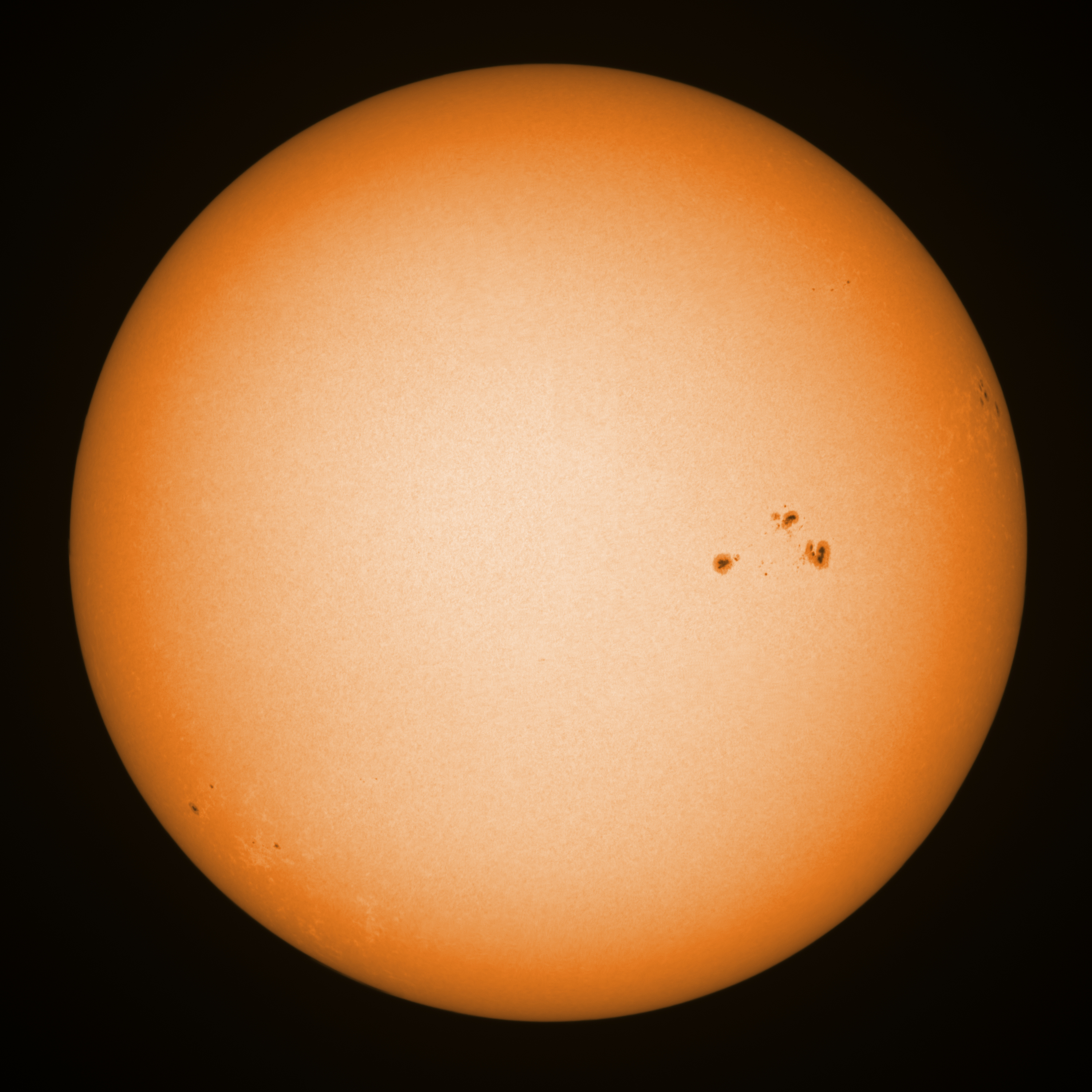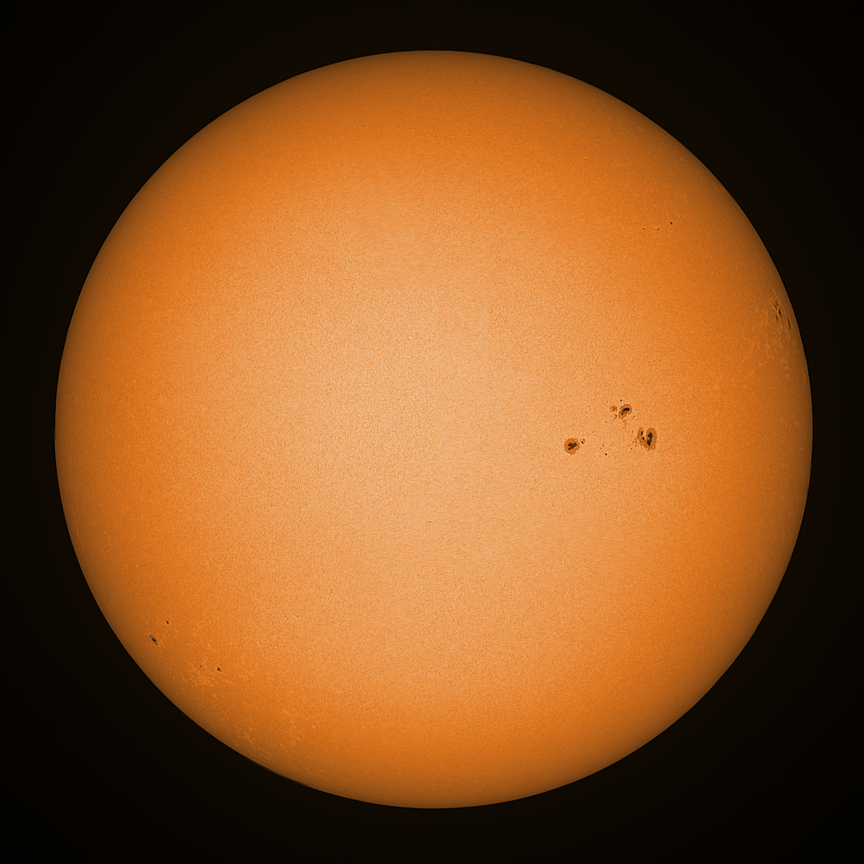 Observation date/time: 15 October 2024 08:56 UTC Telescope: GTT60 (Galileo Type Telescope) Focal length: 1490mm (plano convex singlet) Aperture: 60mm Stop: 30mm Eyepiece: -75mm (plano concave singlet, 24mm aperture) Observation type: projection (347mm distance, 80mm diameter) Reference: Earth's rotation axis Exposure (transparency): 0.680ms (using 82nm bandwidth green filter) Seeing (SSSMon): 1.5-1.6" (0.8" at best) =================================================================== Total number of sunspots: 27 | |