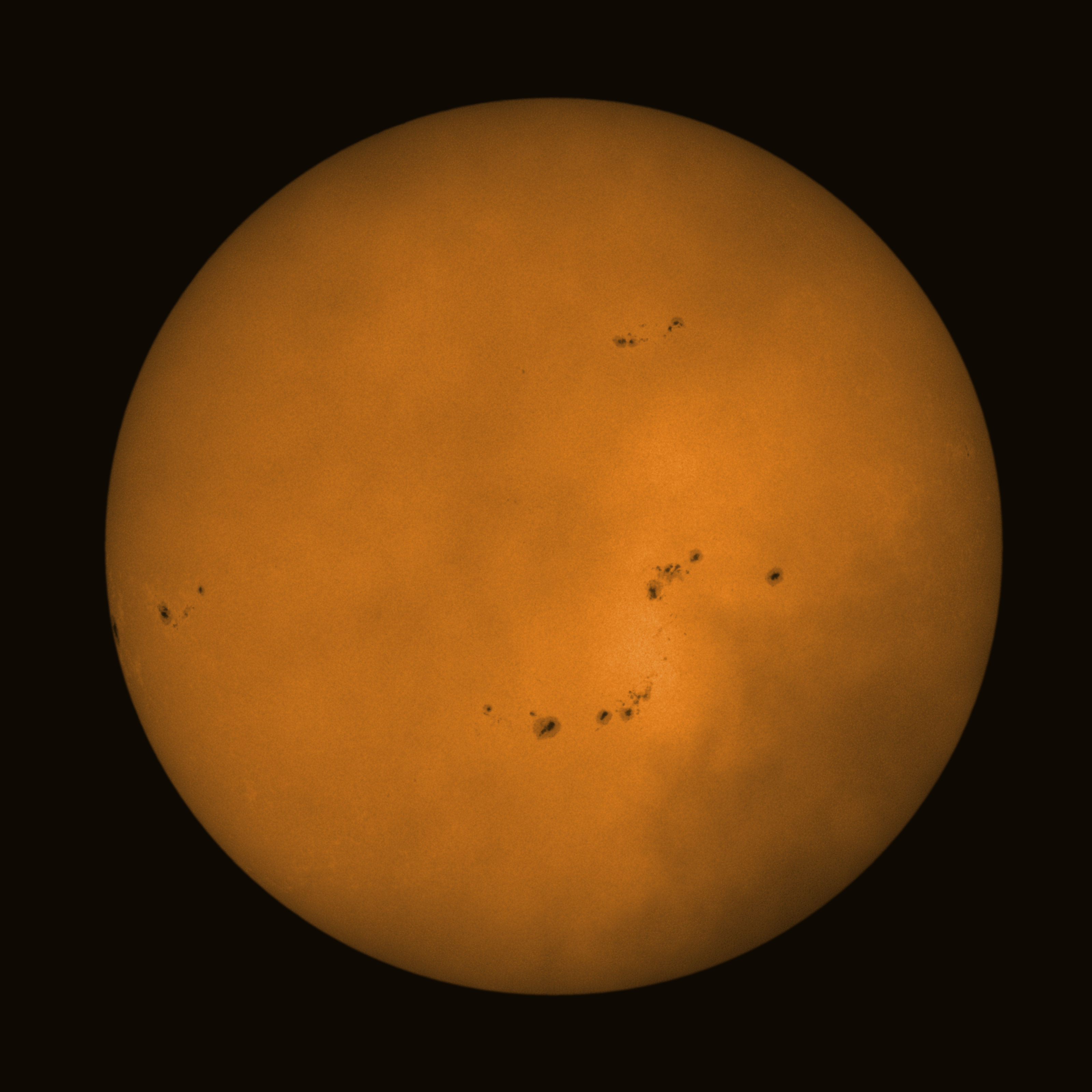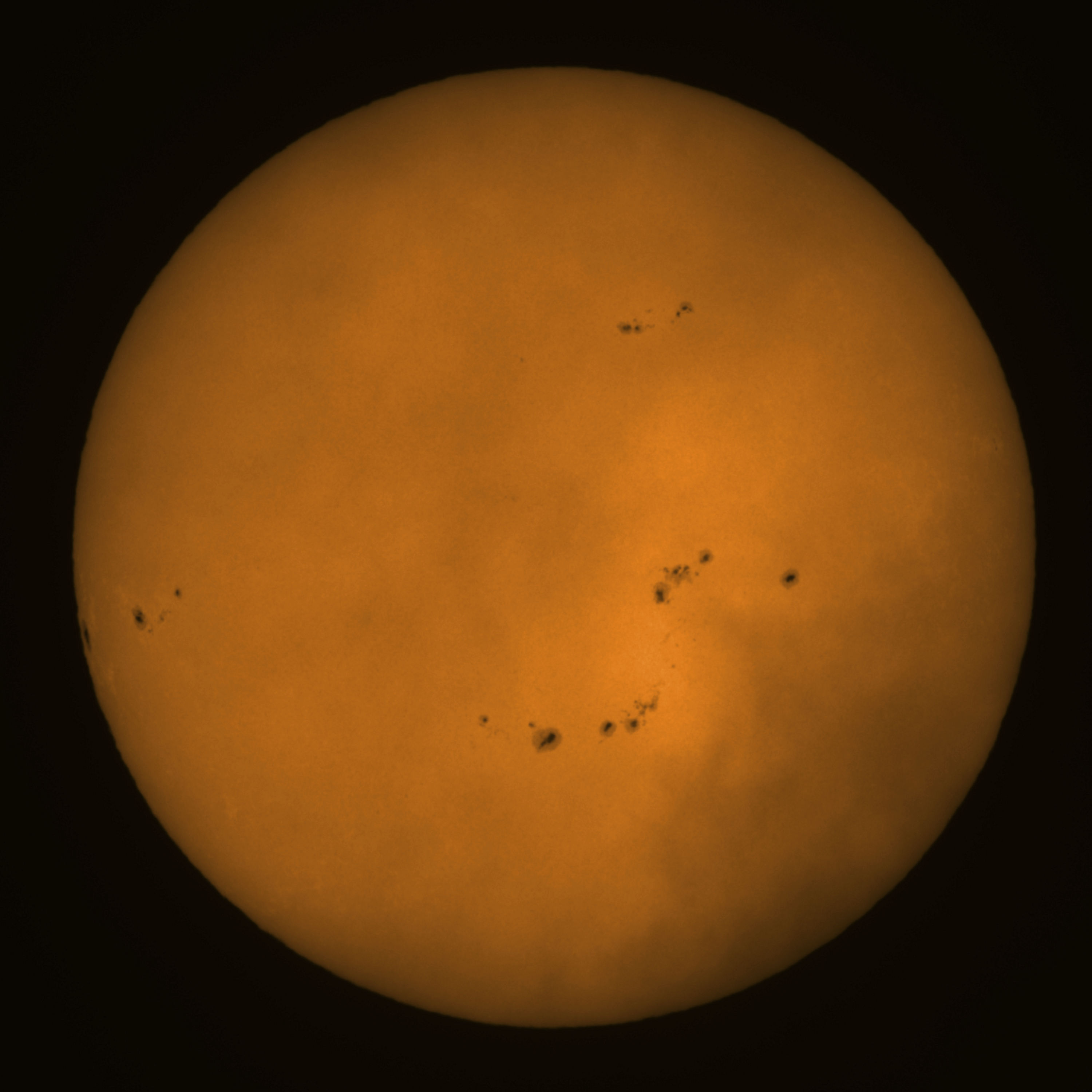 Observation date/time: 29 October 2024 10:54 UTC Telescope: GTT60 (Galileo Type Telescope) Focal length: 1490mm (plano convex singlet) Aperture: 60mm Stop: 30mm Eyepiece: -75mm (plano concave singlet, 24mm aperture) Observation type: projection (347mm distance, 80mm diameter) Reference: Earth's rotation axis Exposure (transparency): 0.480ms (using 82nm bandwidth green filter) Seeing (SSSMon): 0.7-1.0" (0.5" at best) =================================================================== Total number of sunspots: 52 | |