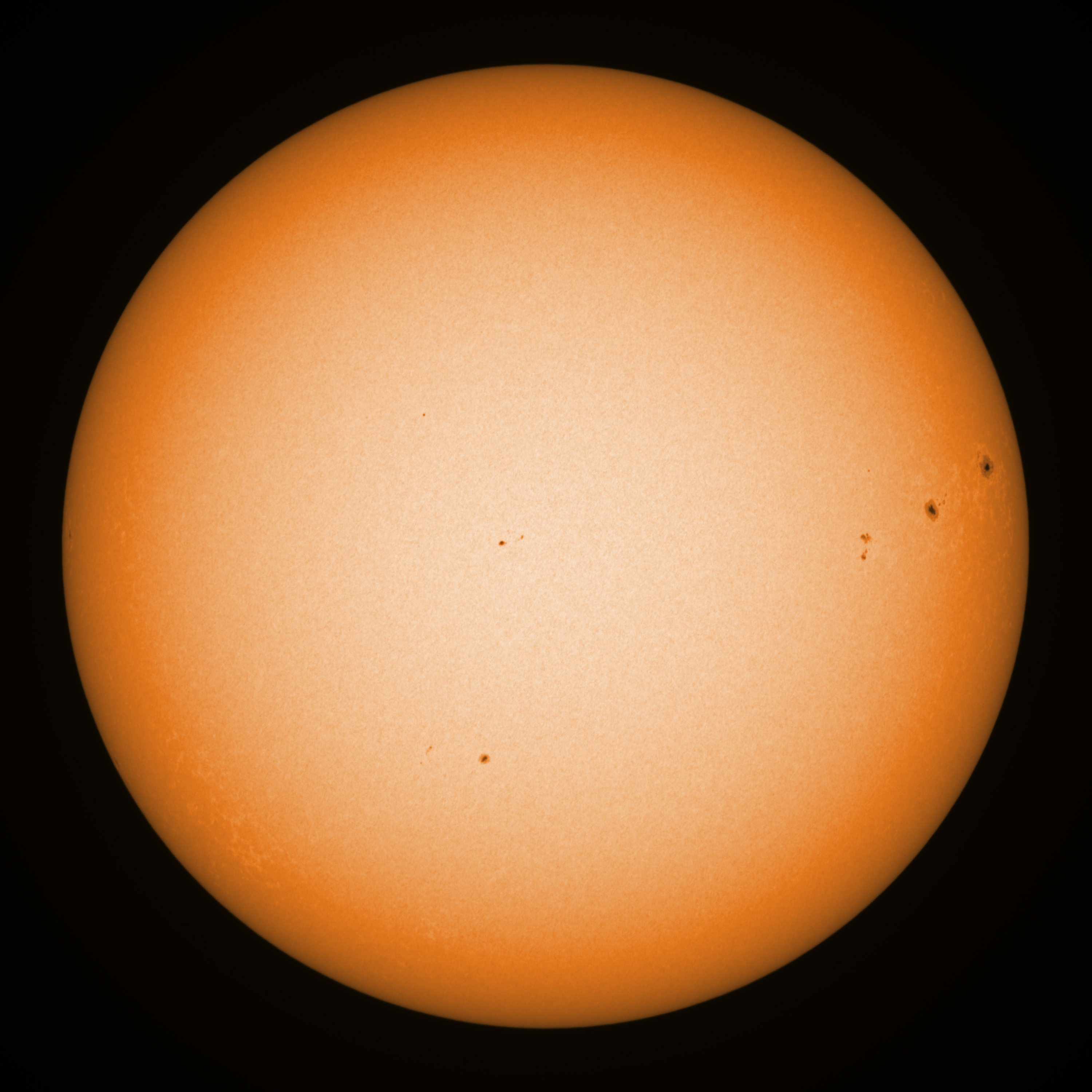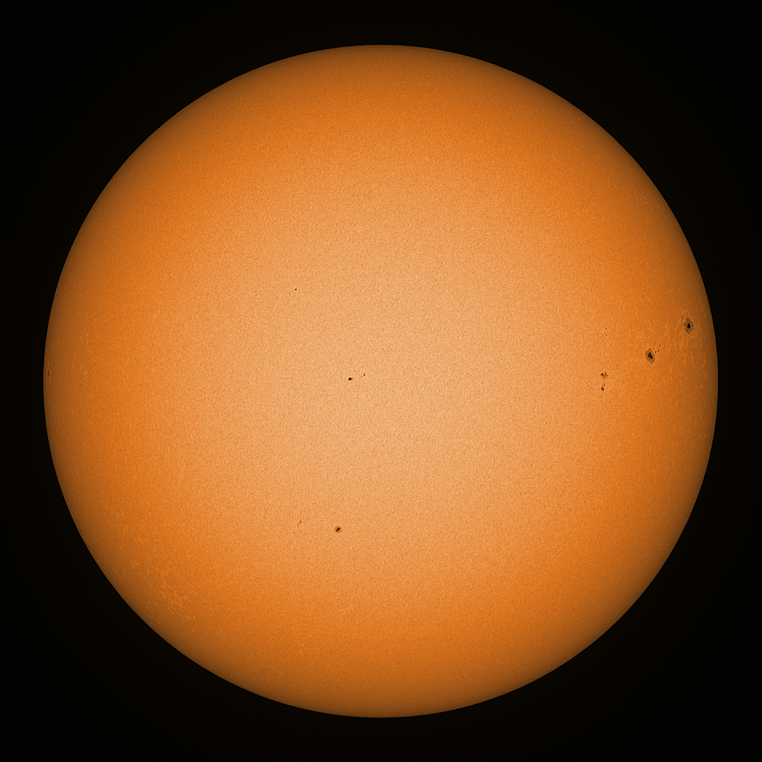 Observation date/time: 17 November 2024 11:39 UTC Telescope: GTT60 (Galileo Type Telescope) Focal length: 1490mm (plano convex singlet) Aperture: 60mm Stop: 30mm Eyepiece: -75mm (plano concave singlet, 24mm aperture) Observation type: projection (347mm distance, 80mm diameter) Reference: Earth's rotation axis Exposure (transparency): 0.530ms (using 82nm bandwidth green filter) Seeing (SSSMon): 1.8-2.5" (1.5" at best) =================================================================== Total number of sunspots: 10 | |