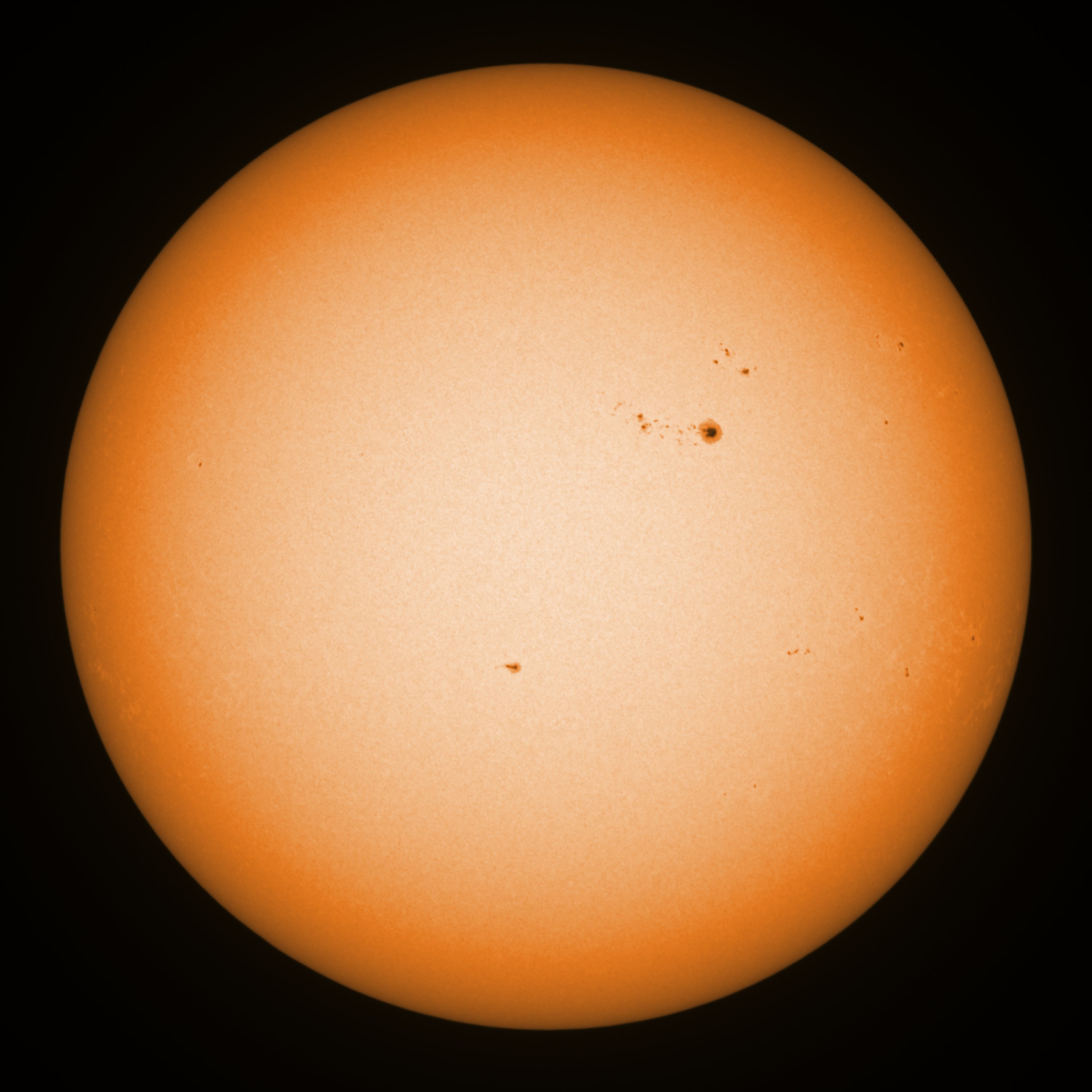 Observation date/time: 09 January 2025 10:01 UTC Telescope: GTT60 (Galileo Type Telescope) Focal length: 1490mm (plano convex singlet) Aperture: 60mm Stop: 30mm Eyepiece: -75mm (plano concave singlet, 24mm aperture) Observation type: projection (342mm distance, 80mm diameter) Reference: Earth's rotation axis Exposure (transparency): 0.730ms (using 82nm bandwidth green filter) Seeing (SSSMon): 3.0-3.5" (1.5" at best) =================================================================== Total number of sunspots: 30 | |