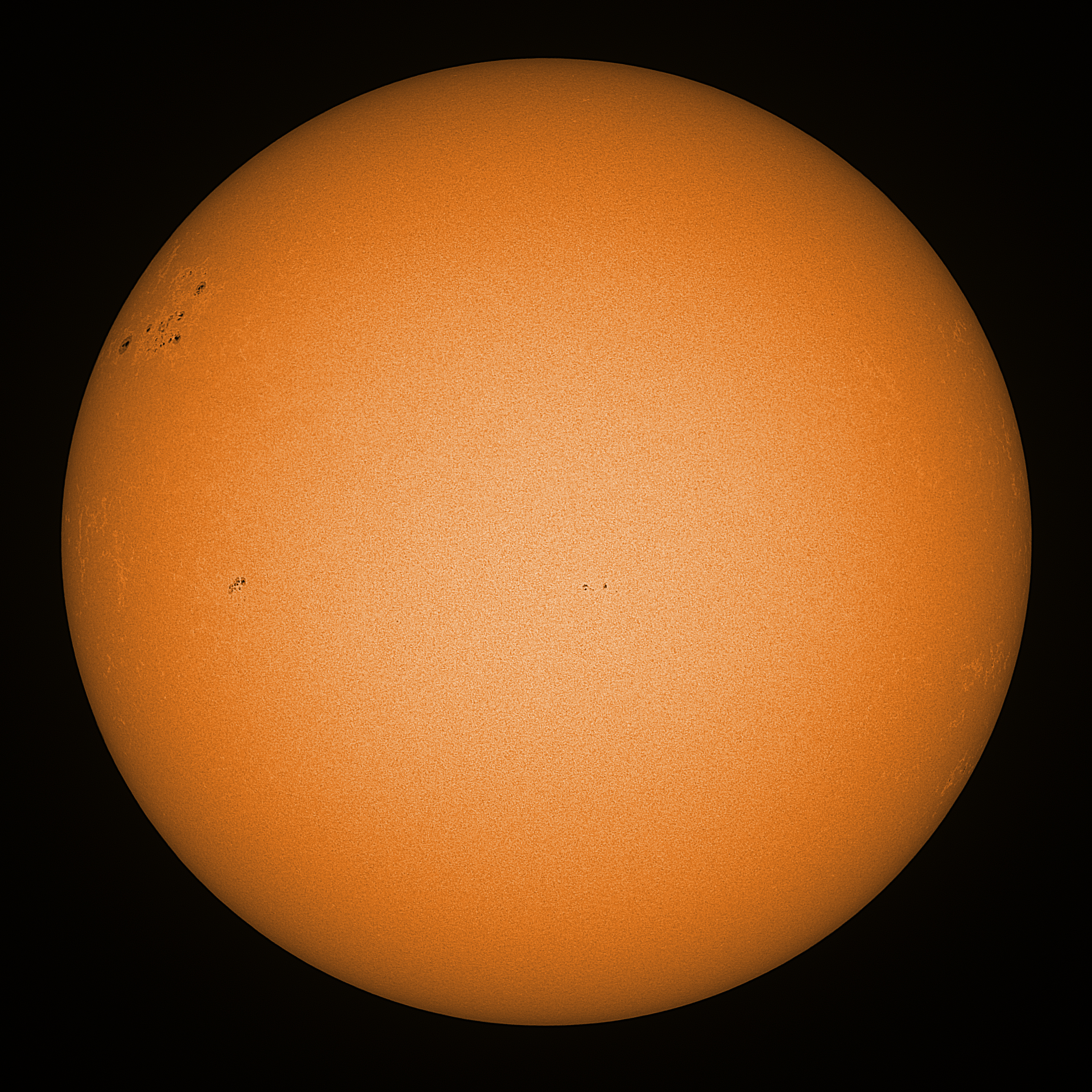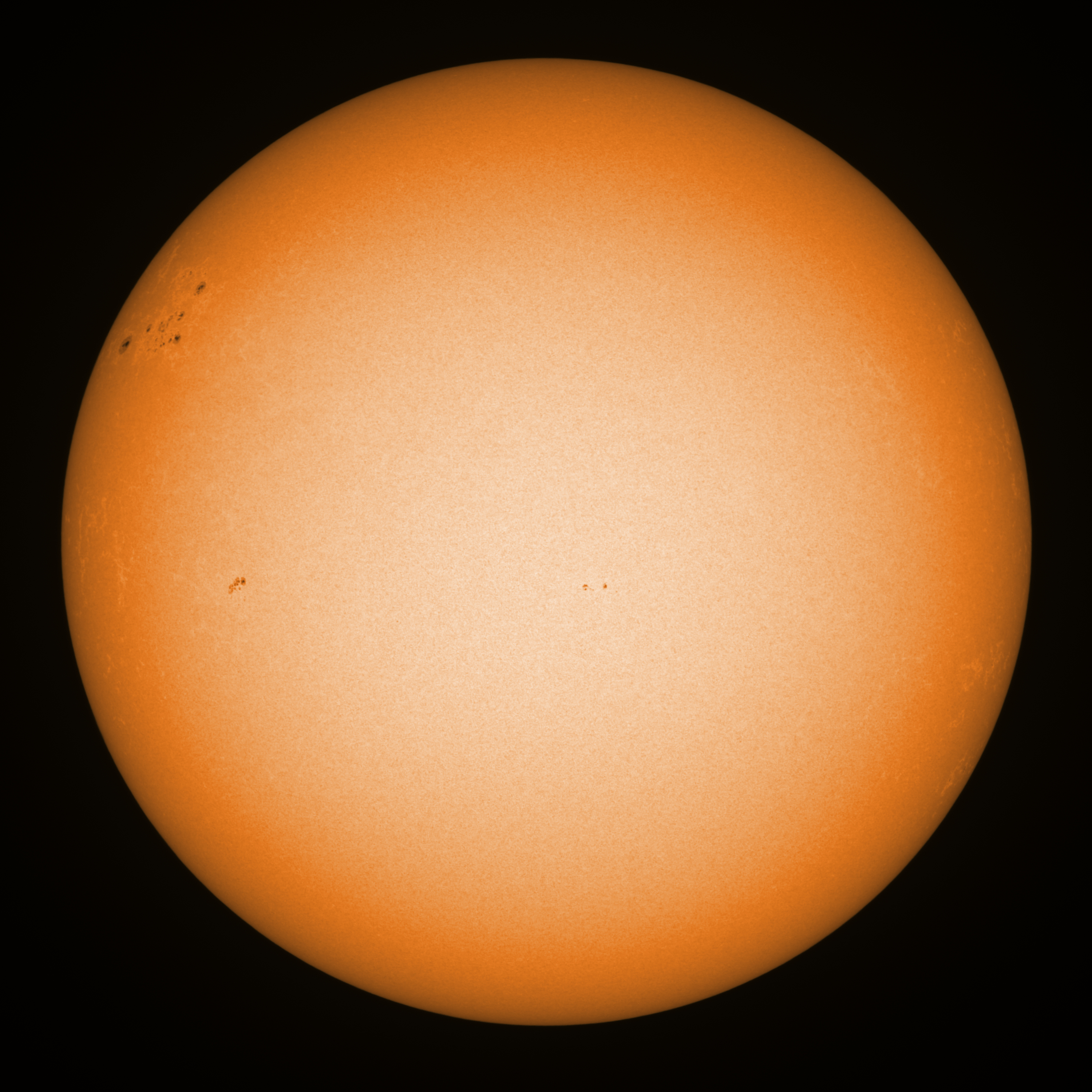 Observation date/time: 29 January 2025 13:51 UTC Telescope: GTT60 (Galileo Type Telescope) Focal length: 1490mm (plano convex singlet) Aperture: 60mm Stop: 30mm Eyepiece: -75mm (plano concave singlet, 24mm aperture) Observation type: projection (341mm distance, 80mm diameter) Reference: Earth's rotation axis Exposure (transparency): 0.680ms (using 82nm bandwidth green filter) Seeing (SSSMon): 1.9-2.0" (1.3" at best) =================================================================== Total number of sunspots: 17 | |