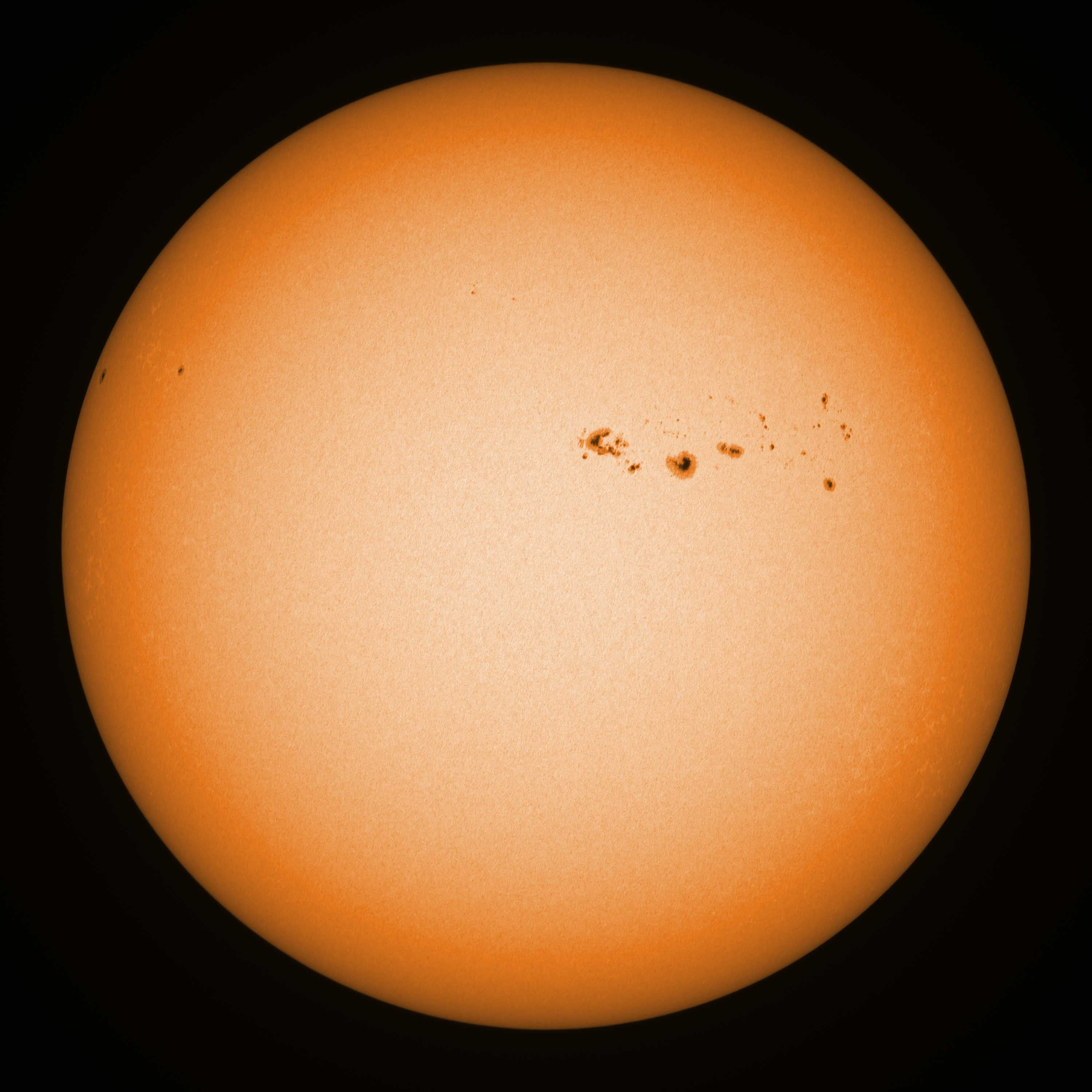 Observation date/time: 05 February 2025 09:49 UTC Telescope: GTT60 (Galileo Type Telescope) Focal length: 1490mm (plano convex singlet) Aperture: 60mm Stop: 30mm Eyepiece: -75mm (plano concave singlet, 24mm aperture) Observation type: projection (341mm distance, 80mm diameter) Reference: Earth's rotation axis Exposure (transparency): 0.680ms (using 82nm bandwidth green filter) Seeing (SSSMon): 2.0-3.5" (1.4" at best) =================================================================== Total number of sunspots: 44 | |