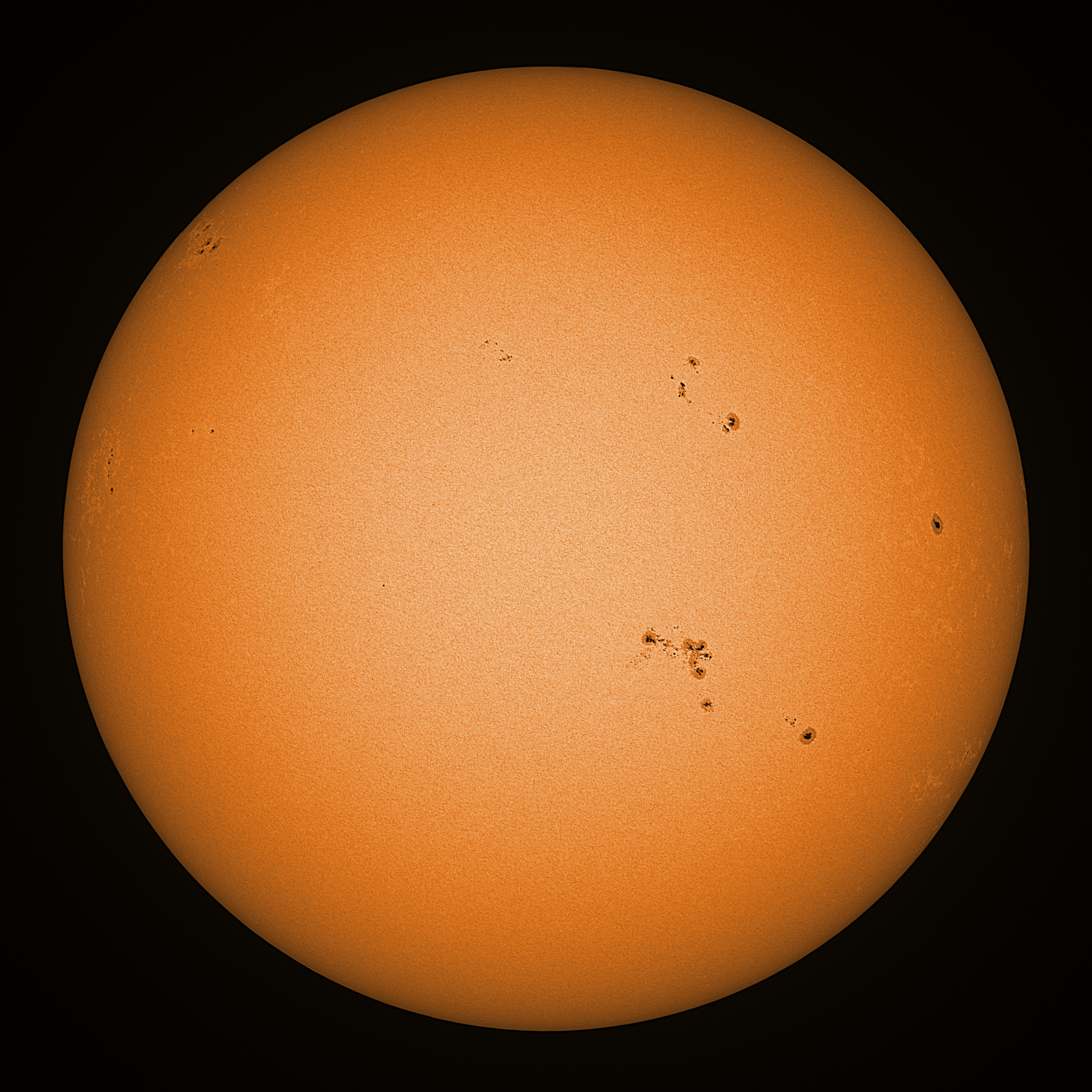 Observation date/time: 23 February 2025 10:50 UTC Telescope: GTT60 (Galileo Type Telescope) Focal length: 1490mm (plano convex singlet) Aperture: 60mm Stop: 30mm Eyepiece: -75mm (plano concave singlet, 24mm aperture) Observation type: projection (341mm distance, 80mm diameter) Reference: Earth's rotation axis Exposure (transparency): 0.630ms (using 82nm bandwidth green filter) Seeing (SSSMon): 2.0-2.5" (1.0" at best) =================================================================== Total number of sunspots: 47 | |
