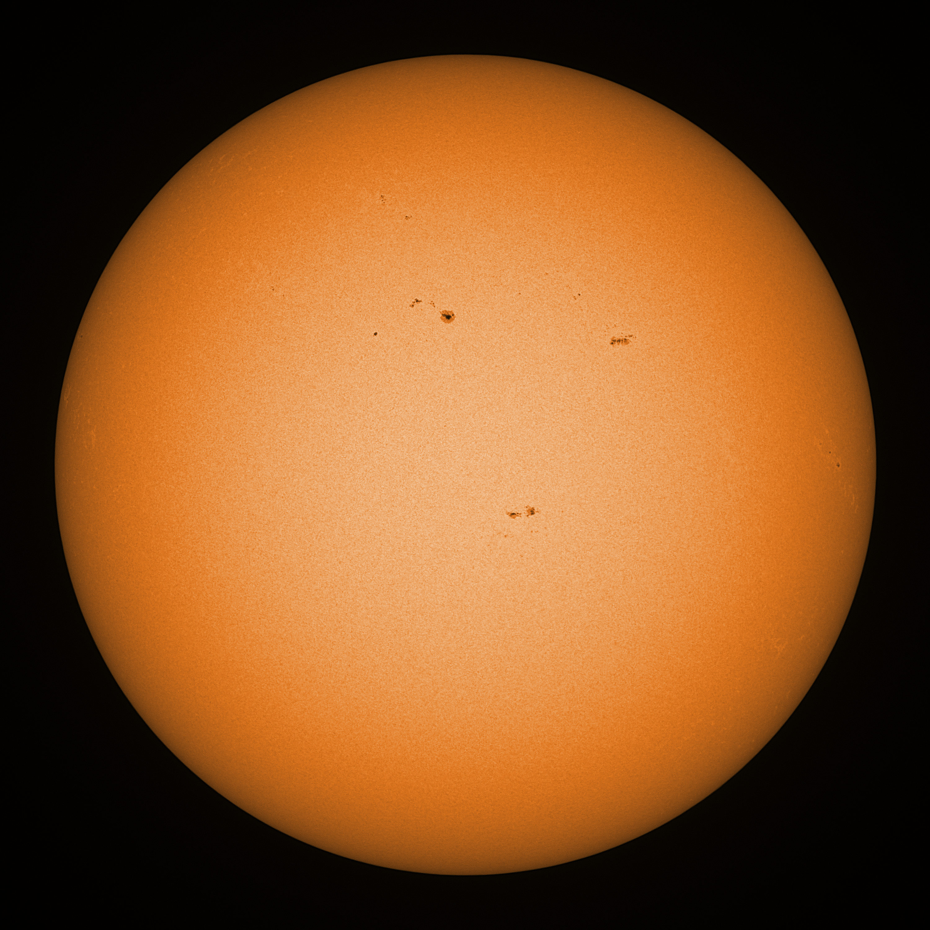 Observation date/time: 01 March 2025 11:34 UTC Telescope: GTT60 (Galileo Type Telescope) Focal length: 1490mm (plano convex singlet) Aperture: 60mm Stop: 30mm Eyepiece: -75mm (plano concave singlet, 24mm aperture) Observation type: projection (342mm distance, 80mm diameter) Reference: Earth's rotation axis Exposure (transparency): 0.480ms (using 82nm bandwidth green filter) Seeing (SSSMon): 4.0-6.5" (3.5" at best) =================================================================== Total number of sunspots: 20 | |