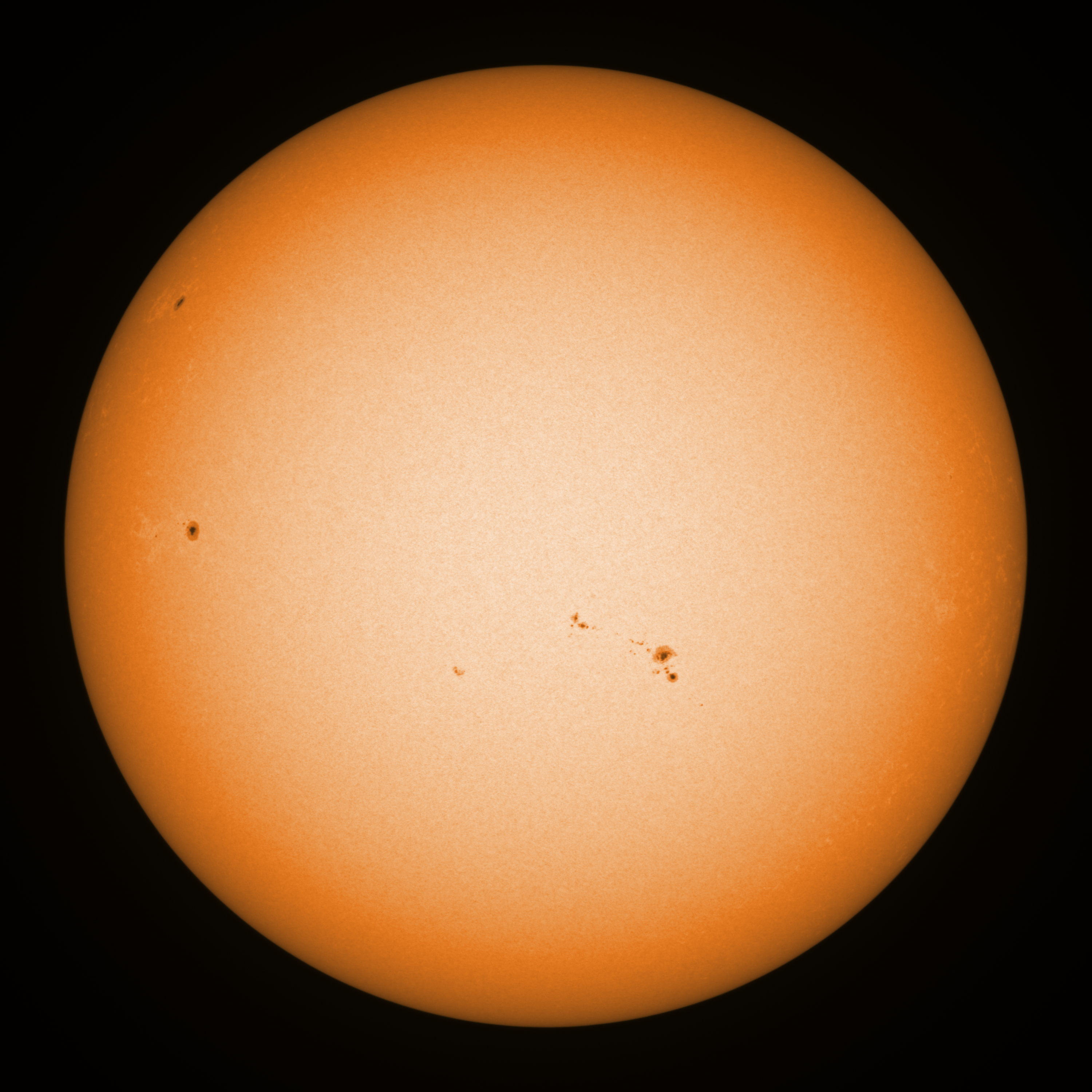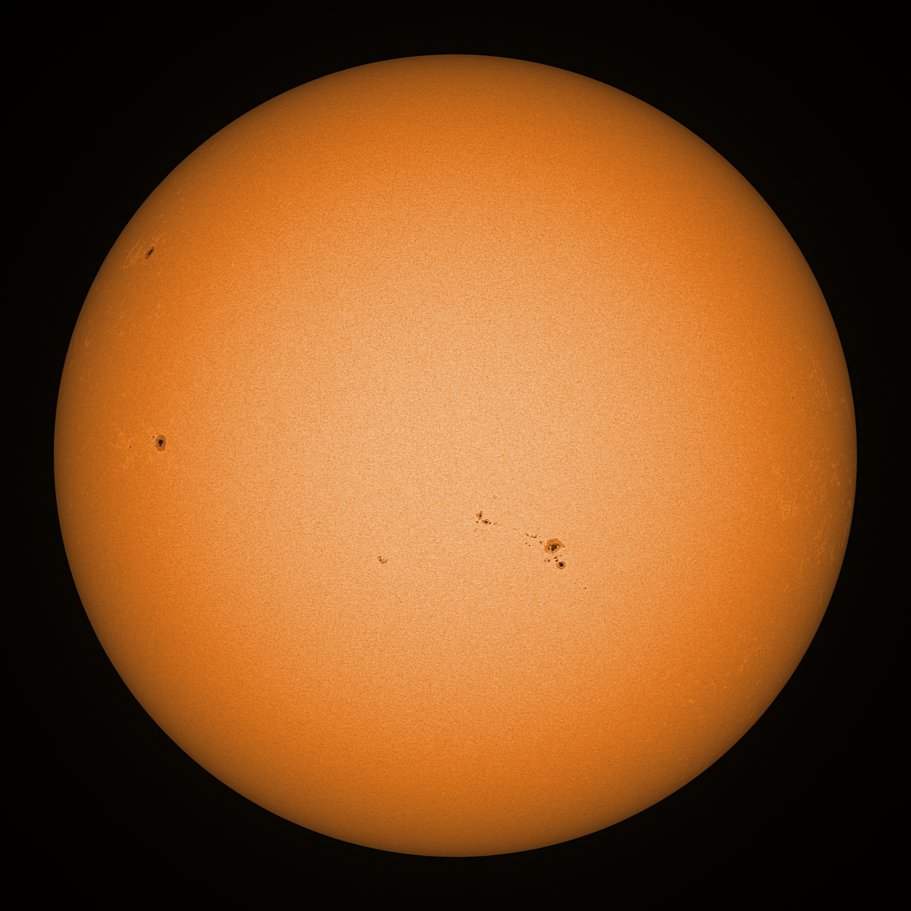 Observation date/time: 08 March 2025 09:22 UTC Telescope: GTT60 (Galileo Type Telescope) Focal length: 1490mm (plano convex singlet) Aperture: 60mm Stop: 30mm Eyepiece: -75mm (plano concave singlet, 24mm aperture) Observation type: projection (342mm distance, 80mm diameter) Reference: Earth's rotation axis Exposure (transparency): 0.530ms (using 82nm bandwidth green filter) Seeing (SSSMon): 3.5-4.5" (1.9" at best) =================================================================== Total number of sunspots: 19 | |