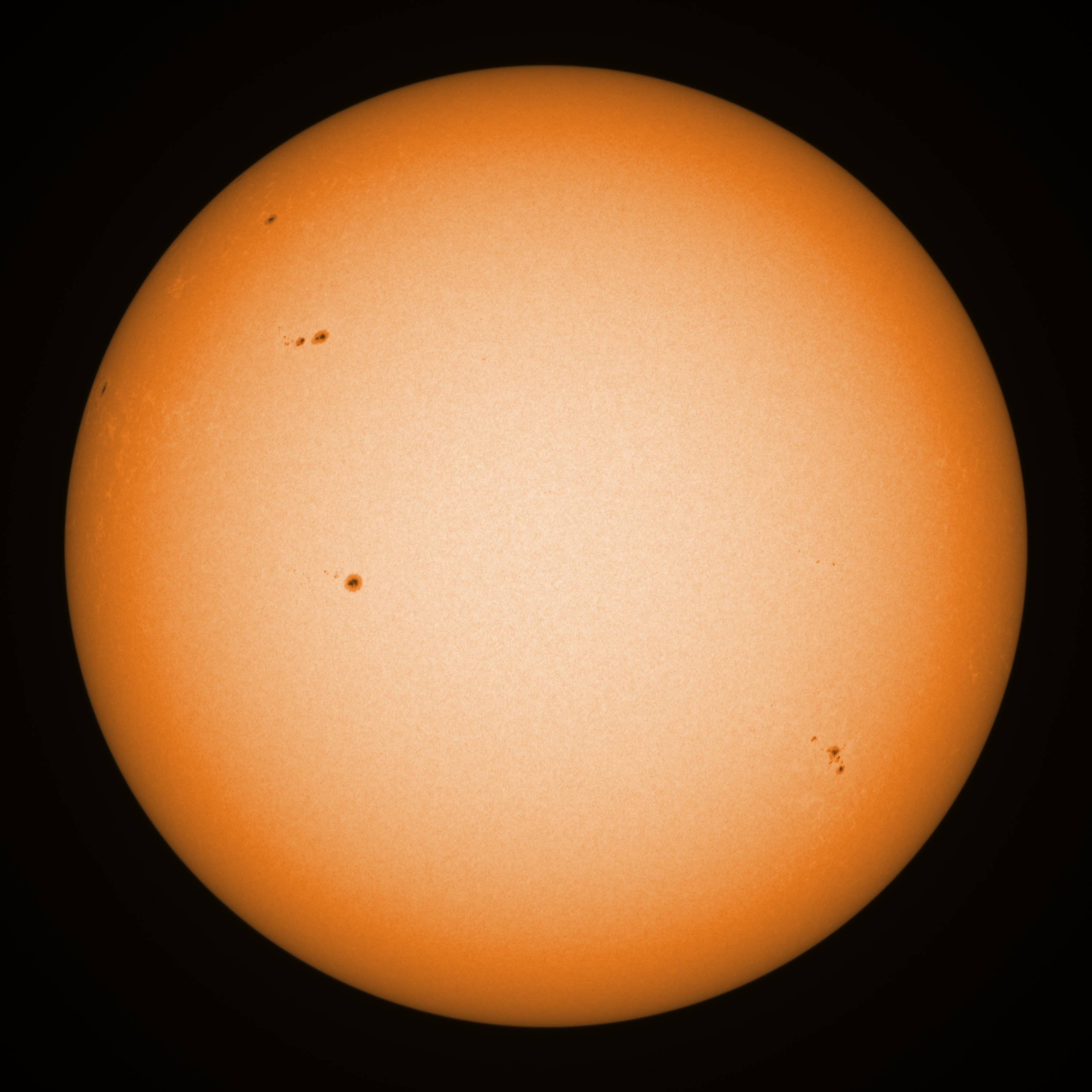 Observation date/time: 10 March 2025 10:12 UTC Telescope: GTT60 (Galileo Type Telescope) Focal length: 1490mm (plano convex singlet) Aperture: 60mm Stop: 30mm Eyepiece: -75mm (plano concave singlet, 24mm aperture) Observation type: projection (342mm distance, 80mm diameter) Reference: Earth's rotation axis Exposure (transparency): 0.630ms (using 82nm bandwidth green filter) Seeing (SSSMon): 5.0-5.5" (3.0" at best) =================================================================== Total number of sunspots: 15 | |