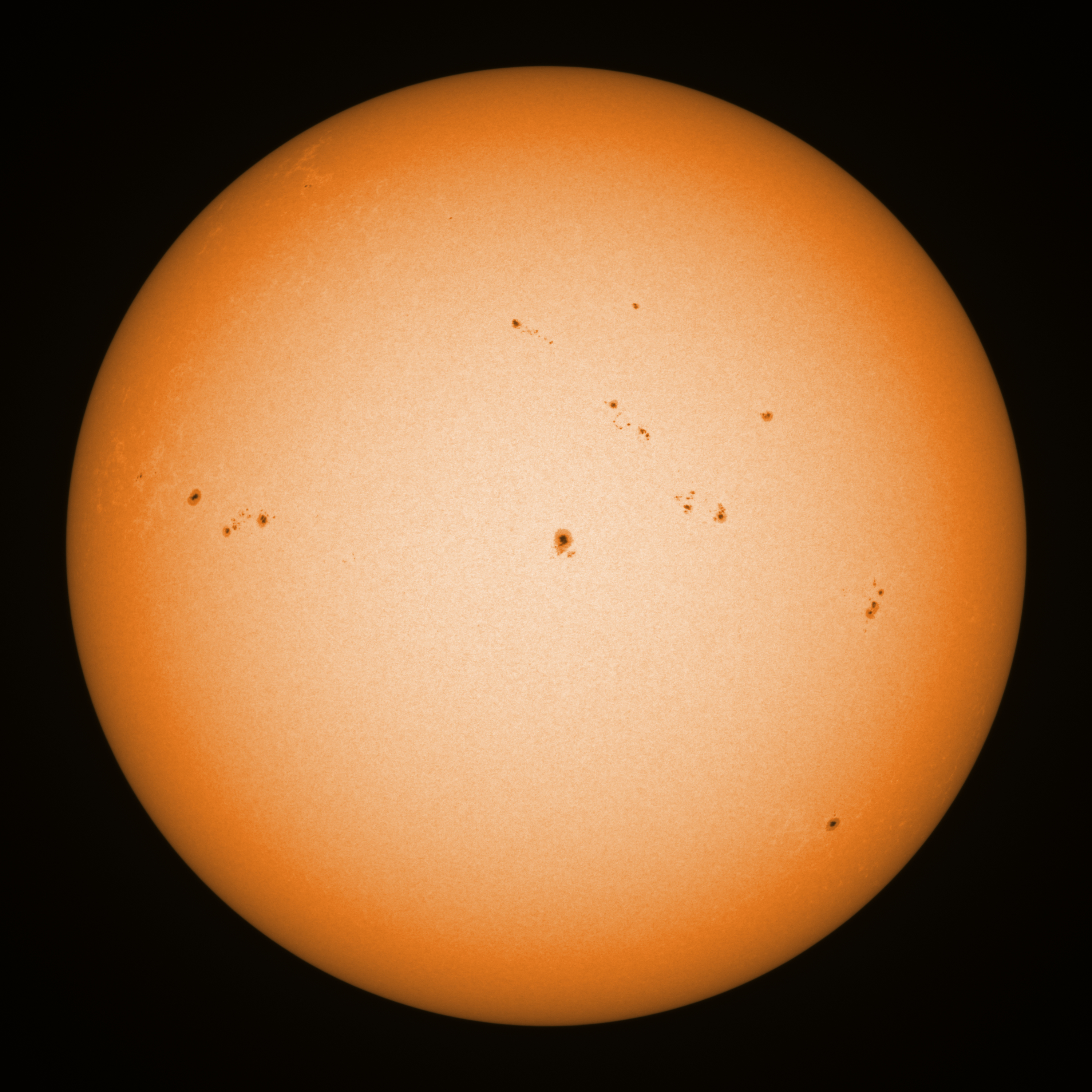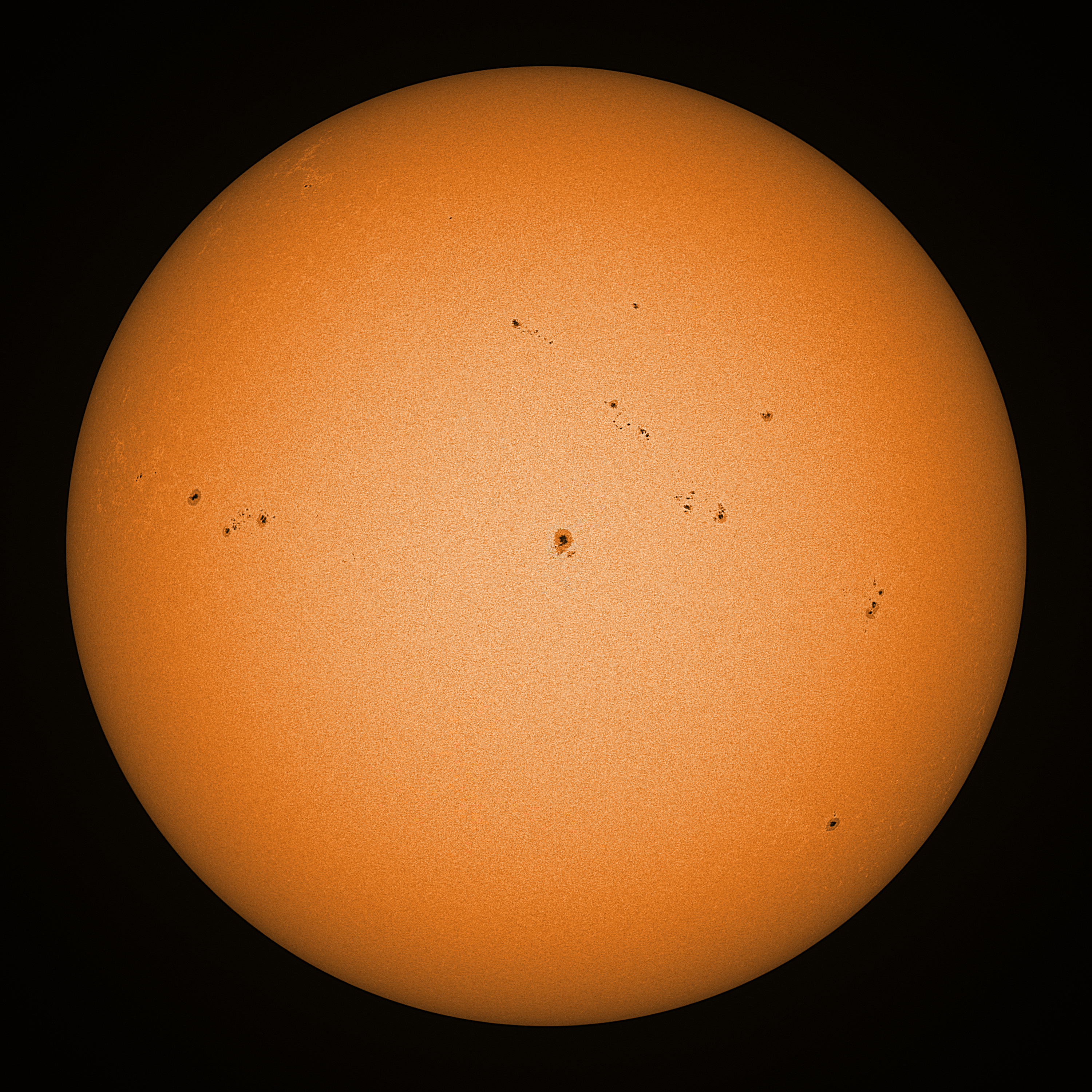Observation date/time: 16 March 2025 09:16 UTC Telescope: GTT60 (Galileo Type Telescope) Focal length: 1490mm (plano convex singlet) Aperture: 60mm Stop: 30mm Eyepiece: -75mm (plano concave singlet, 24mm aperture) Observation type: projection (342mm distance, 80mm diameter) Reference: Earth's rotation axis Exposure (transparency): 0.430ms (using 82nm bandwidth green filter) Seeing (SSSMon): 4.5-5.0" (2.5" at best) =================================================================== Total number of sunspots: 43 | |
