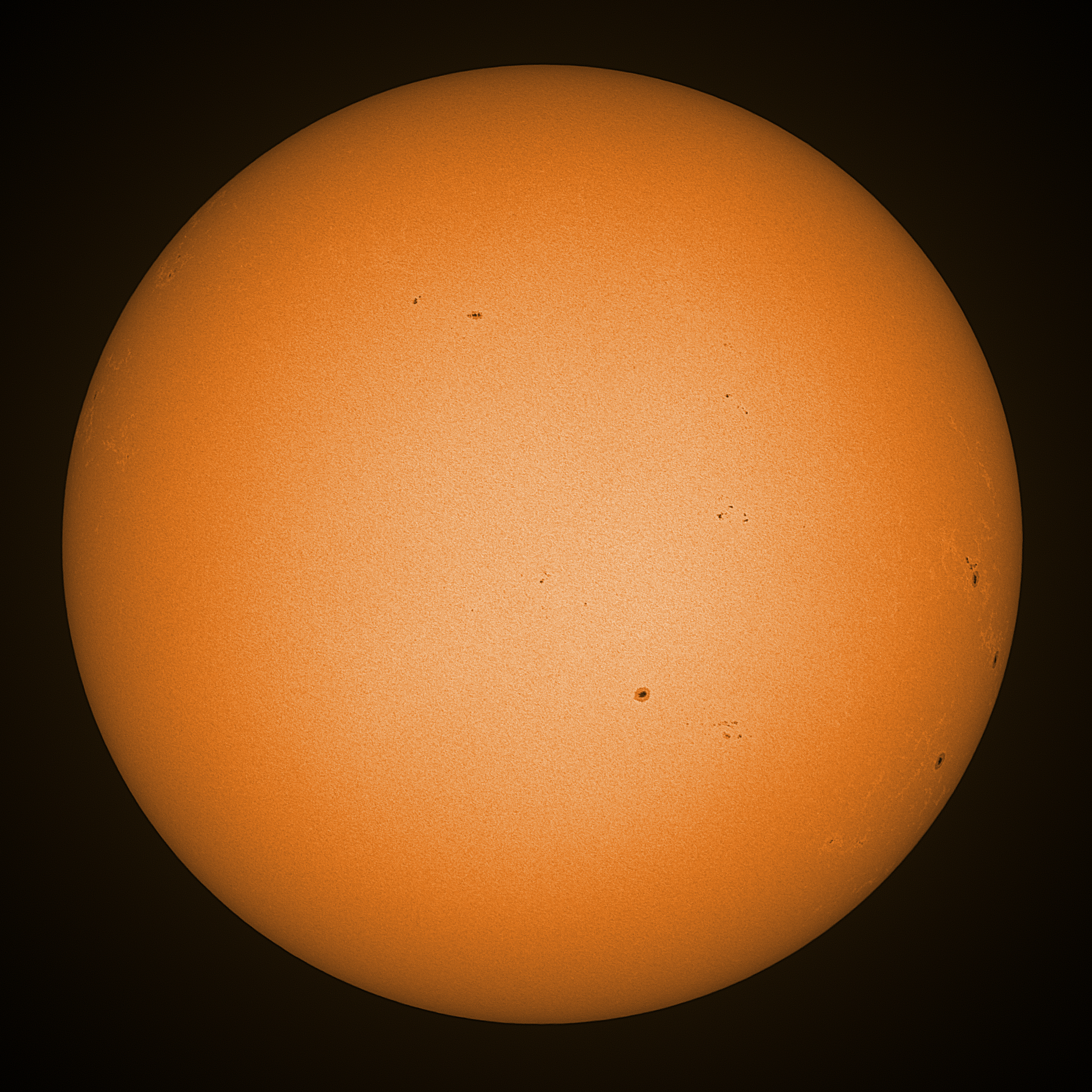 Observation date/time: 21 March 2025 15:07 UTC Telescope: GTT60 (Galileo Type Telescope) Focal length: 1490mm (plano convex singlet) Aperture: 60mm Stop: 30mm Eyepiece: -75mm (plano concave singlet, 24mm aperture) Observation type: projection (343mm distance, 80mm diameter) Reference: Earth's rotation axis Exposure (transparency): 1.530ms (using 82nm bandwidth green filter) Seeing (SSSMon): 1.7-2.0" (1.1" at best) =================================================================== Total number of sunspots: 21 | |
