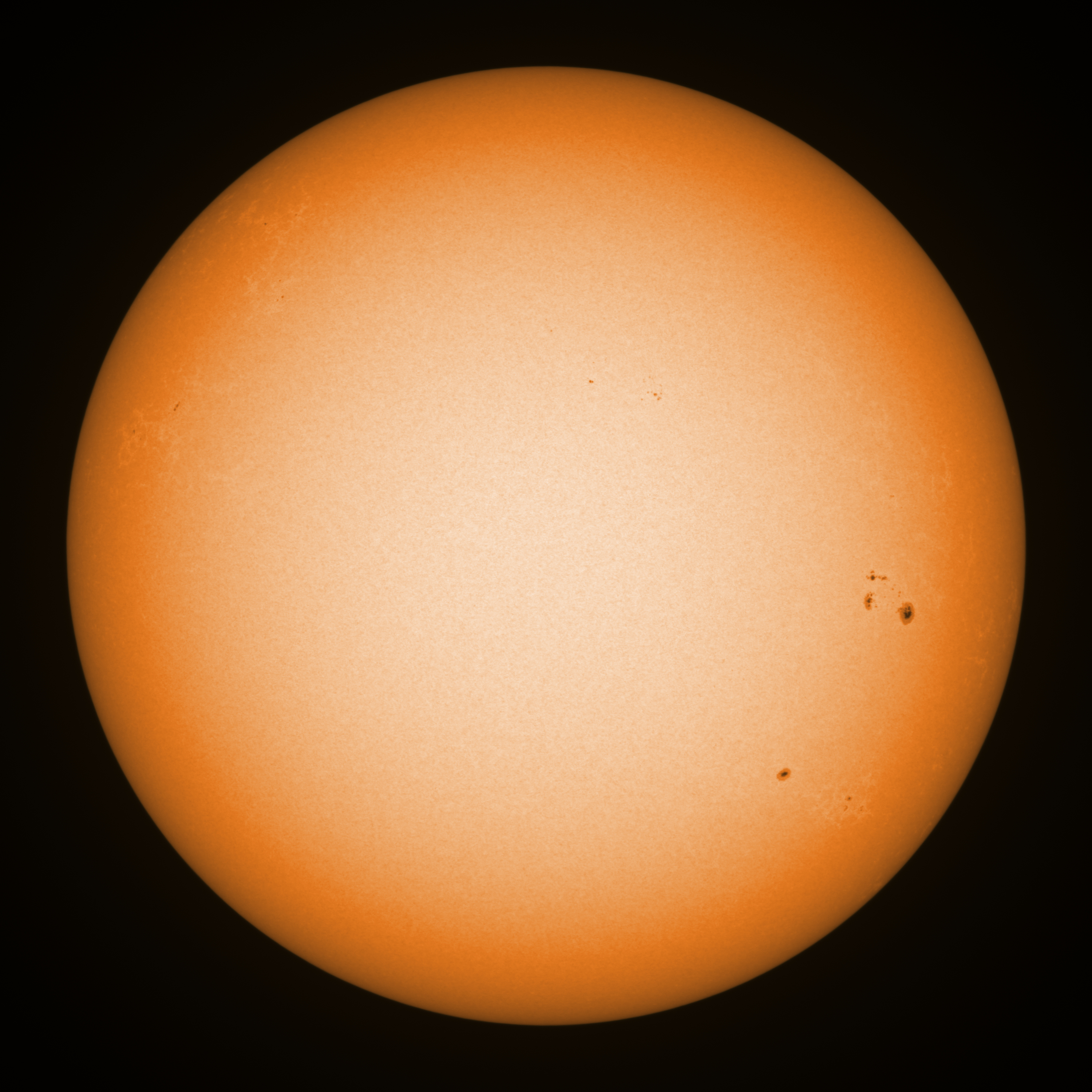 Observation date/time: 23 March 2025 09:47 UTC Telescope: GTT60 (Galileo Type Telescope) Focal length: 1490mm (plano convex singlet) Aperture: 60mm Stop: 30mm Eyepiece: -75mm (plano concave singlet, 24mm aperture) Observation type: projection (343mm distance, 80mm diameter) Reference: Earth's rotation axis Exposure (transparency): 0.480ms (using 82nm bandwidth green filter) Seeing (SSSMon): 2.5-3.0" (1.4" at best) =================================================================== Total number of sunspots: 23 | |