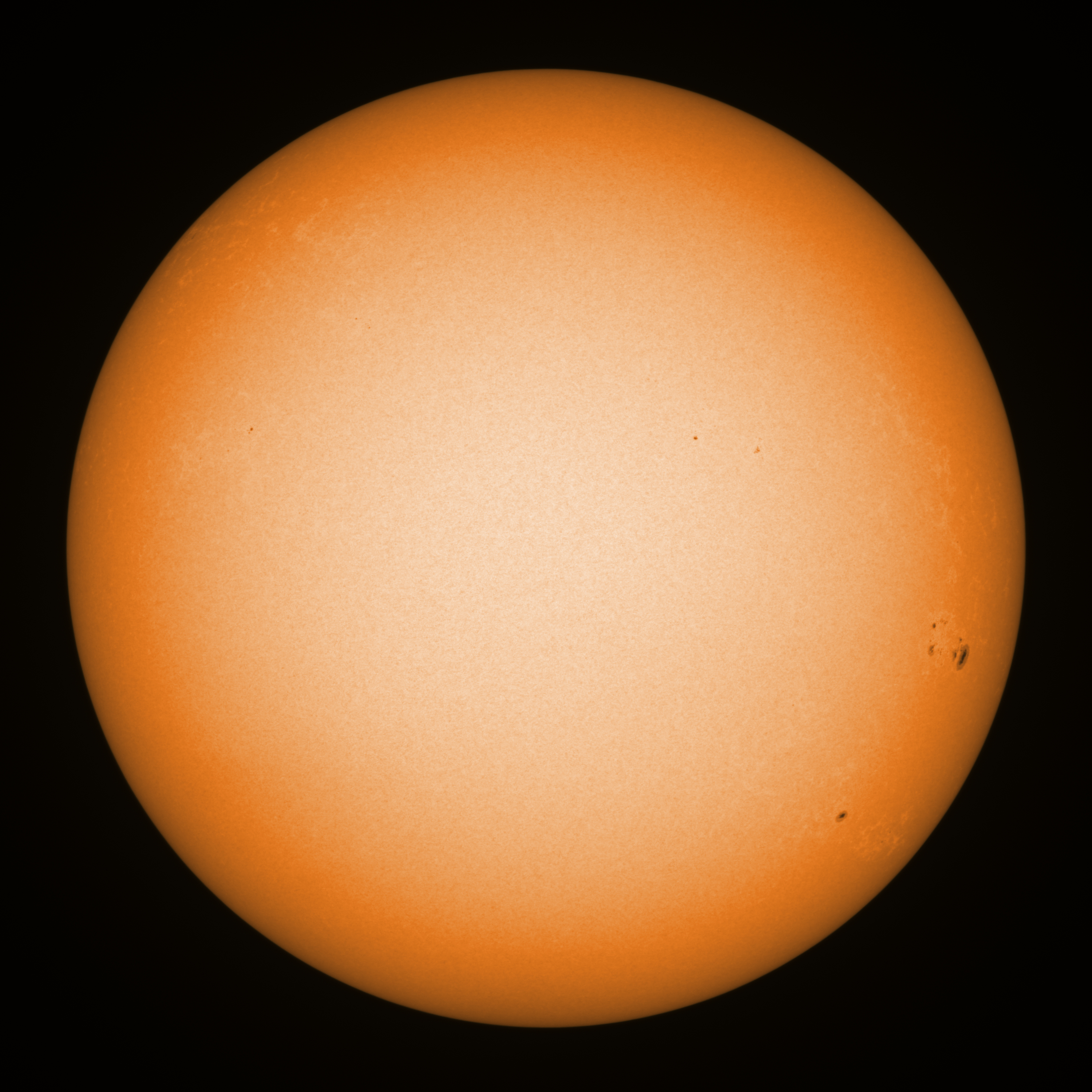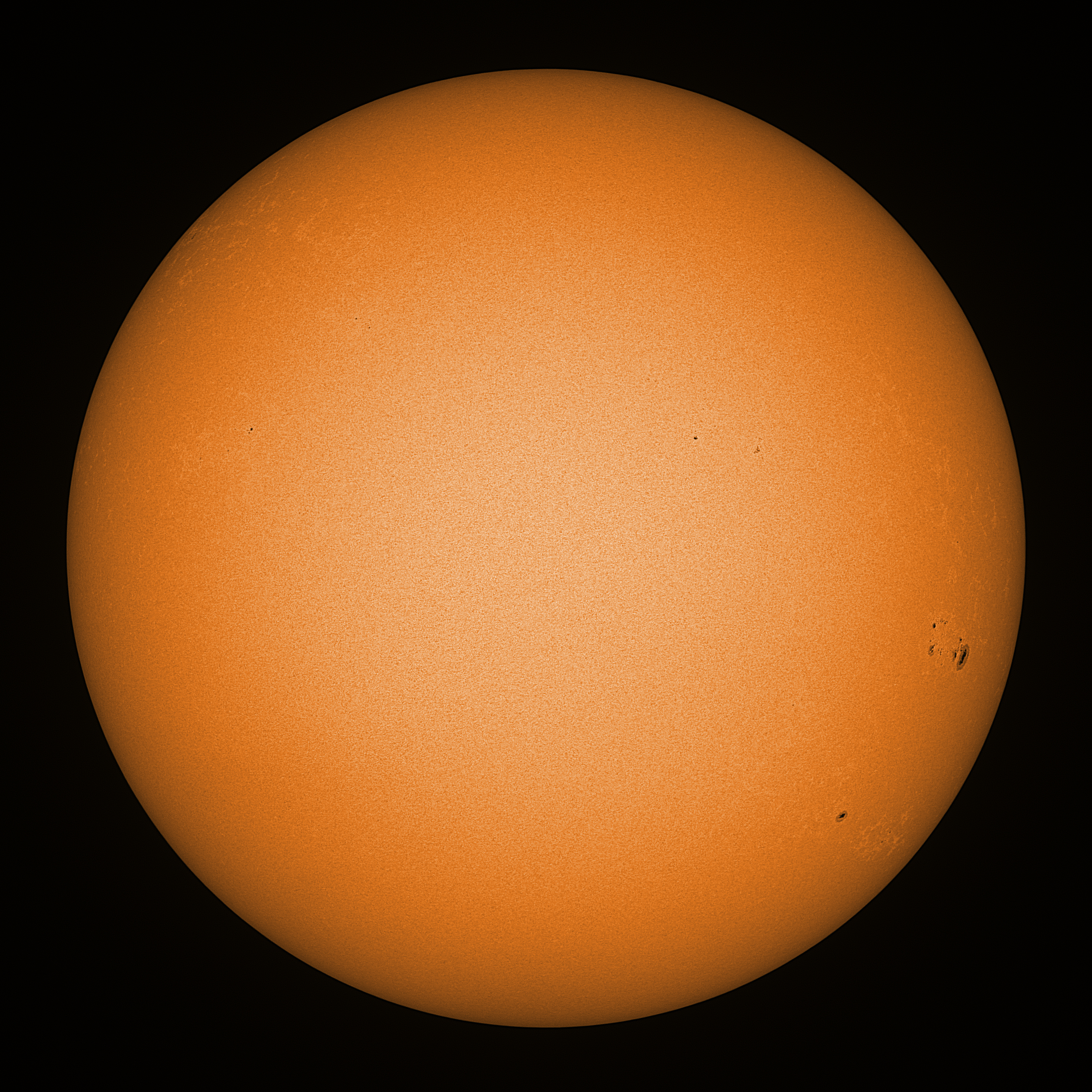 Observation date/time: 24 March 2025 10:31 UTC Telescope: GTT60 (Galileo Type Telescope) Focal length: 1490mm (plano convex singlet) Aperture: 60mm Stop: 30mm Eyepiece: -75mm (plano concave singlet, 24mm aperture) Observation type: projection (343mm distance, 80mm diameter) Reference: Earth's rotation axis Exposure (transparency): 0.680ms (using 82nm bandwidth green filter) Seeing (SSSMon): 5.0-5.5" (3.5" at best) =================================================================== Total number of sunspots: 11 | |