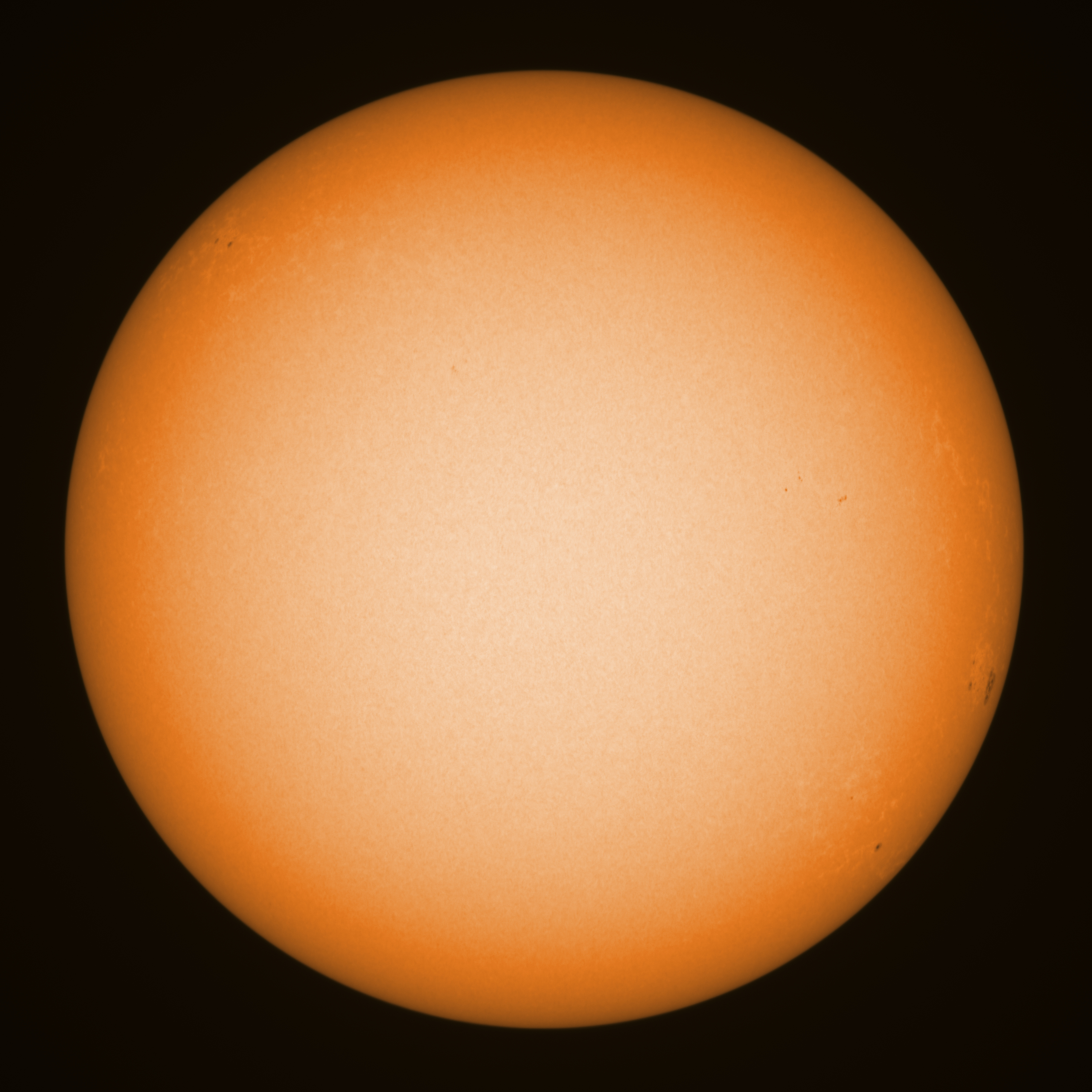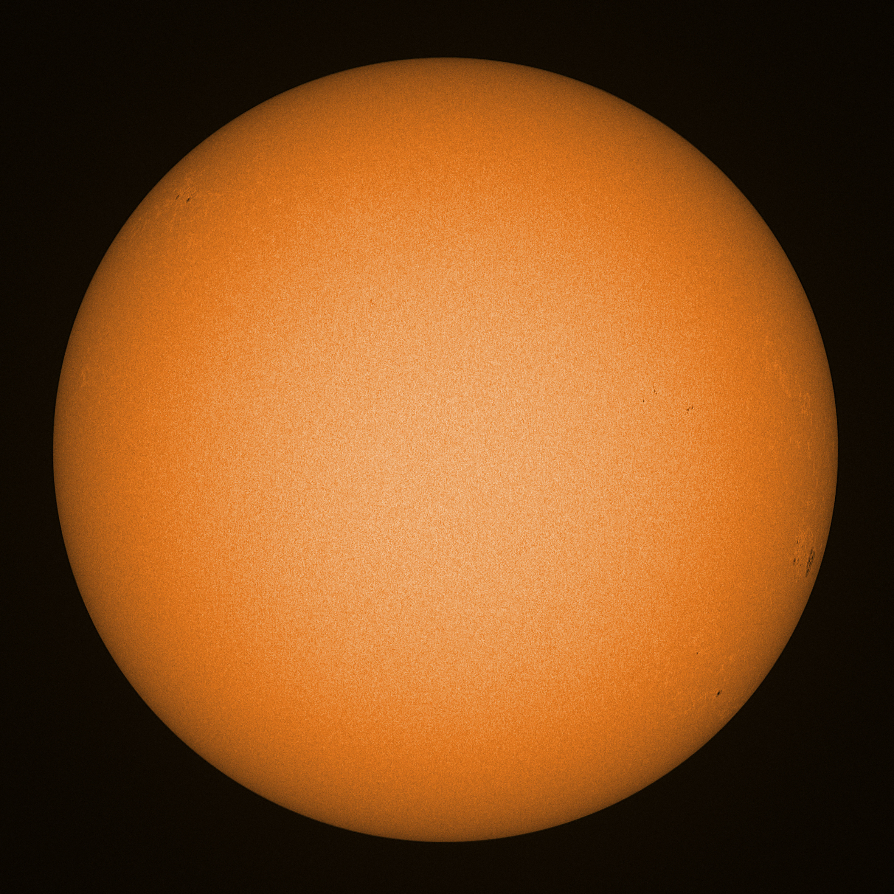 Observation date/time: 25 March 2025 10:15 UTC Telescope: GTT60 (Galileo Type Telescope) Focal length: 1490mm (plano convex singlet) Aperture: 60mm Stop: 30mm Eyepiece: -75mm (plano concave singlet, 24mm aperture) Observation type: projection (343mm distance, 80mm diameter) Reference: Earth's rotation axis Exposure (transparency): 0.930ms (using 82nm bandwidth green filter) Seeing (SSSMon): not measured, but good =================================================================== Total number of sunspots: 8 | |