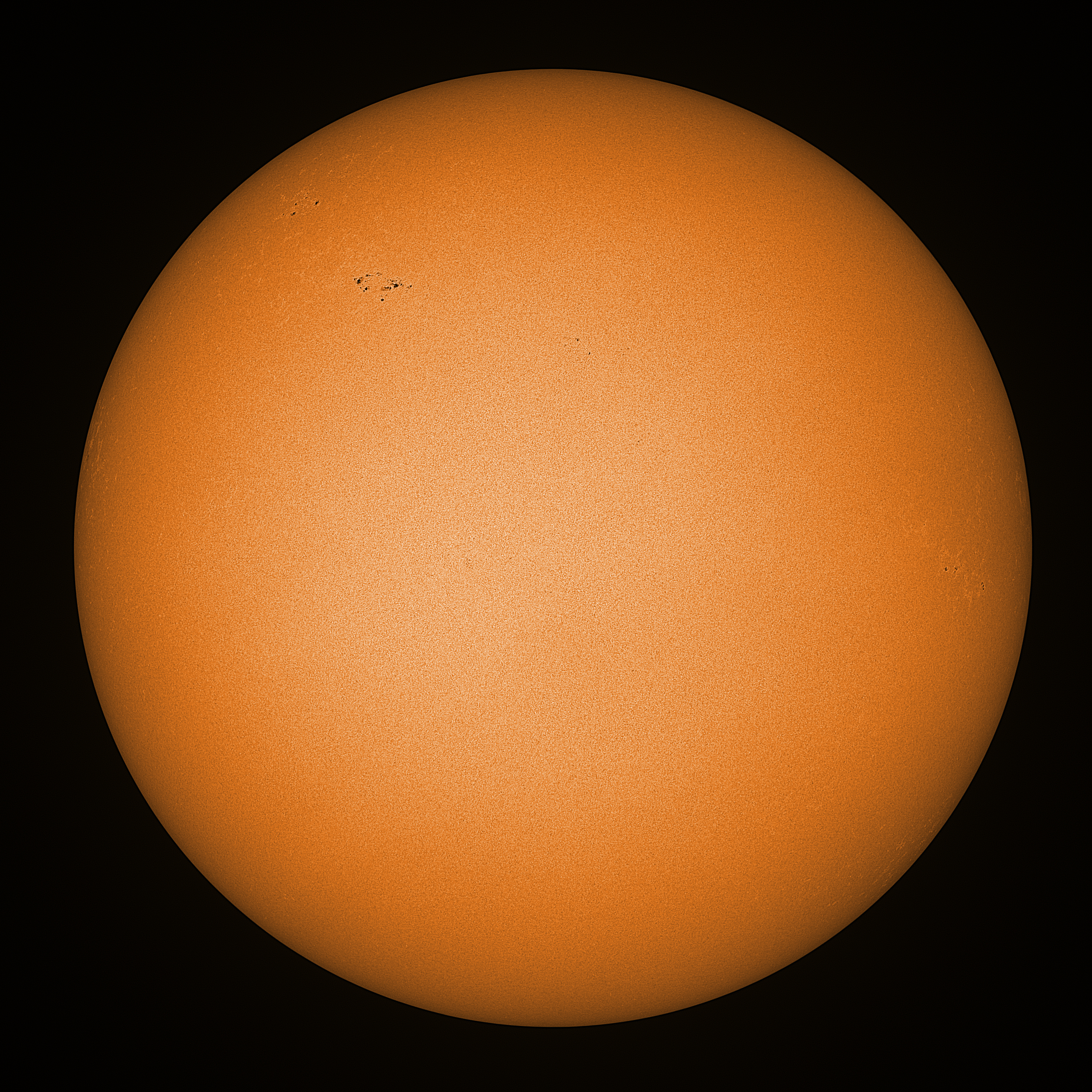 Observation date/time: 27 March 2025 11:03 UTC Telescope: GTT60 (Galileo Type Telescope) Focal length: 1490mm (plano convex singlet) Aperture: 60mm Stop: 30mm Eyepiece: -75mm (plano concave singlet, 24mm aperture) Observation type: projection (343mm distance, 80mm diameter) Reference: Earth's rotation axis Exposure (transparency): 0.530ms (using 82nm bandwidth green filter) Seeing (SSSMon): 2.5-2.7" (1.8" at best) =================================================================== Total number of sunspots: 15 | |