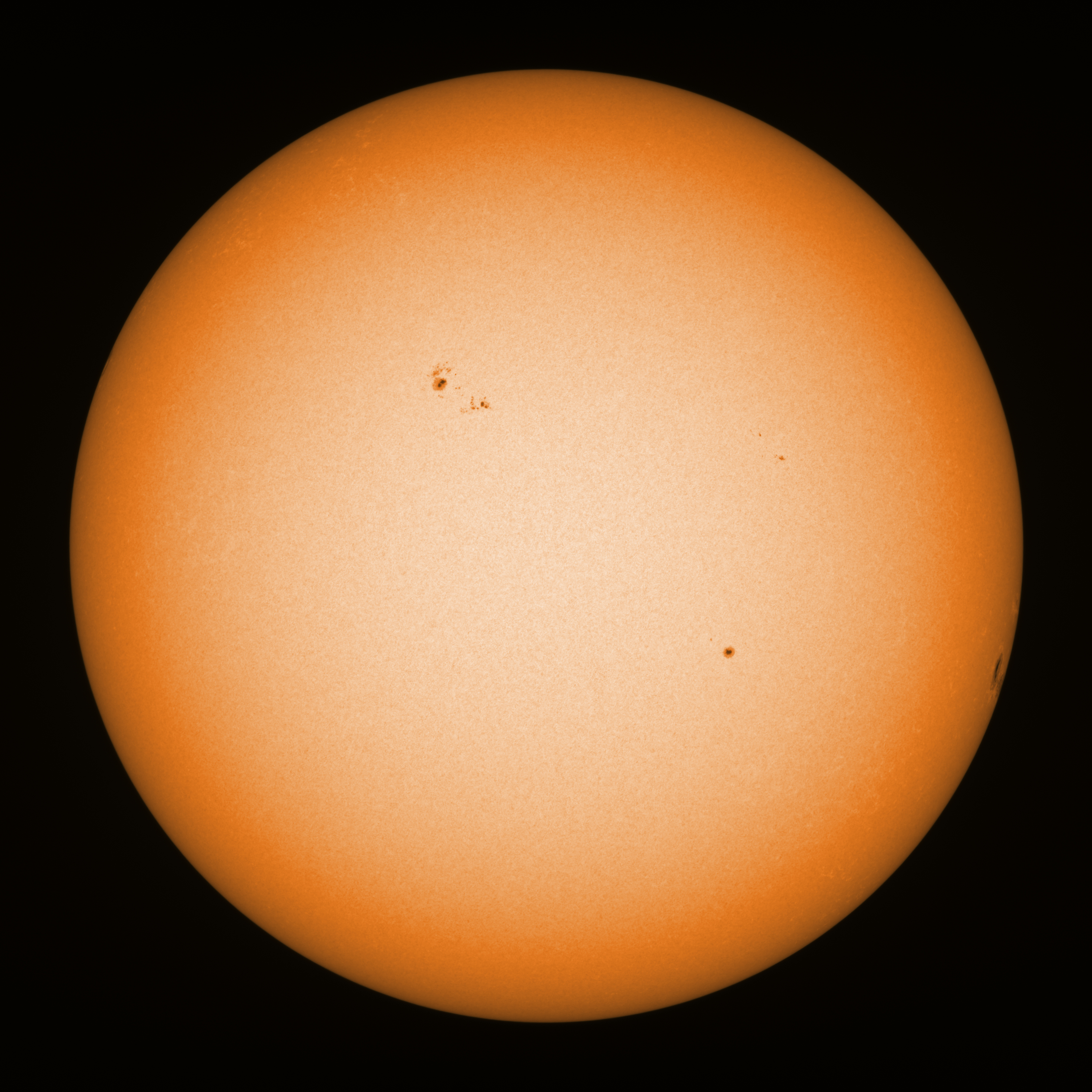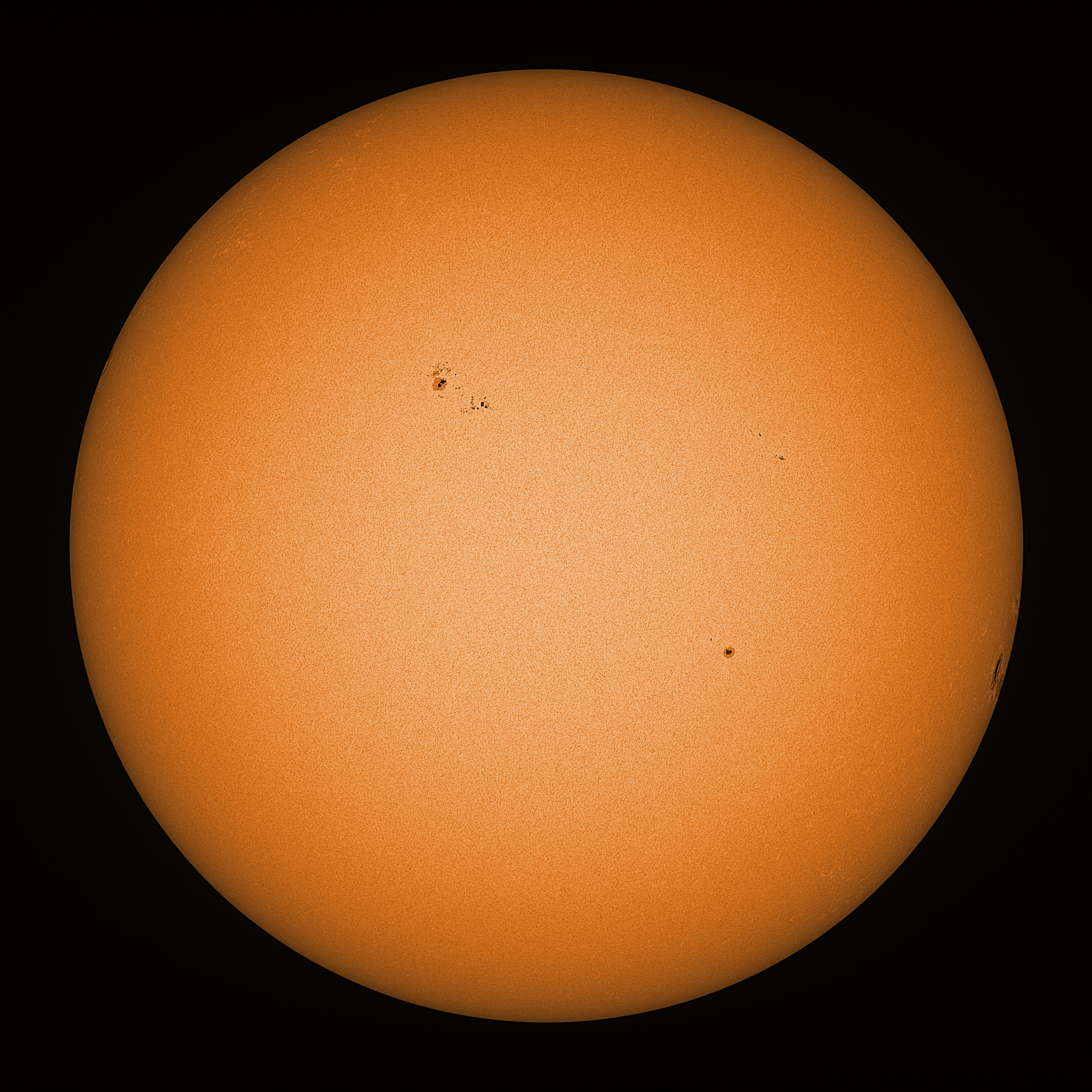 Observation date/time: 14 April 2025 09:41 UTC Telescope: GTT60 (Galileo Type Telescope) Focal length: 1490mm (plano convex singlet) Aperture: 60mm Stop: 30mm Eyepiece: -75mm (plano concave singlet, 24mm aperture) Observation type: projection (343mm distance, 80mm diameter) Reference: Earth's rotation axis Exposure (transparency): 0.380ms (using 82nm bandwidth green filter) Seeing (SSSMon): 3.0-3.5" (2.5" at best) =================================================================== Total number of sunspots: 18 | |