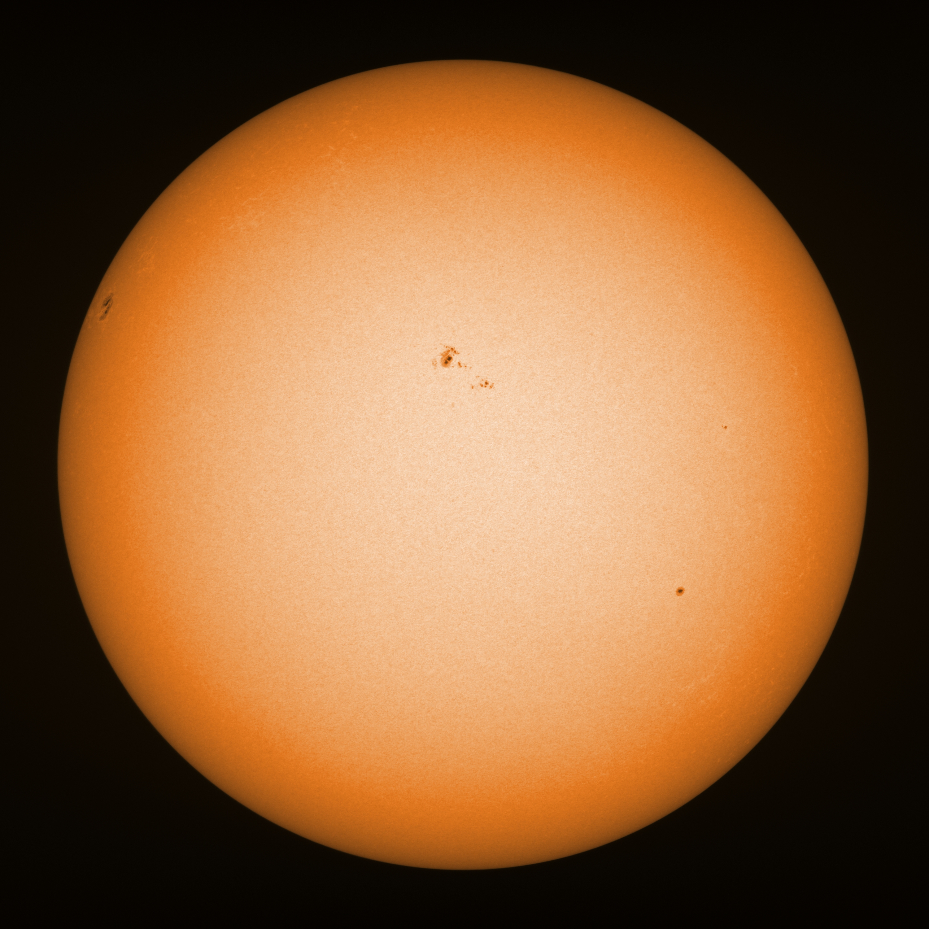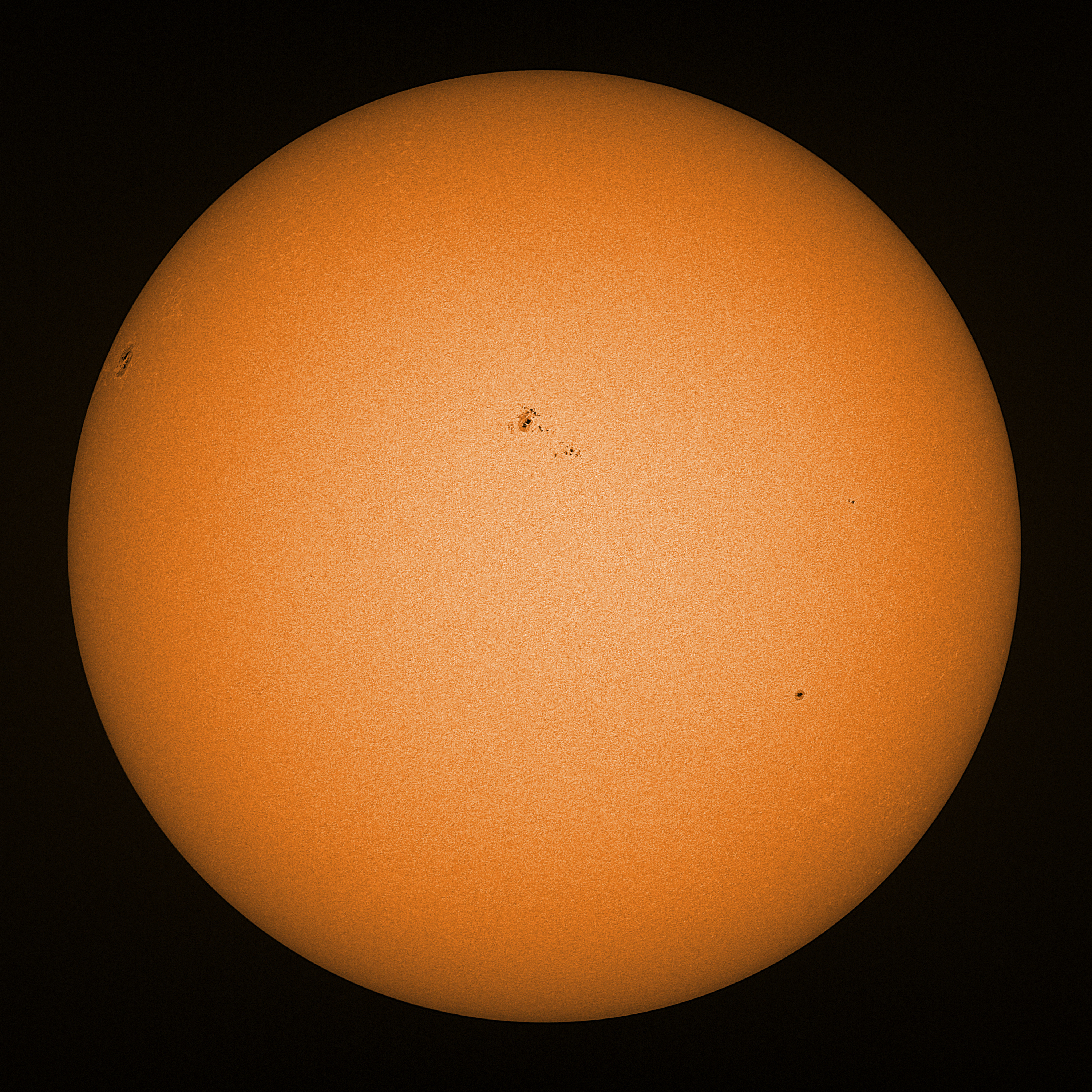 Observation date/time: 15 April 2025 07:48 UTC Telescope: GTT60 (Galileo Type Telescope) Focal length: 1490mm (plano convex singlet) Aperture: 60mm Stop: 30mm Eyepiece: -75mm (plano concave singlet, 24mm aperture) Observation type: projection (343mm distance, 80mm diameter) Reference: Earth's rotation axis Exposure (transparency): 0.630ms (using 82nm bandwidth green filter) Seeing (SSSMon): 2.0-2.5" (1.2" at best) =================================================================== Total number of sunspots: 18 | |