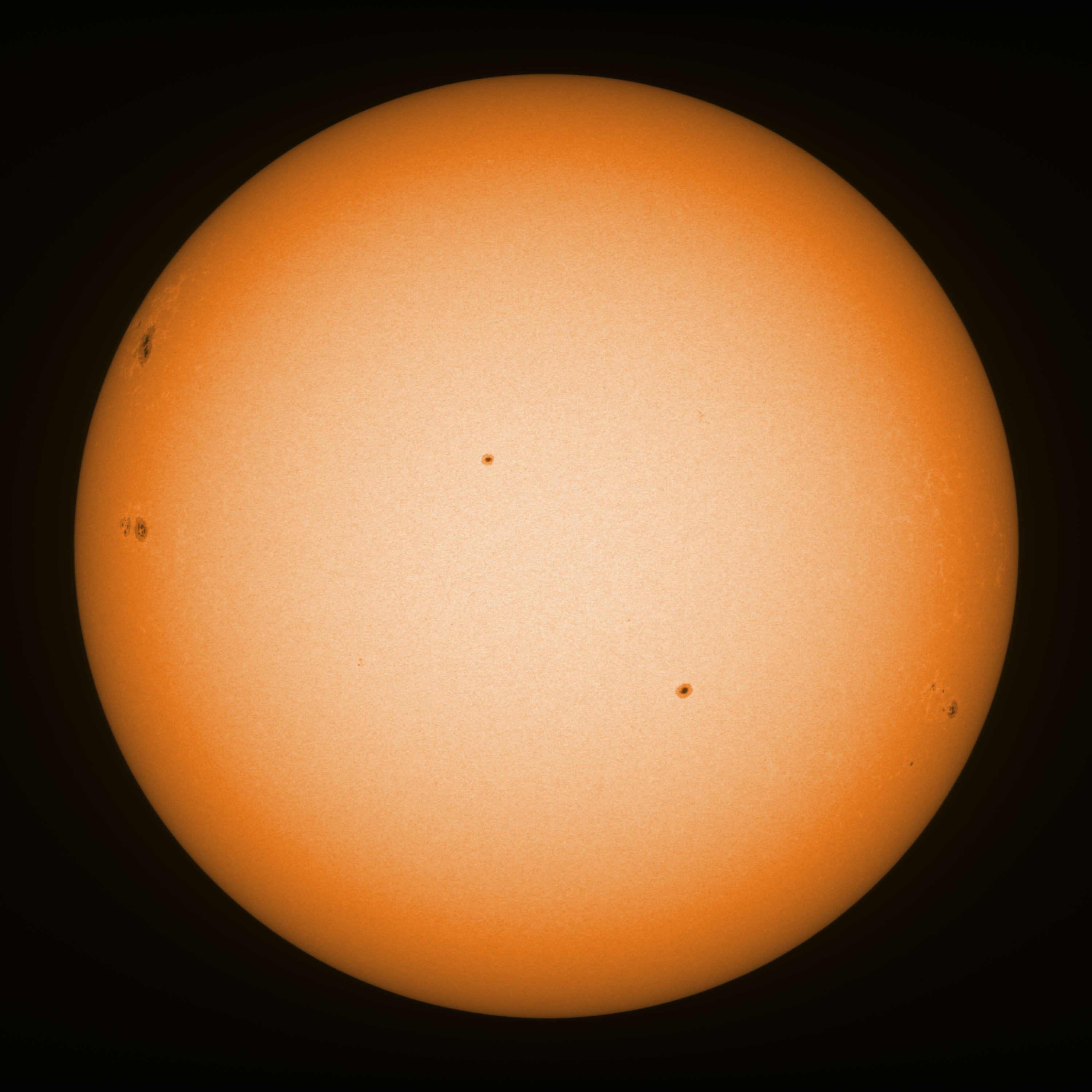Observation date/time: 26 May 2025 15:01 UTC Telescope: GTT60 (Galileo Type Telescope) Focal length: 1490mm (plano convex singlet) Aperture: 60mm Stop: 30mm Eyepiece: -75mm (plano concave singlet, 24mm aperture) Observation type: projection (348mm distance, 80mm diameter) Reference: Earth's rotation axis Exposure (transparency): 0.480ms (using 82nm bandwidth green filter) Seeing (SSSMon): 2.3-2.5" (1.6" at best) =================================================================== Total number of sunspots: 13 | |