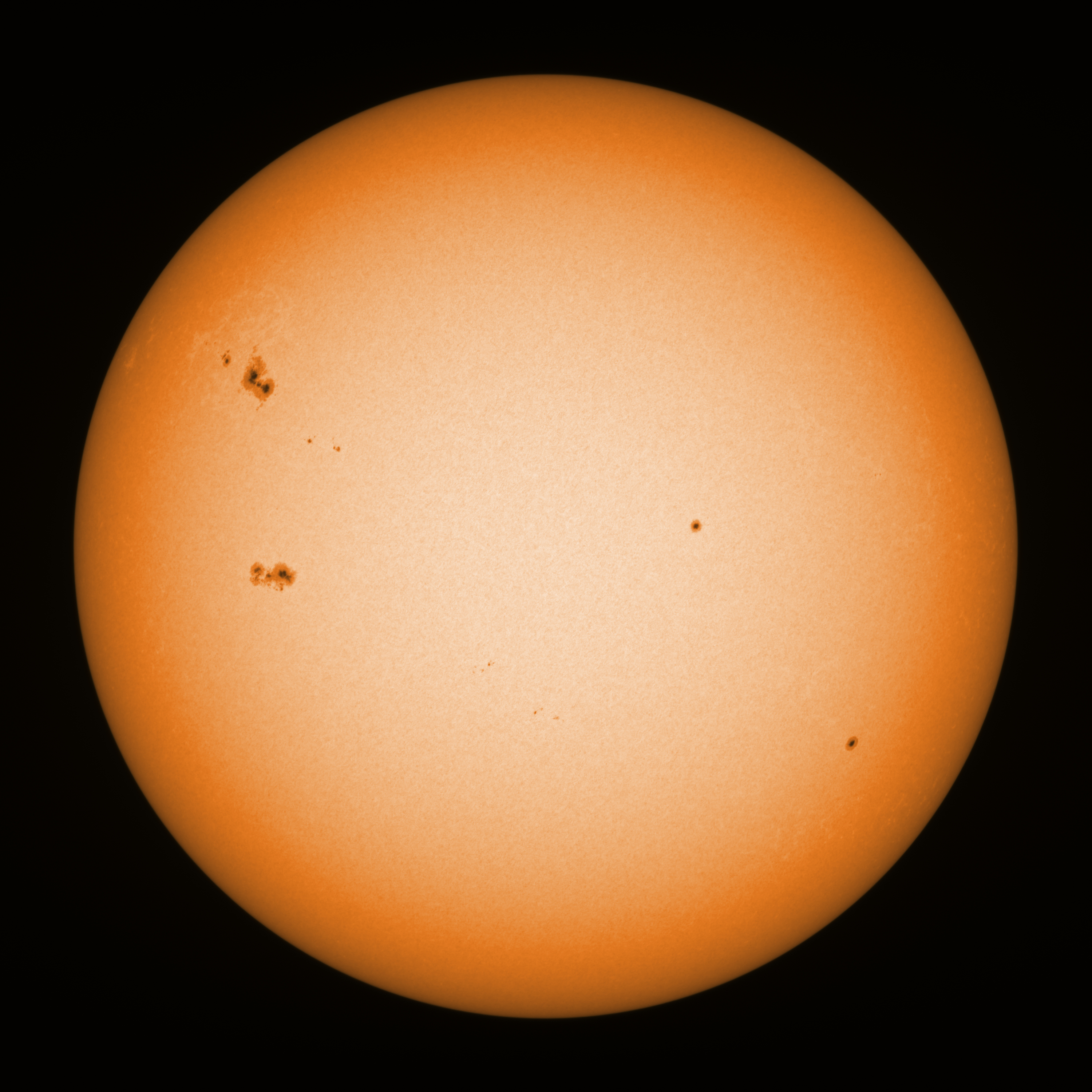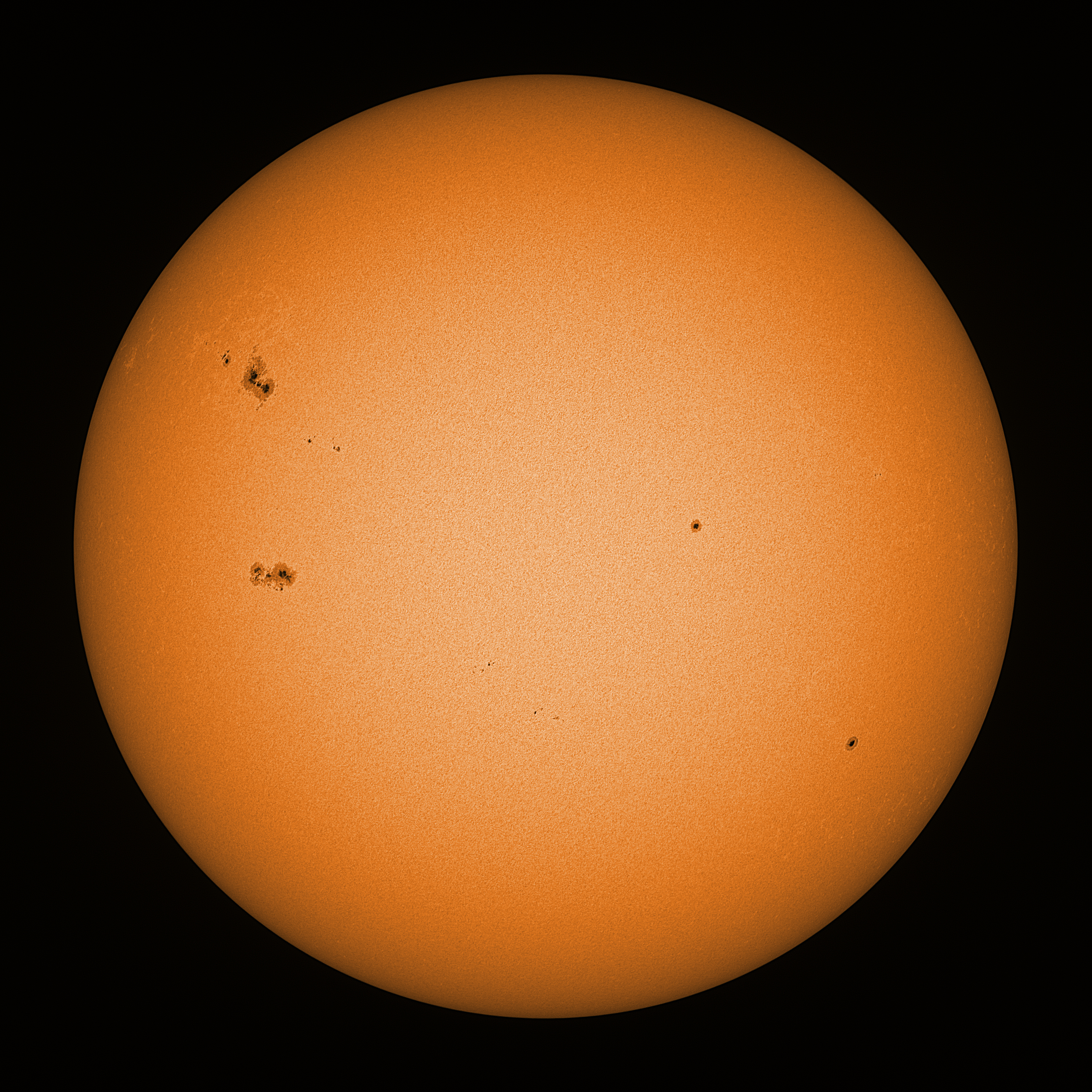 Observation date/time: 28 May 2025 15:56 UTC Telescope: GTT60 (Galileo Type Telescope) Focal length: 1490mm (plano convex singlet) Aperture: 60mm Stop: 30mm Eyepiece: -75mm (plano concave singlet, 24mm aperture) Observation type: projection (348mm distance, 80mm diameter) Reference: Earth's rotation axis Exposure (transparency): 0.380ms (using 82nm bandwidth green filter) Seeing (SSSMon): 4.5-5.0" (3.0" at best) =================================================================== Total number of sunspots: 21 | |
