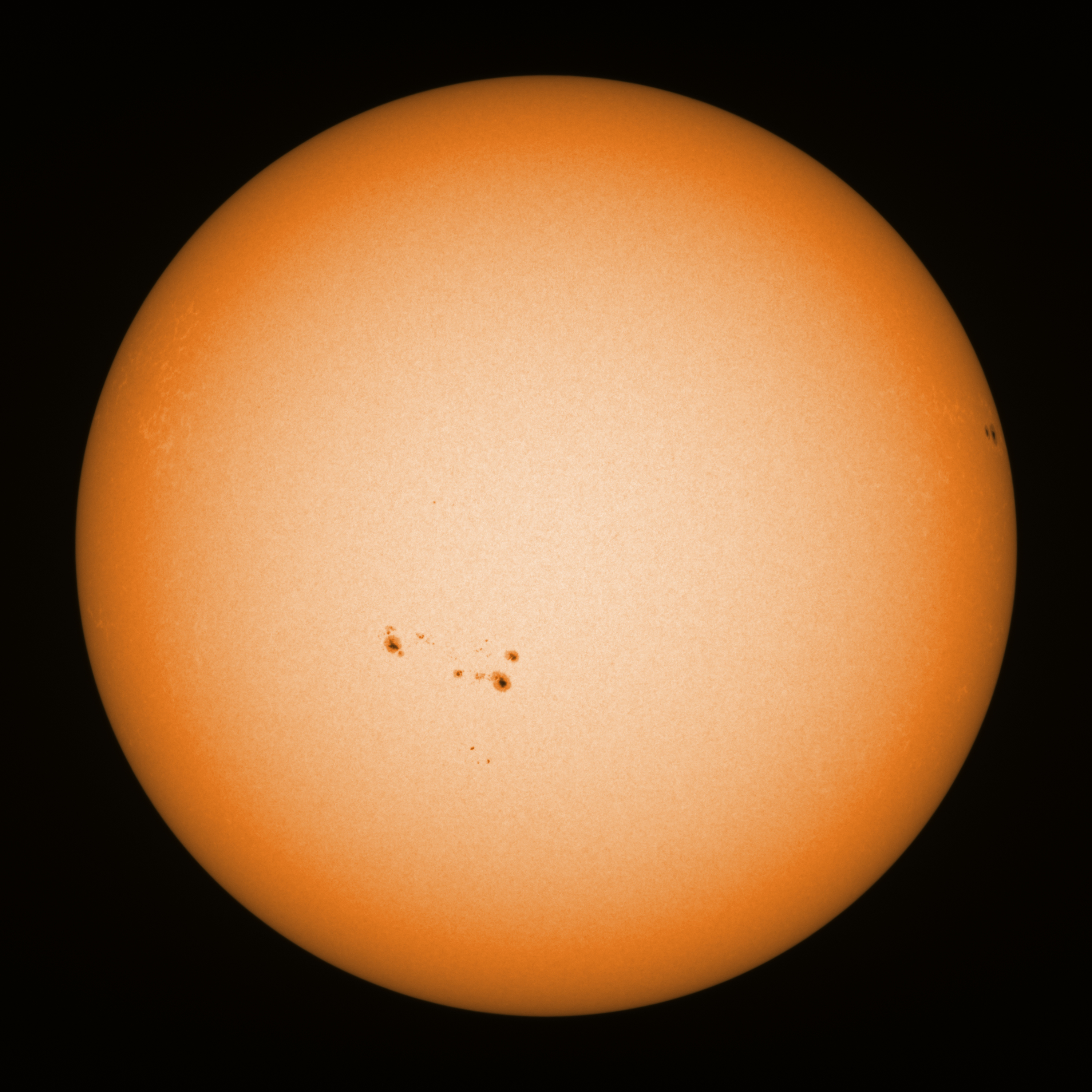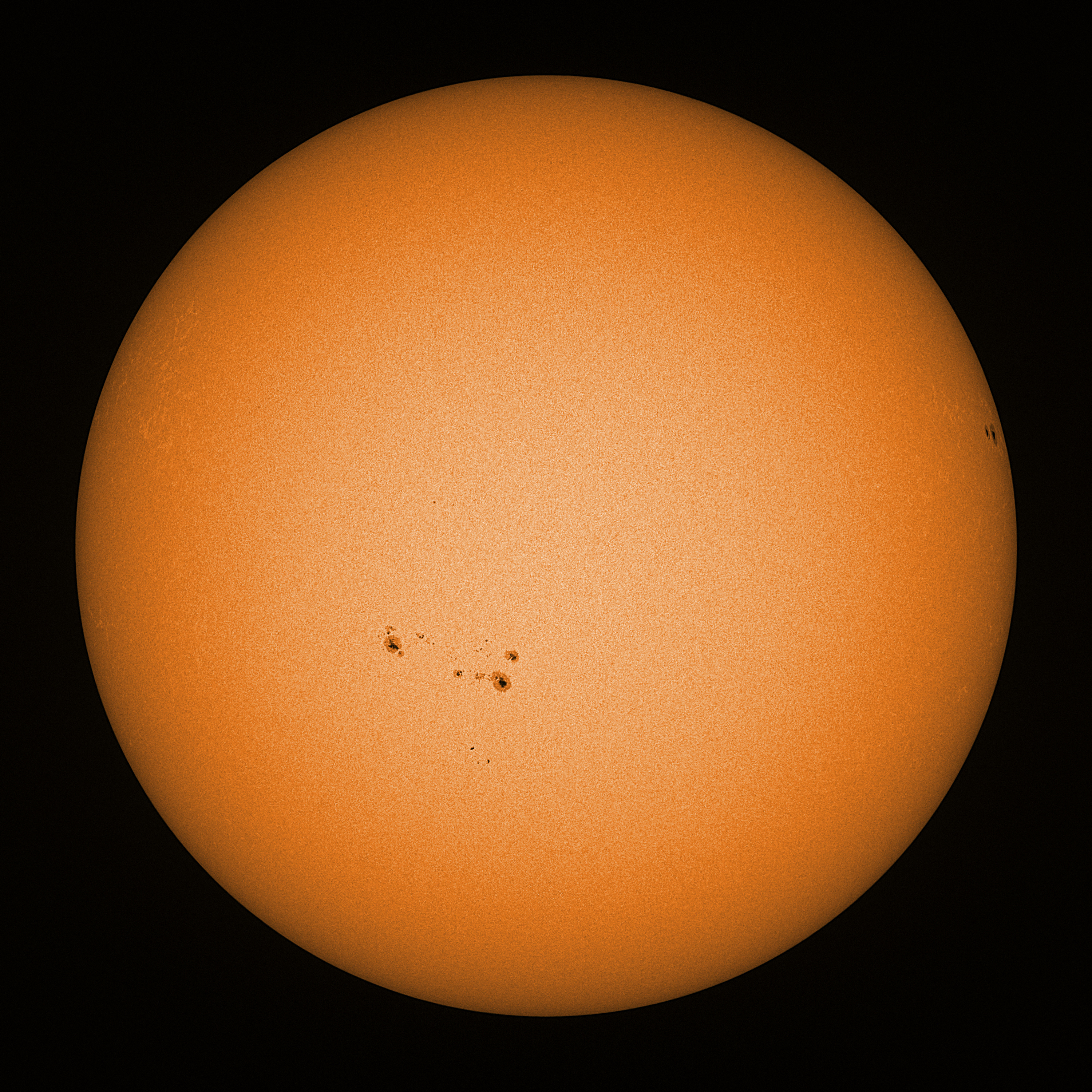 Observation date/time: 23 June 2025 10:02 UTC Telescope: GTT60 (Galileo Type Telescope) Focal length: 1490mm (plano convex singlet) Aperture: 60mm Stop: 30mm Eyepiece: -75mm (plano concave singlet, 24mm aperture) Observation type: projection (348mm distance, 80mm diameter) Reference: Earth's rotation axis Exposure (transparency): 0.380ms (using 82nm bandwidth green filter) Seeing (SSSMon): 3.5-4.5" (3.0" at best) =================================================================== Total number of sunspots: 20 | |