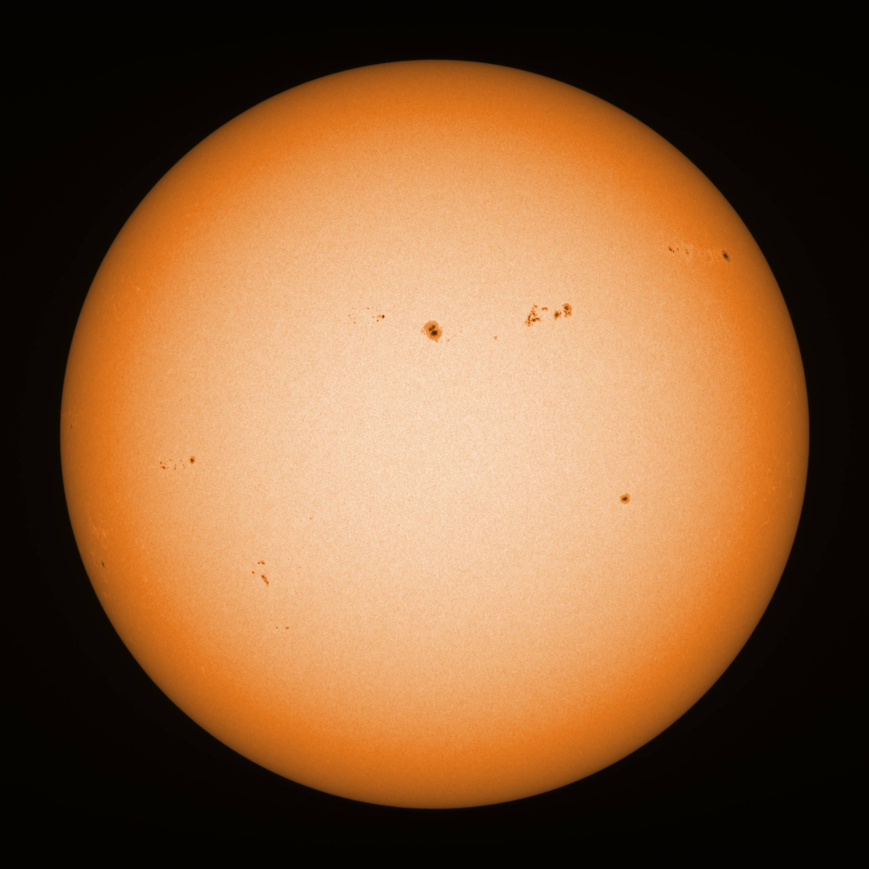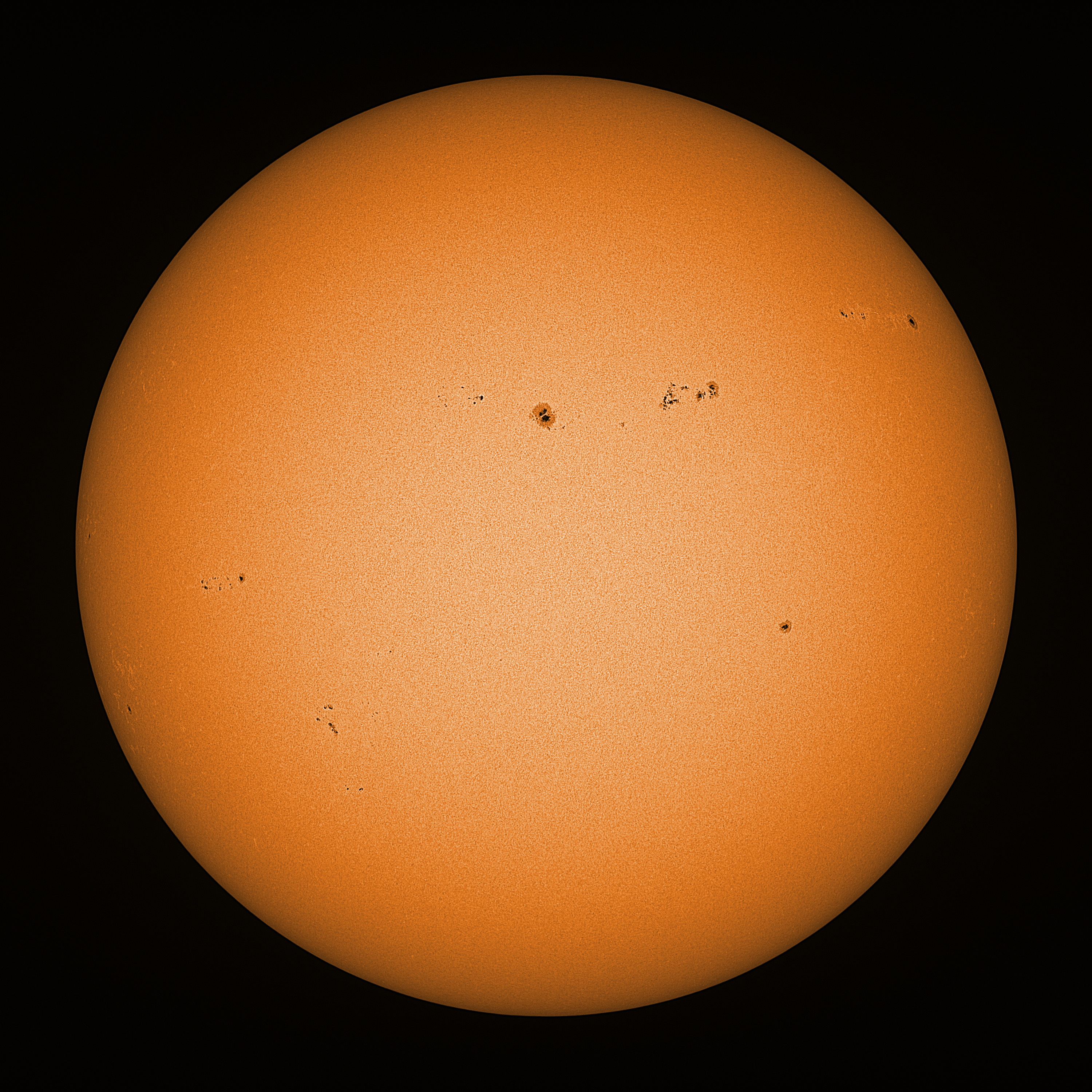 Observation date/time: 15 July 2025 08:31 UTC Telescope: GTT60 (Galileo Type Telescope) Focal length: 1490mm (plano convex singlet) Aperture: 60mm Stop: 30mm Eyepiece: -75mm (plano concave singlet, 24mm aperture) Observation type: projection (348mm distance, 80mm diameter) Reference: Earth's rotation axis Exposure (transparency): 0.380ms (using 82nm bandwidth green filter) Seeing (SSSMon): 4.0-4.5" (2.5" at best) =================================================================== Total number of sunspots: 45 | |