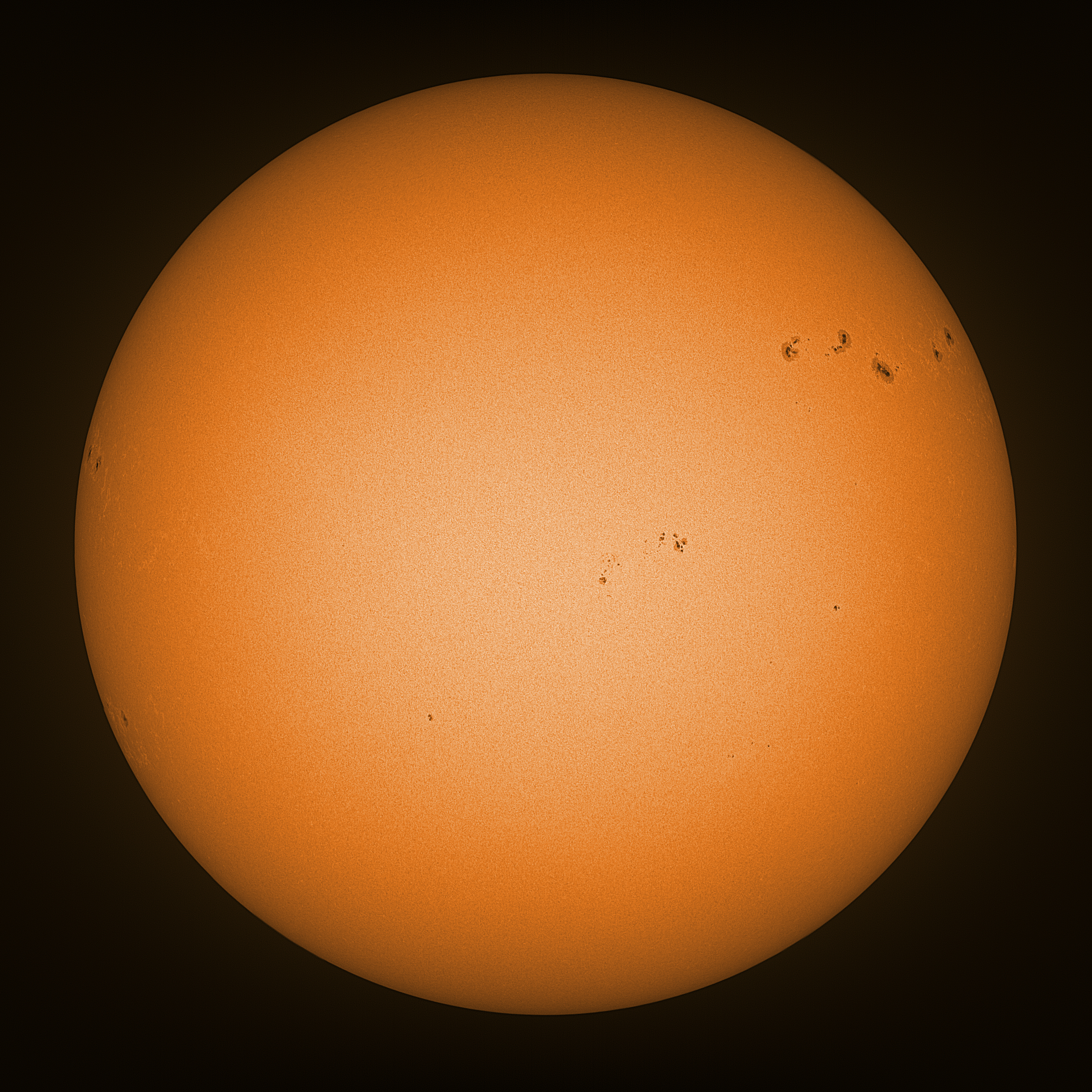 Observation date/time: 19 July 2025 09:16 UTC Telescope: GTT60 (Galileo Type Telescope) Focal length: 1490mm (plano convex singlet) Aperture: 60mm Stop: 30mm Eyepiece: -75mm (plano concave singlet, 24mm aperture) Observation type: projection (350mm distance, 80mm diameter) Reference: Earth's rotation axis Exposure (transparency): 0.830ms (using 82nm bandwidth green filter) Seeing (SSSMon): 4.0-5.0" (2.0" at best) =================================================================== Total number of sunspots: 30 | |