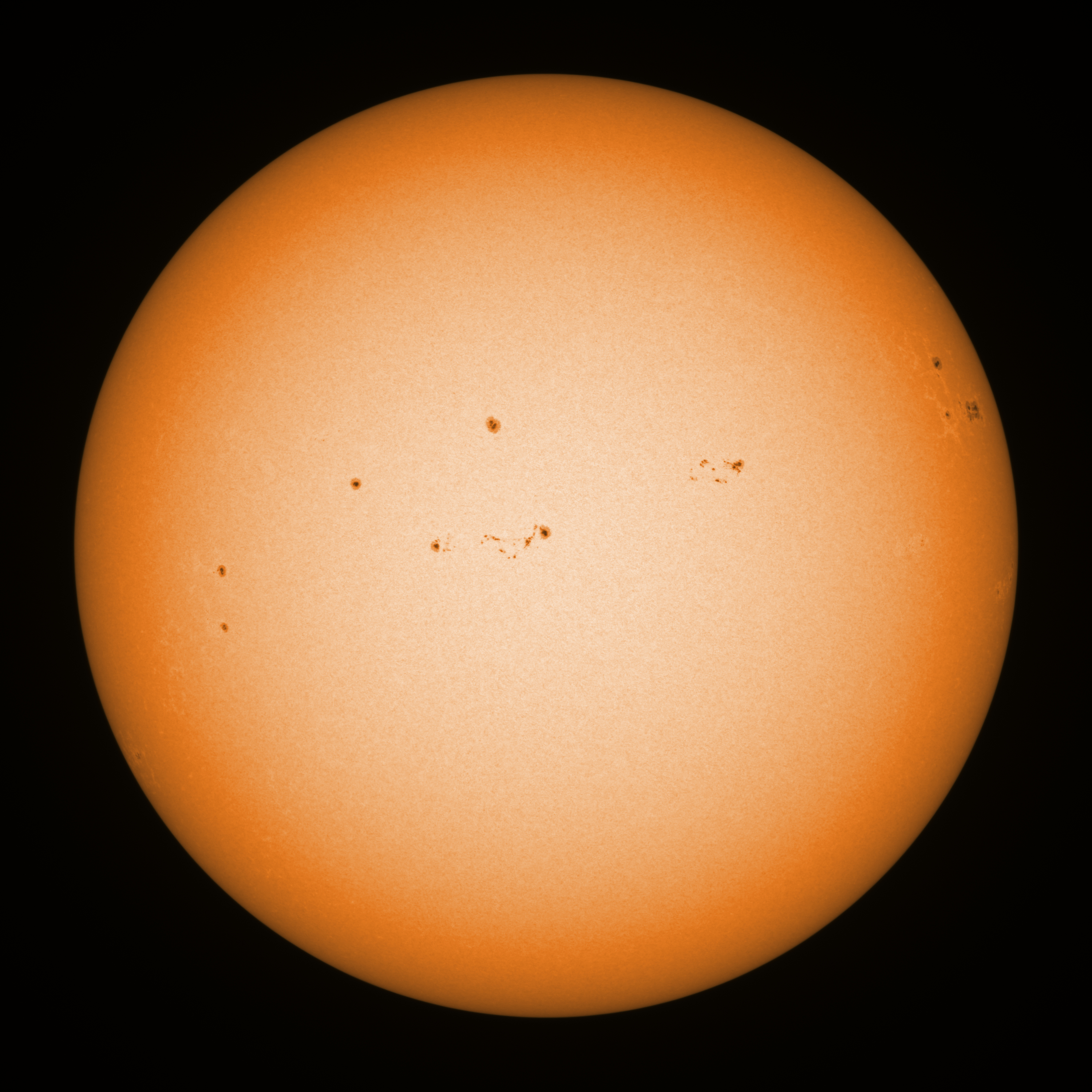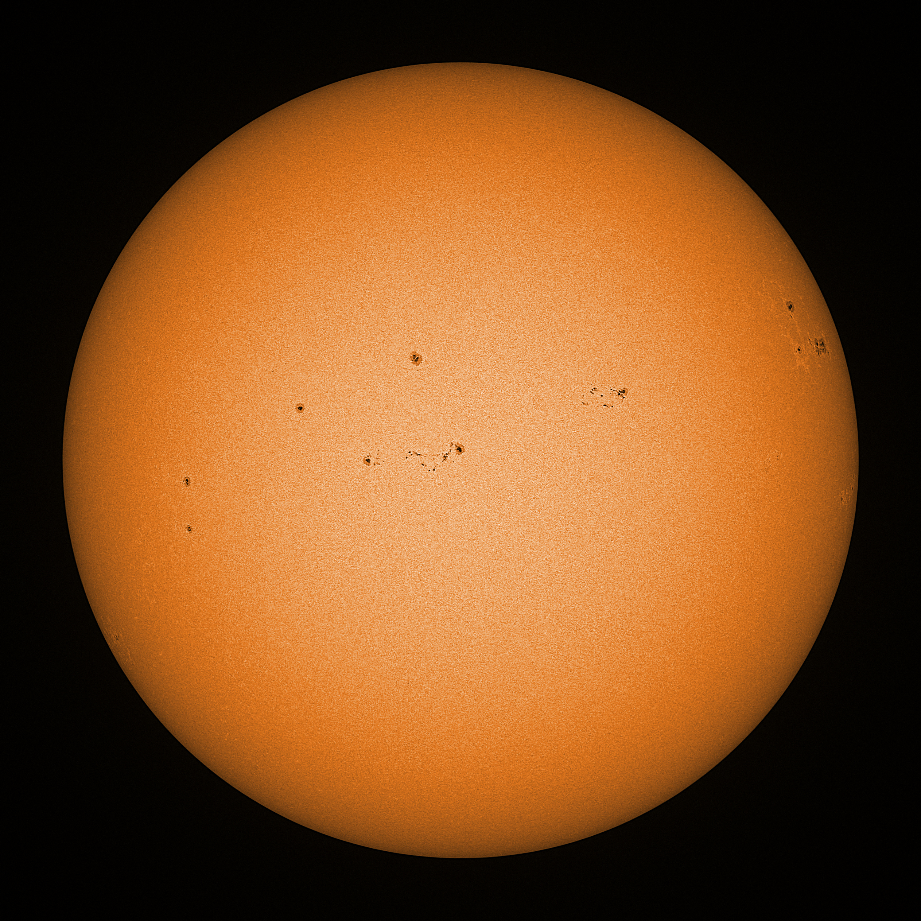 Observation date/time: 10 August 2025 08:07 UTC Telescope: GTT60 (Galileo Type Telescope) Focal length: 1490mm (plano convex singlet) Aperture: 60mm Stop: 30mm Eyepiece: -75mm (plano concave singlet, 24mm aperture) Observation type: projection (350mm distance, 80mm diameter) Reference: Earth's rotation axis Exposure (transparency): 0.430ms (using 82nm bandwidth green filter) Seeing (SSSMon): 3.5-3.7" (2.0" at best) =================================================================== Total number of sunspots: 41 | |