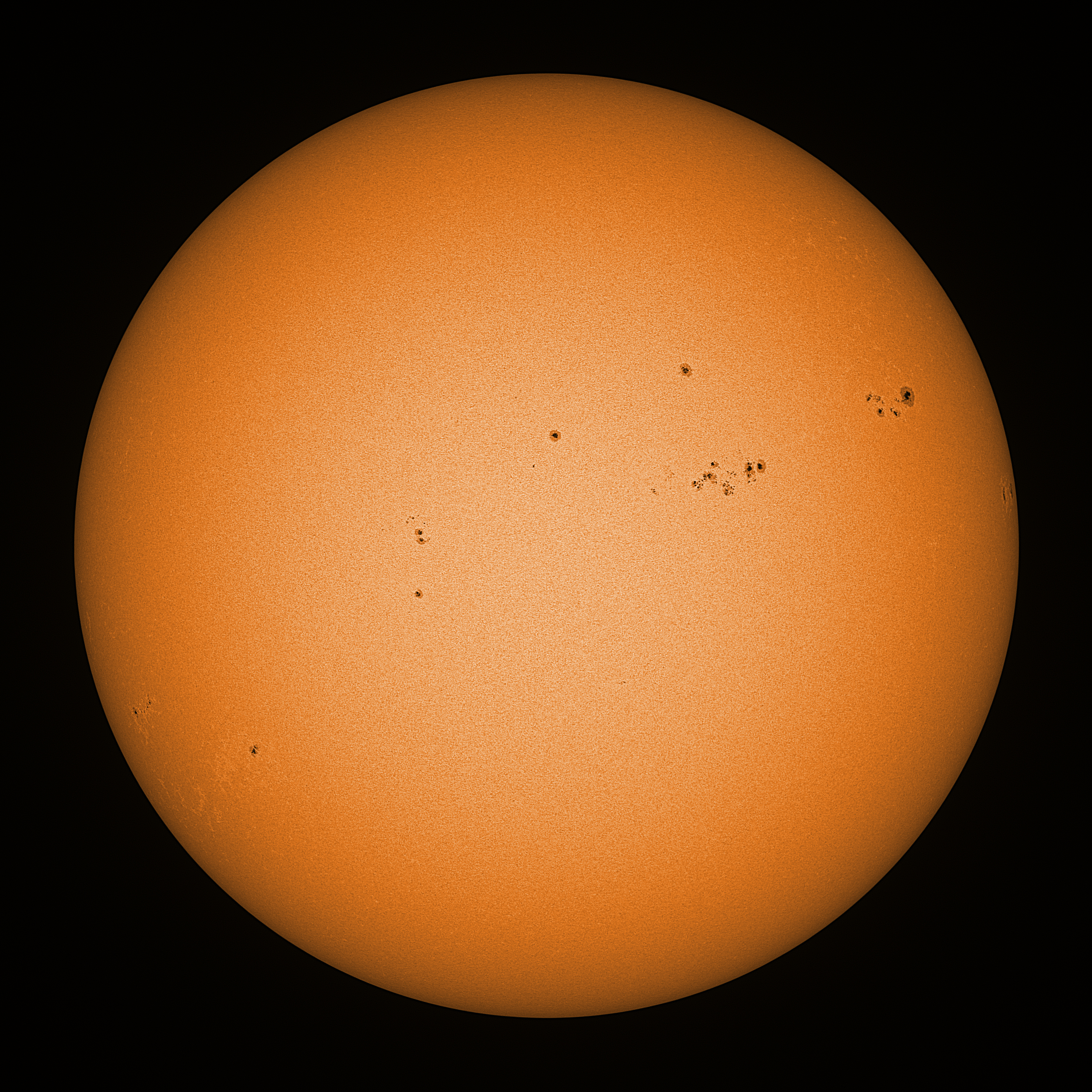 Observation date/time: 12 August 2025 10:28 UTC Telescope: GTT60 (Galileo Type Telescope) Focal length: 1490mm (plano convex singlet) Aperture: 60mm Stop: 30mm Eyepiece: -75mm (plano concave singlet, 24mm aperture) Observation type: projection (350mm distance, 80mm diameter) Reference: Earth's rotation axis Exposure (transparency): 0.430ms (using 82nm bandwidth green filter) Seeing (SSSMon): 4.5-6.5" (2.0" at best) =================================================================== Total number of sunspots: 36 | |