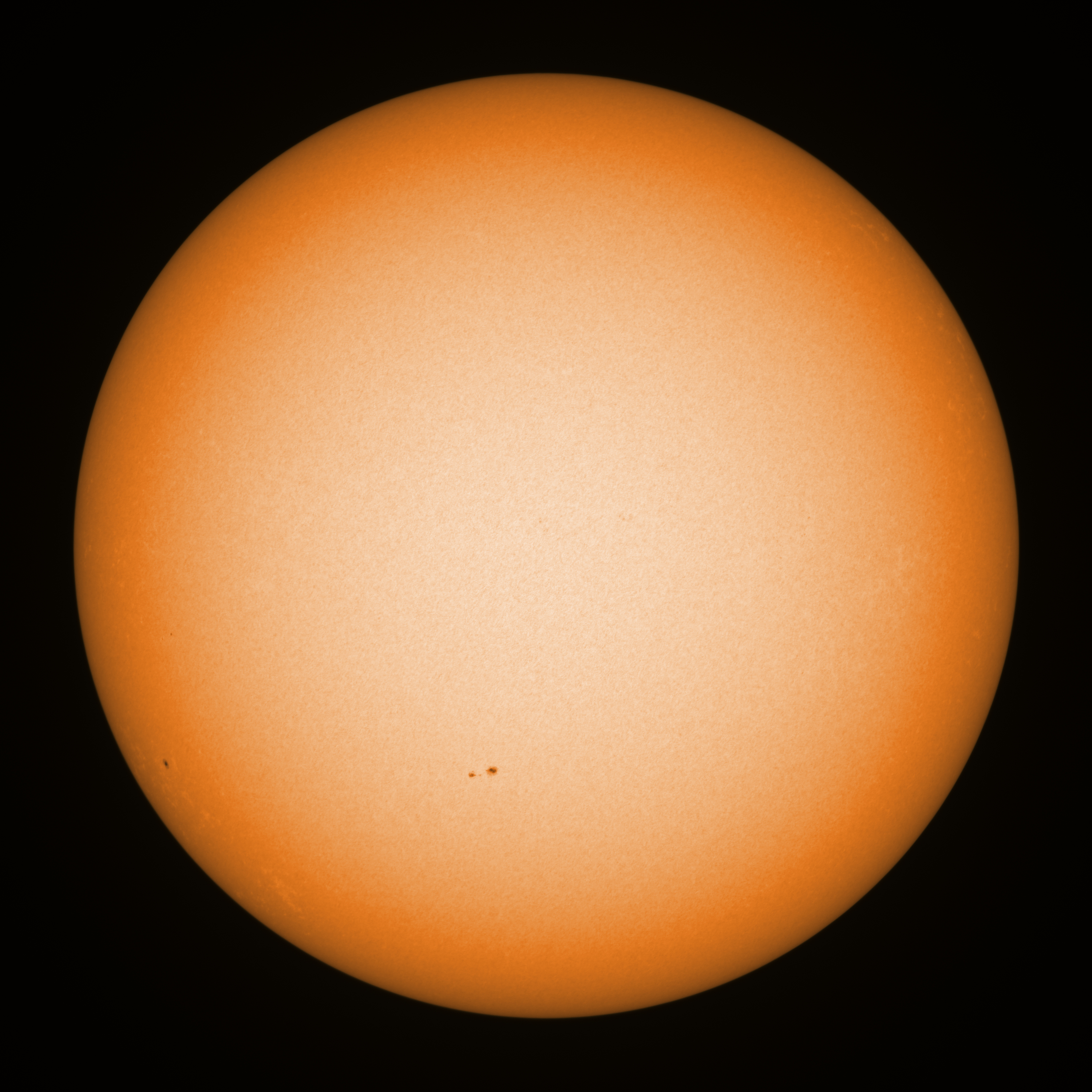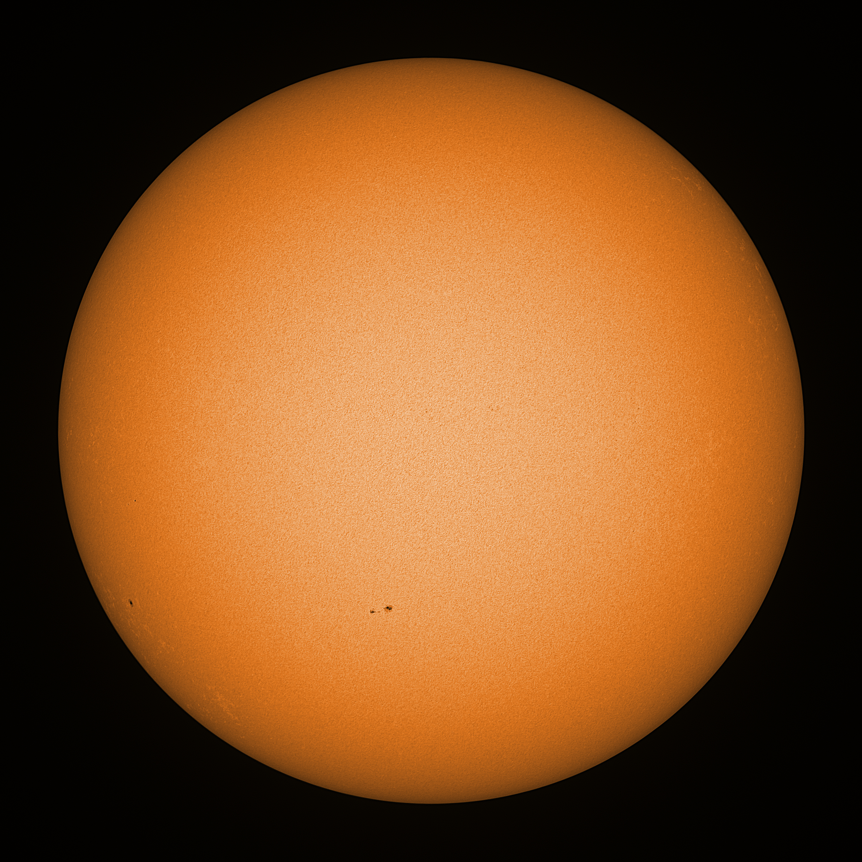 Observation date/time: 19 August 2025 08:11 UTC Telescope: GTT60 (Galileo Type Telescope) Focal length: 1490mm (plano convex singlet) Aperture: 60mm Stop: 30mm Eyepiece: -75mm (plano concave singlet, 24mm aperture) Observation type: projection (350mm distance, 80mm diameter) Reference: Earth's rotation axis Exposure (transparency): 0.380ms (using 82nm bandwidth green filter) Seeing (SSSMon): 2.5-3.0" (1.5" at best) =================================================================== Total number of sunspots: 4 | |