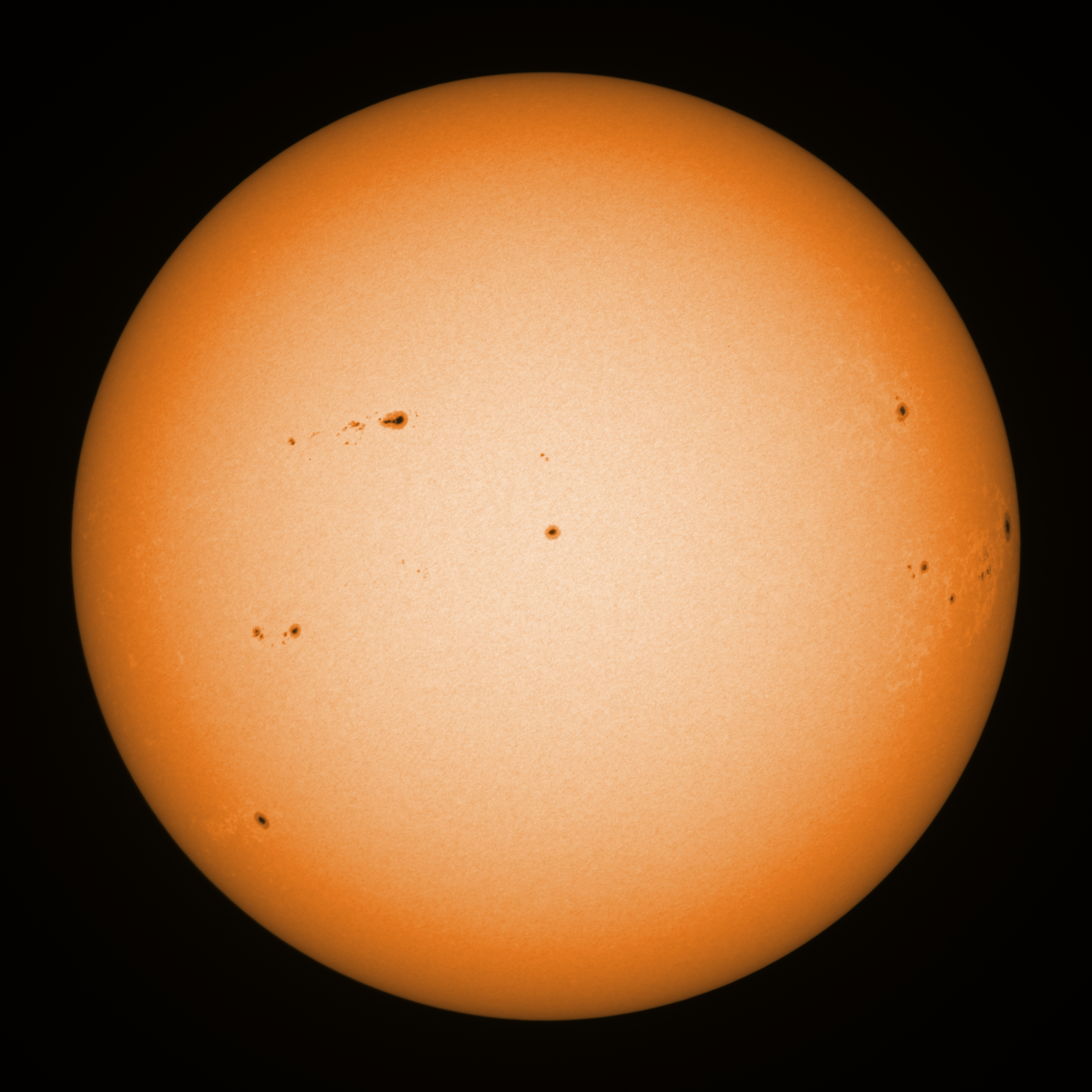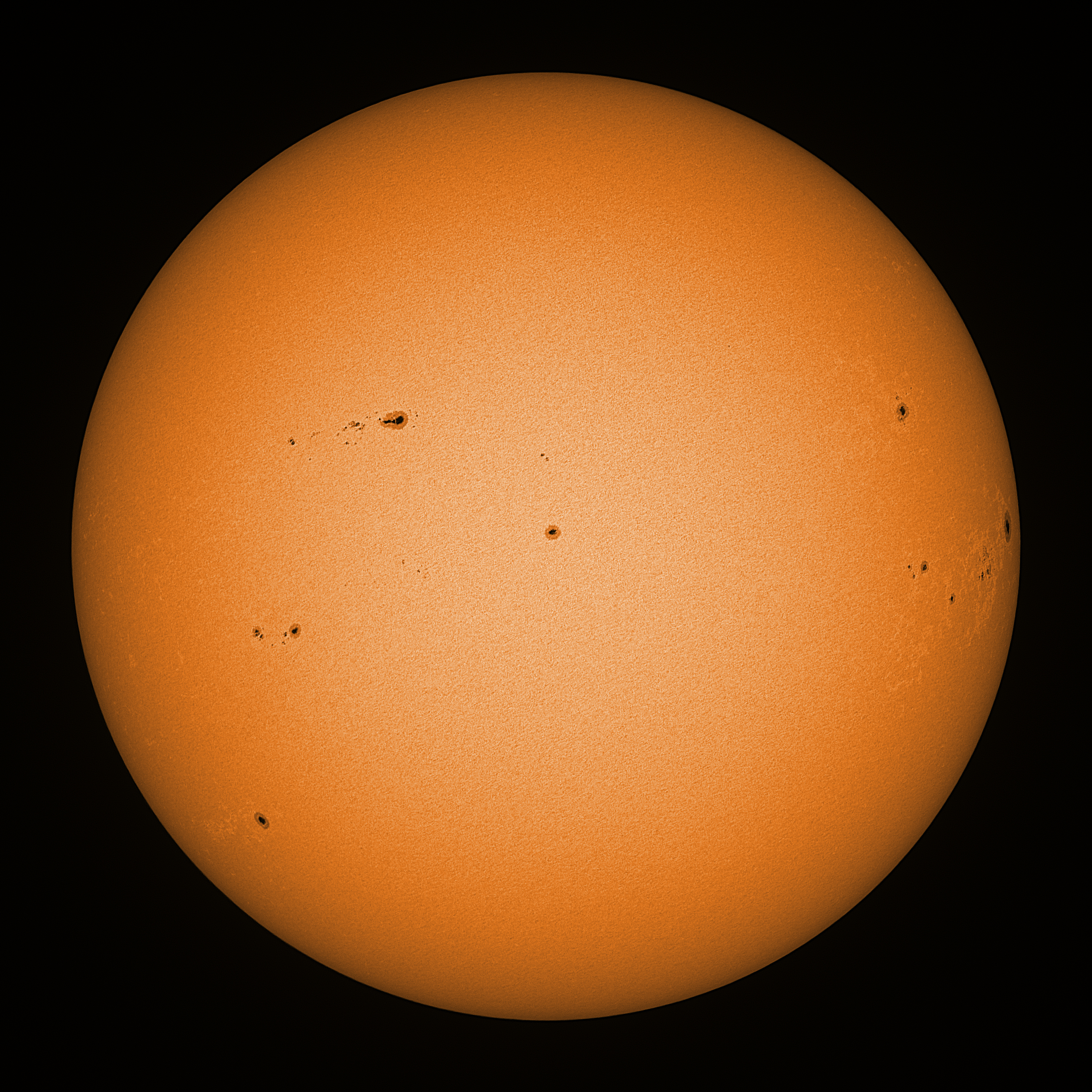 Observation date/time: 04 September 2025 08:03 UTC Telescope: GTT60 (Galileo Type Telescope) Focal length: 1490mm (plano convex singlet) Aperture: 60mm Stop: 30mm Eyepiece: -75mm (plano concave singlet, 24mm aperture) Observation type: projection (349mm distance, 80mm diameter) Reference: Earth's rotation axis Exposure (transparency): 0.530ms (using 82nm bandwidth green filter) Seeing (SSSMon): 1.3-1.8" (1.0" at best) =================================================================== Total number of sunspots: 38 | |