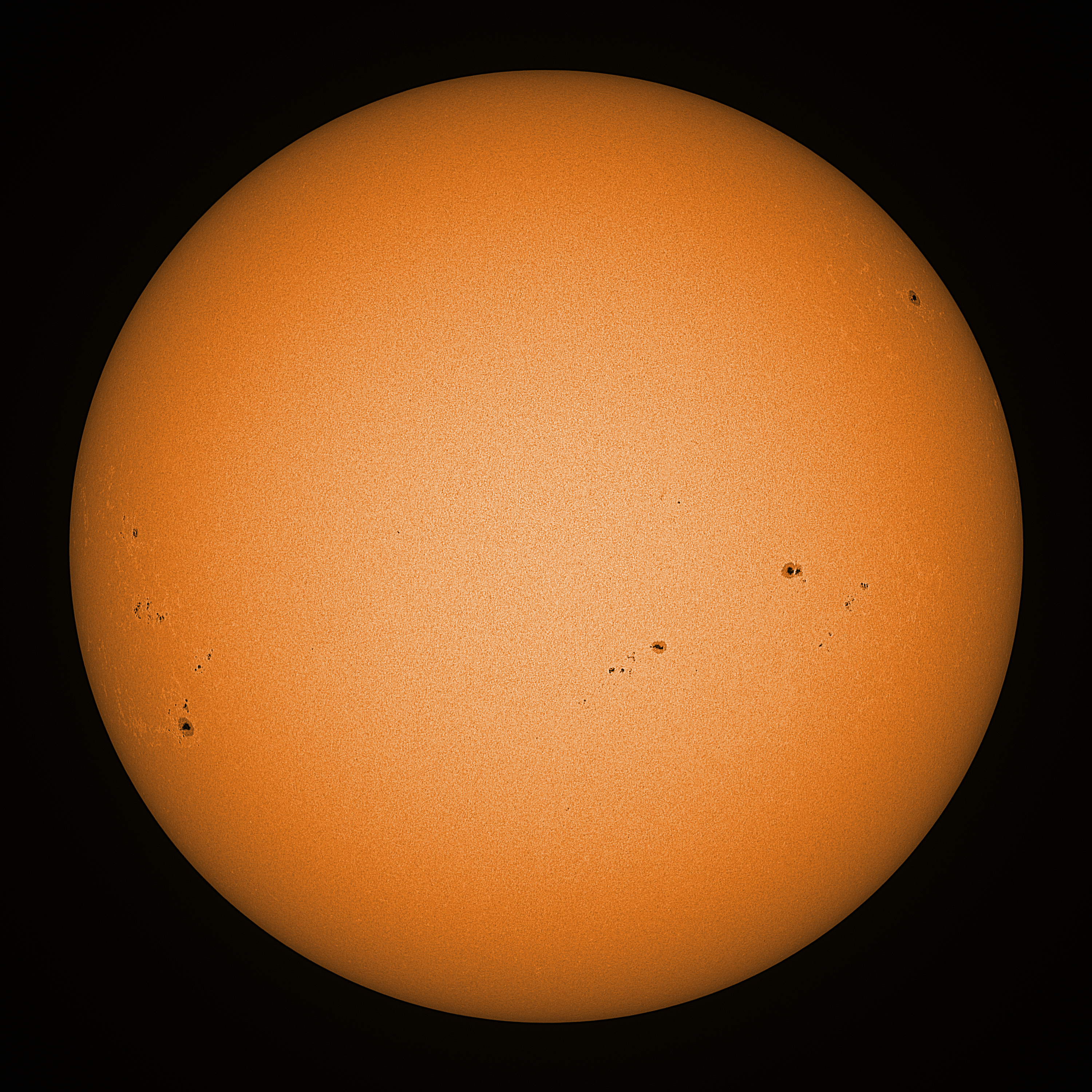 Observation date/time: 28 September 2025 08:35 UTC Telescope: GTT60 (Galileo Type Telescope) Focal length: 1490mm (plano convex singlet) Aperture: 60mm Stop: 30mm Eyepiece: -75mm (plano concave singlet, 24mm aperture) Observation type: projection (347mm distance, 80mm diameter) Reference: Earth's rotation axis Exposure (transparency): 0.430ms (using 82nm bandwidth green filter) Seeing (SSSMon): 1.5-1.8" (0.7" at best) =================================================================== Total number of sunspots: 36 | |