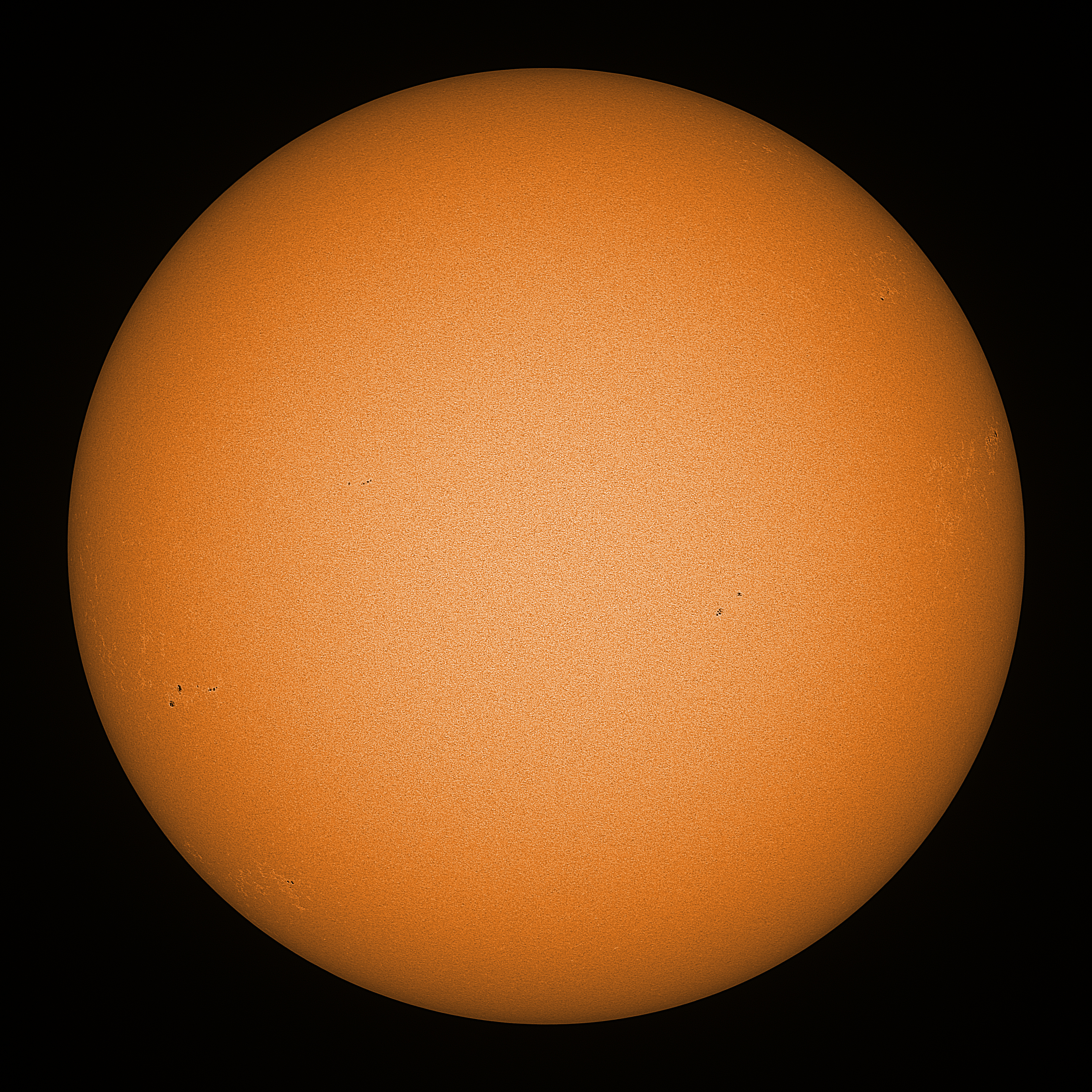 Observation date/time: 10 October 2025 08:47 UTC Telescope: GTT60 (Galileo Type Telescope) Focal length: 1490mm (plano convex singlet) Aperture: 60mm Stop: 30mm Eyepiece: -75mm (plano concave singlet, 24mm aperture) Observation type: projection (347mm distance, 80mm diameter) Reference: Earth's rotation axis Exposure (transparency): 0.530ms (using 82nm bandwidth green filter) Seeing (SSSMon): 2.5-3.5" (1.2" at best) =================================================================== Total number of sunspots: 13 | |