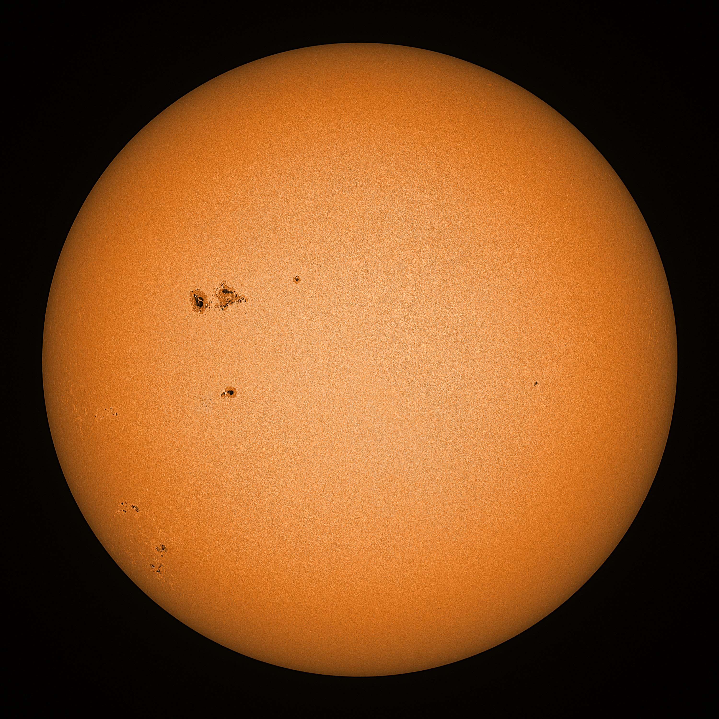 Observation date/time: 07 November 2025 10:50 UTC Telescope: GTT60 (Galileo Type Telescope) Focal length: 1490mm (plano convex singlet) Aperture: 60mm Stop: 30mm Eyepiece: -75mm (plano concave singlet, 24mm aperture) Observation type: projection (345mm distance, 80mm diameter) Reference: Earth's rotation axis Exposure (transparency): 0.830ms (using 82nm bandwidth green filter) Seeing (SSSMon): 2.0-2.5" (0.9" at best) =================================================================== Total number of sunspots: 32 | |