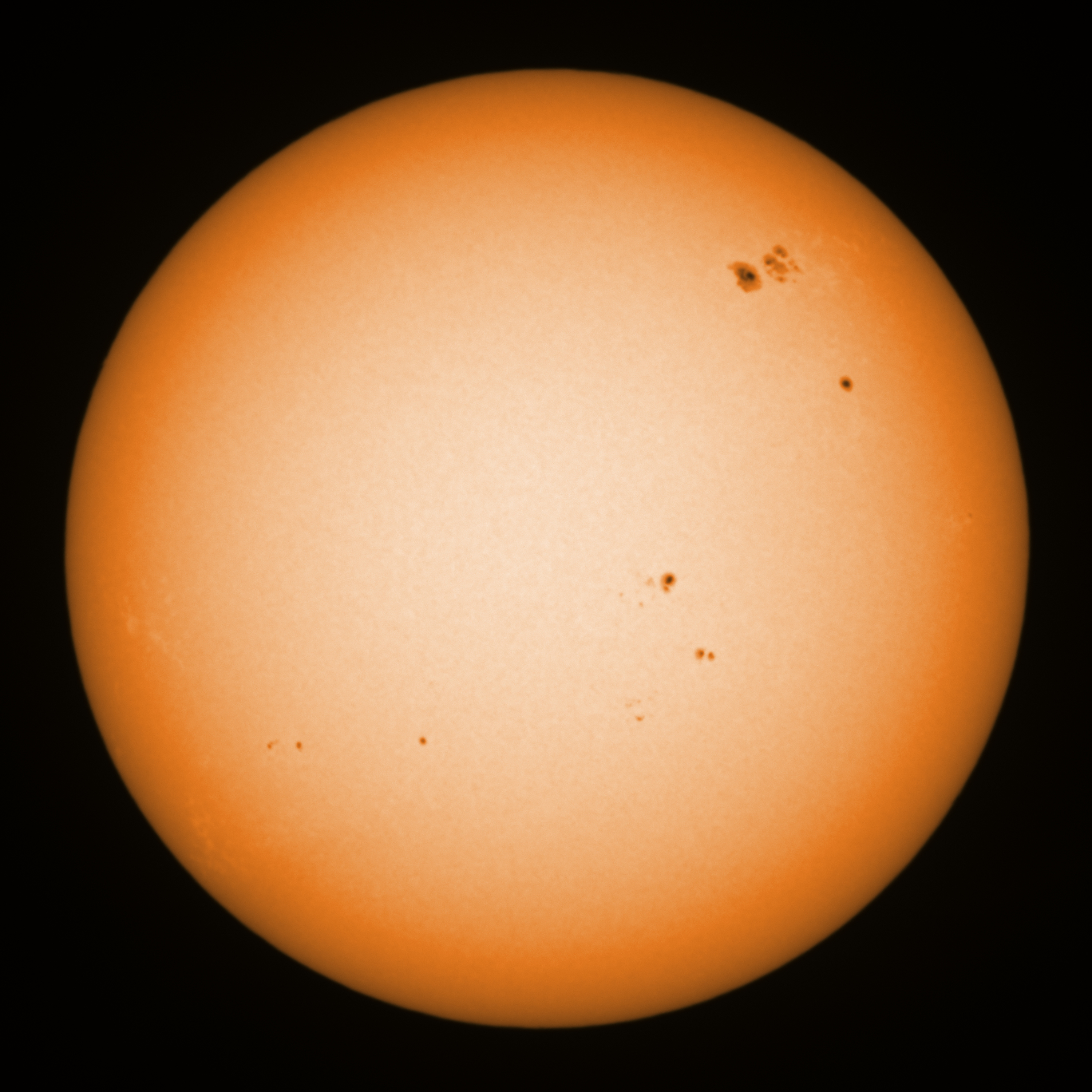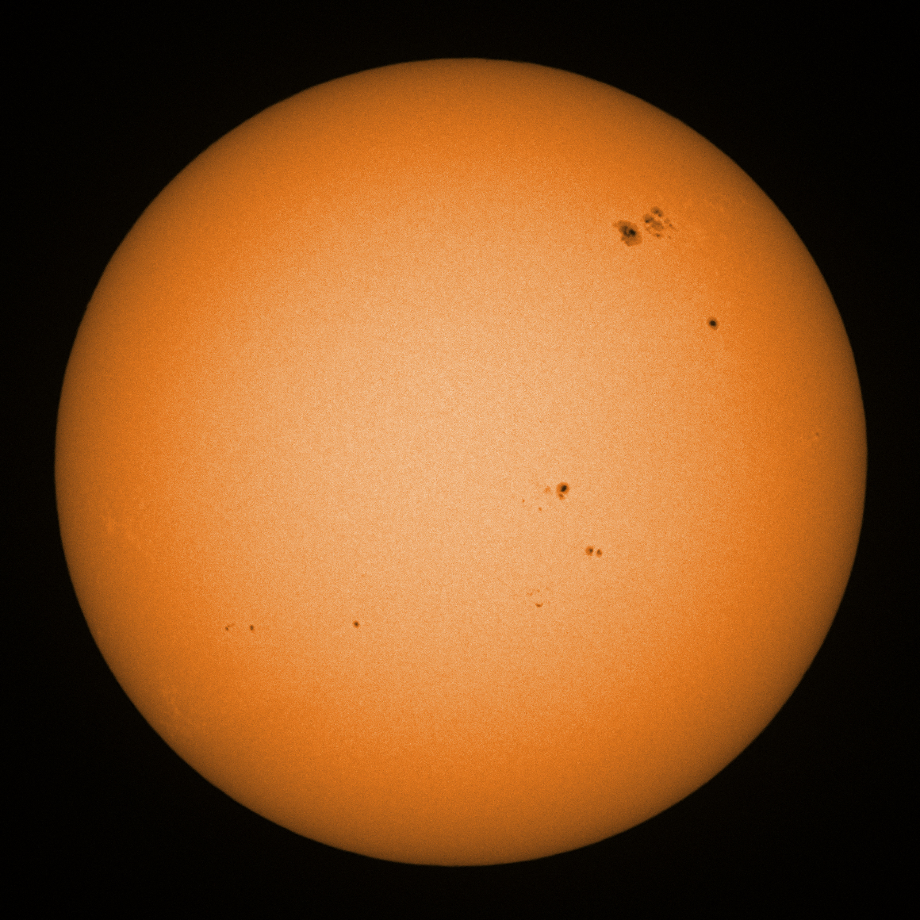 Observation date/time: 12 November 2025 14:29 UTC Telescope: GTT60 (Galileo Type Telescope) Focal length: 1490mm (plano convex singlet) Aperture: 60mm Stop: 30mm Eyepiece: -75mm (plano concave singlet, 24mm aperture) Observation type: projection (340mm distance, 80mm diameter) Reference: Earth's rotation axis Exposure (transparency): 0.830ms (using 82nm bandwidth green filter) Seeing (SSSMon): 0.8-1.2" (0.6" at best) =================================================================== Total number of sunspots: 22 | |