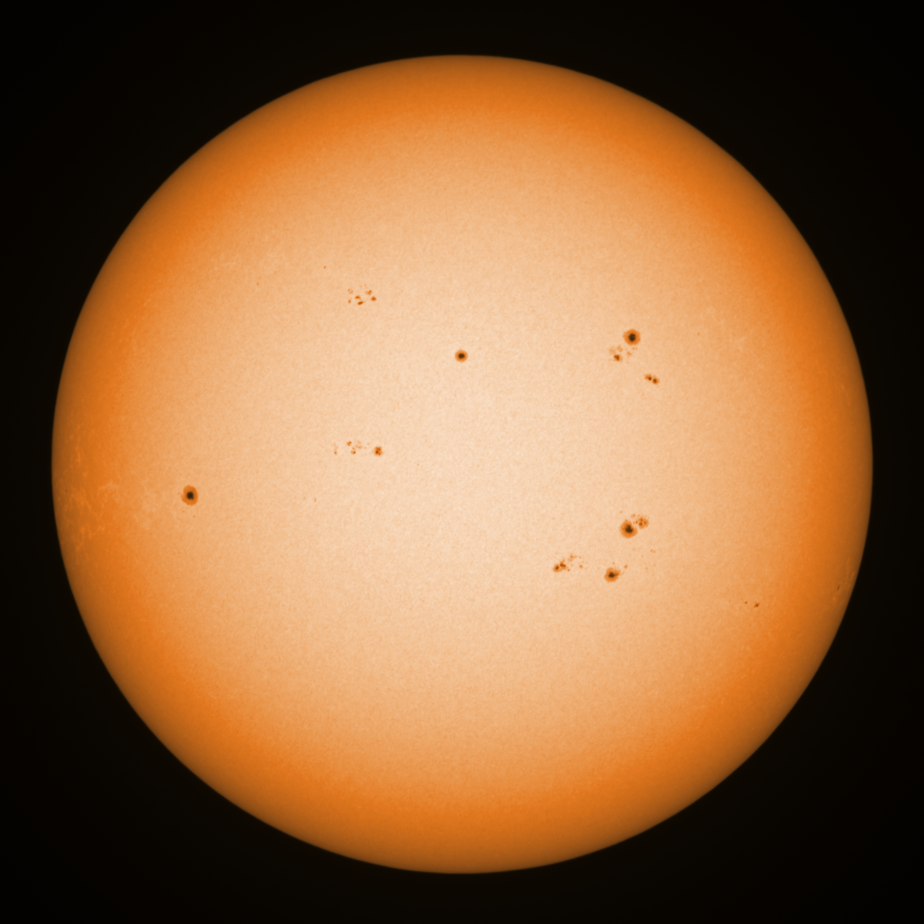 Observation date/time: 22 January 2026 10:05 UTC Telescope: GTT60 (Galileo Type Telescope) Focal length: 1490mm (plano convex singlet) Aperture: 60mm Stop: 30mm Eyepiece: -75mm (plano concave singlet, 24mm aperture) Observation type: projection (338mm distance, 80mm diameter) Reference: Earth's rotation axis Exposure (transparency): 0.780ms (using 82nm bandwidth green filter) Seeing (SSSMon): 2.3-2.5" (1.6" at best) =================================================================== Total number of sunspots: 36 | |