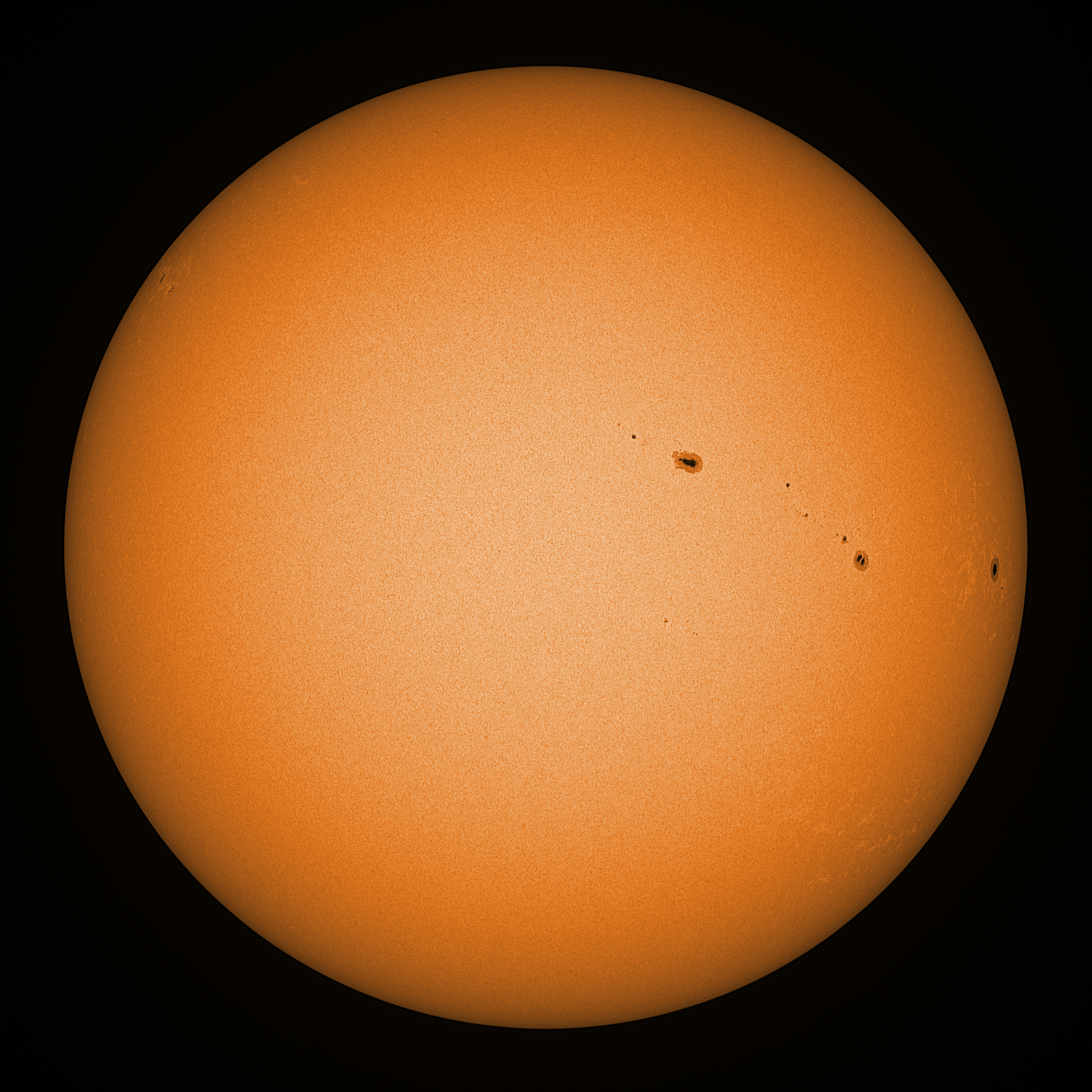 Observation date/time: 08 March 2026 14:06 UTC Telescope: GTT60 (Galileo Type Telescope) Focal length: 1490mm (plano convex singlet) Aperture: 60mm Stop: 30mm Eyepiece: -75mm (plano concave singlet, 24mm aperture) Observation type: projection (342mm distance, 80mm diameter) Reference: Earth's rotation axis Exposure (transparency): 1.060ms (using 82nm bandwidth green filter) Seeing (SSSMon): 6.0-6.5" (3.5" at best) =================================================================== Total number of sunspots: 13 | |