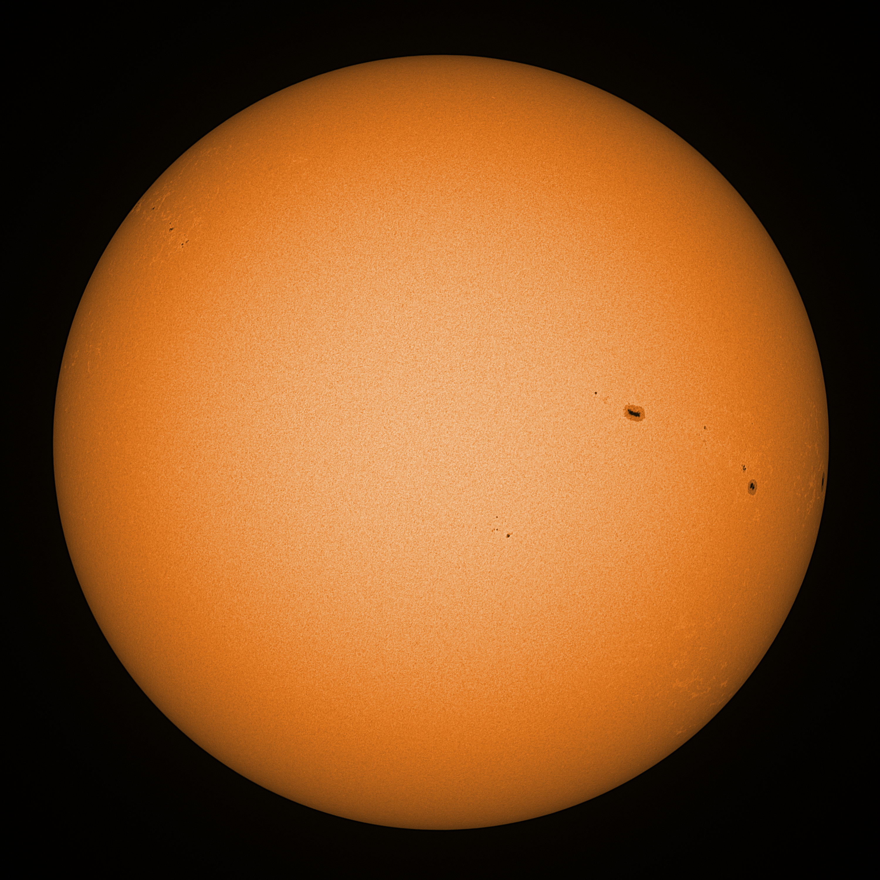 Observation date/time: 09 March 2026 15:25 UTC Telescope: GTT60 (Galileo Type Telescope) Focal length: 1490mm (plano convex singlet) Aperture: 60mm Stop: 30mm Eyepiece: -75mm (plano concave singlet, 24mm aperture) Observation type: projection (342mm distance, 80mm diameter) Reference: Earth's rotation axis Exposure (transparency): 1.960ms (using 82nm bandwidth green filter) Seeing (SSSMon): 5.0-7.0" (2.0" at best) =================================================================== Total number of sunspots: 12 | |