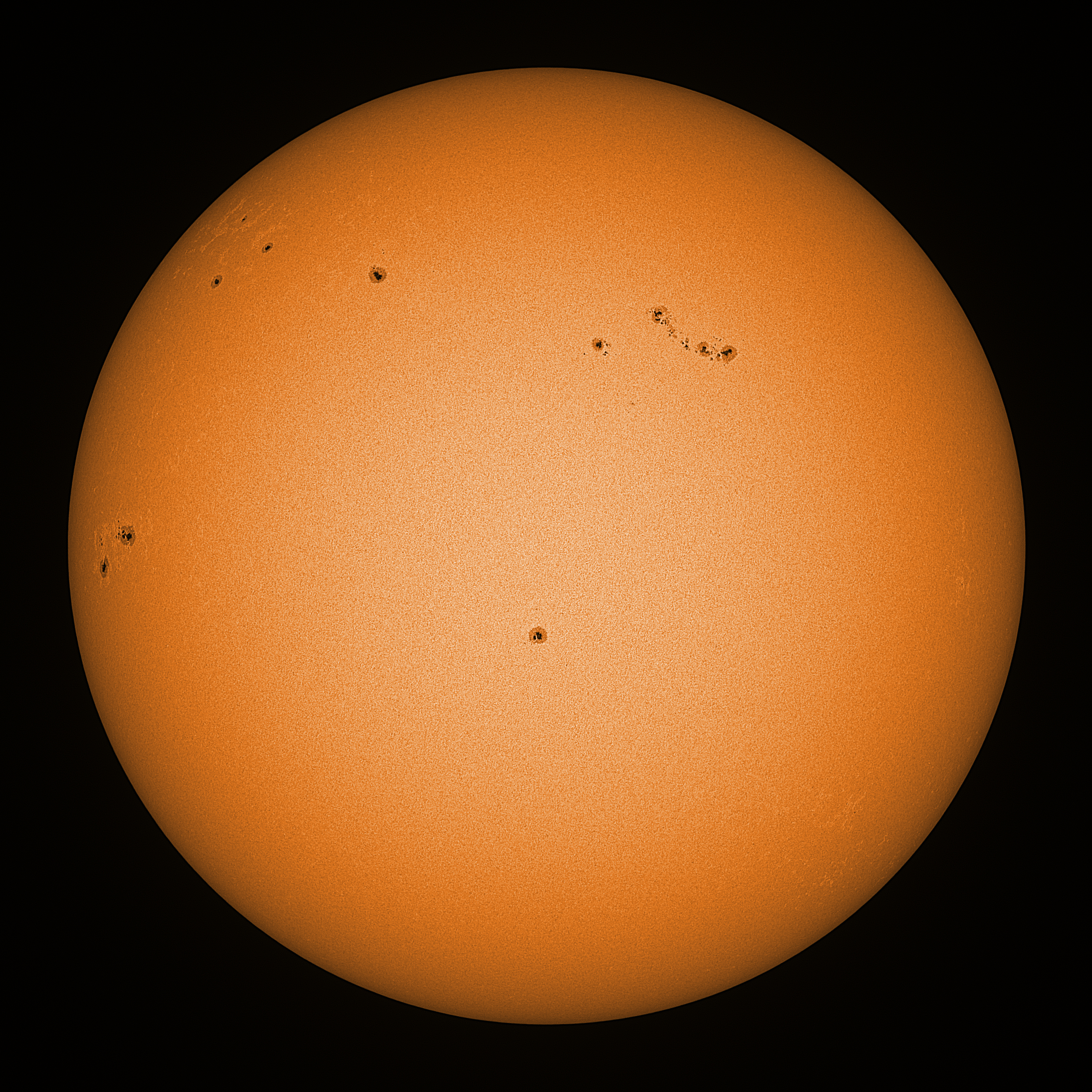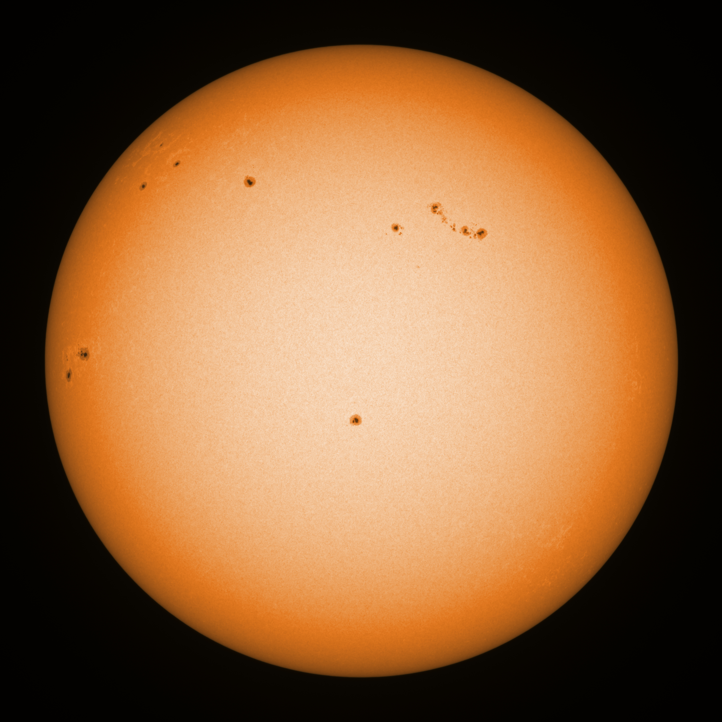 Observation date/time: 28 March 2026 08:41 UTC Telescope: GTT60 (Galileo Type Telescope) Focal length: 1490mm (plano convex singlet) Aperture: 60mm Stop: 30mm Eyepiece: -75mm (plano concave singlet, 24mm aperture) Observation type: projection (345mm distance, 80mm diameter) Reference: Earth's rotation axis Exposure (transparency): 0.430ms (using 82nm bandwidth green filter) Seeing (SSSMon): 4.0-4.5" (2.5" at best) =================================================================== Total number of sunspots: 31 | |