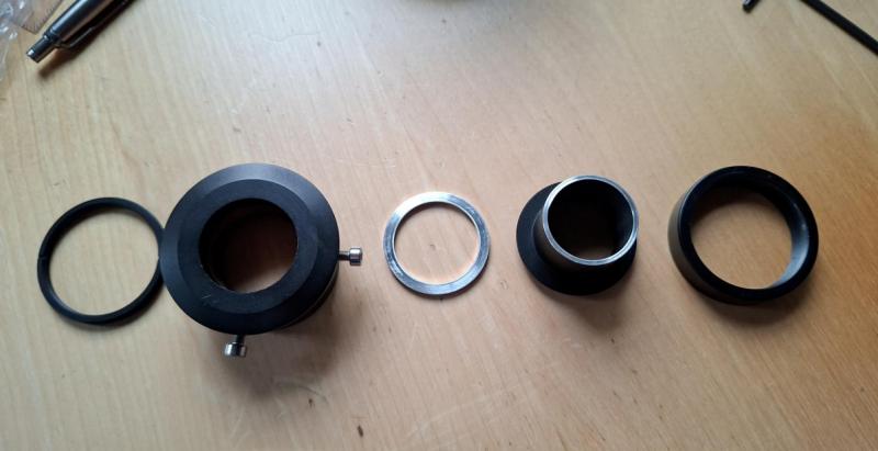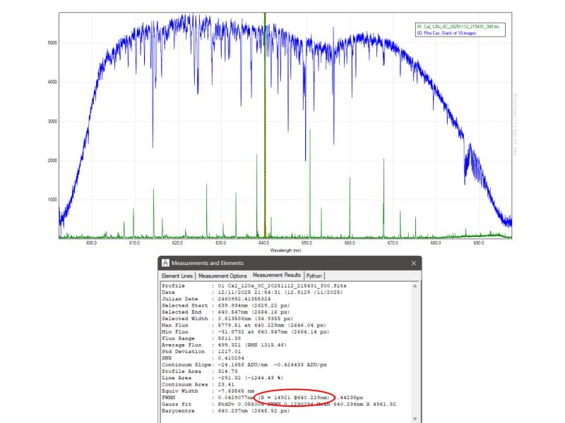 MLAstro SHG700 SpectroscopeIn 2023 I had the chance to borrow a Shelyak LHires III from a university for half a year. After I returned it I considered getting one myself. Christian Buil's 3D Sol'Ex/Star'Ex had attracted my attention as well, but I feared the plastics in it, wondered how that would affect stability. My initial plan was to make an aluminium version of the Star'Ex, but then news reached me about 'this guy from Vietnam' who had designed an aluminium version. This guy is Minh T. Nguyen, who had started MLAstro, and produced these magnificent Spectroheliographs. I wanted to use a spectroscope for Pro-Am work through the AAVSO, to get spectra from comets, and perhaps do some fun stuff as measuring the rotation speed of the Sun, Jupiter, and perhaps the orbital speeds of the Jovian Moons. A spectroheliograph, however, is a spectroscope meant to be used for imaging the Sun in selectable wavelengths, but being closely designed after the Sol'Ex/Star'Ex, it can be converted to a spectroscope for deep-sky spectroscopy by adding calibration and guide units, and another slit. Using the SHG700 as deep-sky spectroscope![]() Figure 2: The 12V four channel relais board for controlling the Alpy calibration module in home-made housing. The SHG700 I received came from batch 6 and arrived in October 2025. In order to adapt the SHG700 to deep-sky work, I added a Shelyak Alpy 600 calibration module to it (the white flat box in figure 1). This module has a NeAr (Neon-Argon) calibration lamp, a tungsten lamp for creating flats, and it can block incoming light from the telescope so that darks can be taken. Controlling the calibration module from data-acquisition software (CCDciel in this case) can be done using a switch like the SOS Electronics 12V four channel relais board in combination with NOYTIO USB Relay Controller Switch Driver (see figure 2). MLAstro already offered an aluminium guiding module, so that was ordered together with the SHG700. As guiding camera I decided to use an old ZWO ASI1600MM Pro Cool that I once exposed to direct sunlight, which caused a permanent ghost image of the Sun on the chip, rendering it less suitable for deep-sky imaging. The advantage of this camera is that it has a large imaging chip, which is beneficial to plate-solving. It sees the sky through the reflective surface of the spectroscope's entrance slit. ![]() Figure 3: The low-profile adapter that holds the guide-camera to the guiding module of the MLAstro SHG700. The SHG700 guide module is meant to work with a mini camera like the ZWO ASI120MM Mini, that had to be mounted a ZWO Helical focuser to the guide-module. For deeps-sky imaging this can cause two issues: The helical focuser may not be stable enough to ensure a fixed position of the slit on the guide camera chip during long sessions (during which the orientation of the spectroscope changes), and cameras with larger chips like the ASI1600MM Pro Cool will not get the right back-focus distance when using the helical focuser as that focuser is too long. I thus created another solution: instead of the helical focuser I mounted a low-profile 2" to 1.25" adapter on the SHG700 (for parts see figure 5). The camera is equipped with a standard 1.25" nose-cone that fits the low-profile adapter. Downsides of this solution are twofold as well: the adapter only has a single clamp-screw as a result of which the camera could wobble some 6 pixels, way too much to be useful. By adding a second screw this issue was completely overcome and the slit now remains stable well within a pixel. The other issue is that this solution is not a focuser, but by using spacers of varying thickness (one home-made 1.25" x 2.5mm aluminium spacer and a set of Baader T2 spacers) this was also overcome. Originally the SHG700 is equipped with a 7µ wide reflective entrance slit. For solar imaging this is fine, even better: the narrower the better as one would only need one column of pixels to scan the full solar disk. For deep-sky spectroscopy, however, we want to properly sample the incoming spectrum. As science camera I had chosen the ZWO ASI2600MM Pro, a camera with a APS-C size chip and 3.76µ pixels. As the SHG700 has the same optics on both sides of the reflective grating, the slit is projected as wide on the imaging chip as it actually is. Being 7µ wide, the image of it would be just under 2 pixels, too low to satisfy the Nyquist criterion. I had thus ordered a Gen2 14-20-26-32 µm slit (with 25 µm central hole) from Shelyak. This slit was meant for the Star'Ex and a 3D-print slit holder is available. Sadly enough these 3D designs do not fit the SHG700, but then I am not a fan of plastics anyway. So I had one printed as example, created a drawing for an aluminium version, and created that in my workshop (see figure 4). Meanwhile Minh is working on an aluminium slit holder for this slit as well, so hopefully he can deliver these soon. First lightFirst light was done on a tripod by simply aiming the SHG700 to the sky at daytime. Despite it large sensor, but thanks to the excellent optics in the SHG700, the spectrum is razor sharp all over the field of view (see figure 5, click here for the full version in jpg-format and here as tiff)! This was way better than I hoped fore and it turned out to produce a 100nm wide spectrum when using a 2400l/mm grating in combination with the ZWO ASI2600MM Pro. Combined with the 20µ slit a resolving power of around R=15000 can be achieved at the H-alpha wavelength (see figure 8). I had also ordered a 300l/mm grating from MLAstro for full visible light observations, but that delivered a 1000nm wide field of view in this set-up (see figure 7). So a new grating is ordered, will post the results here once it is tested. If you have any questions and/or remarks please let me know. |