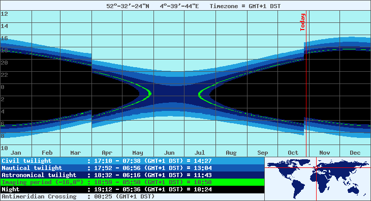 Astronomical Twilight toolFor those interested in the times and period of imaging based on various twilights I have made this small configurable twilight graph. Along the horizontal scale it shows the day of the year, along the vertical scale the hour of the day with noon at the top and bottom and midnight at the centre. The latitude, longitude and time zone can be changed to one's own location. The resulting graph shows civil, nautical and astronomical twilight and in addition a green band centred around a configurable solar altitude (default = -16 degrees), which indicates the start and end of the imaging period. In addition the antimeridian passage of the sun is given as an indication for the darkest moment of the night. Measurements have shown that at about 15-16 degrees below the horizon little improvement in SQM value can be expected, hence this configurable field (limit=-15 or limit=-15.5, etc). These measurement show SQM values vs solar altitude (http://www.hnsky.org/sqm_twilight.htm). Although this data is collected on one location only and should be backed up by more data measured elsewhere to gain more scientific value, it seems fair to start around this -15 degrees solar altitude. I expect that the SQM values also depend on the direction in which we want to image (in direction of or opposite to the setting/rising sun). Especially locations further from the equator than 50 degrees may benefit from the additional time. The red vertical line represents today's date, the twilight times and periods of which are shown below the graph. Your personalised twilight graphThe image is created by a PHP script and can be placed on your own website using the following HTML-code: IMG SRC=http://www.dehilster.info/astronomicaltwilight.php?latitude=52.5402&longitude=4.662&zone=2&limit=-13![]() Alternatively the following link can be modified and bookmarked: http://www.dehilster.info/astronomicaltwilight.php?latitude=52.5402&longitude=4.662&zone=2&limit=-16 The latitude, longitude, time zone and limit can be modified to match your observatory. North of equator and eastern hemisphere are positive figures. The limit is the altitude below the horizon at which the green line is drawn (default = -16). Other directives are: &date=[the date for which you want to see the graph, e.g. &date=15 October 2023] &dst=CEST (for European Daylight Saving Time) &dst=CAN (for Canadian Daylight Saving Time) &dst=UK (for UK Daylight Saving Time) &dst=US (for US Daylight Saving Time, but you need to specify the zone) Please let me know if you have special requirements regarding Daylight Saving Time. If you have any questions and/or remarks please let me know. |