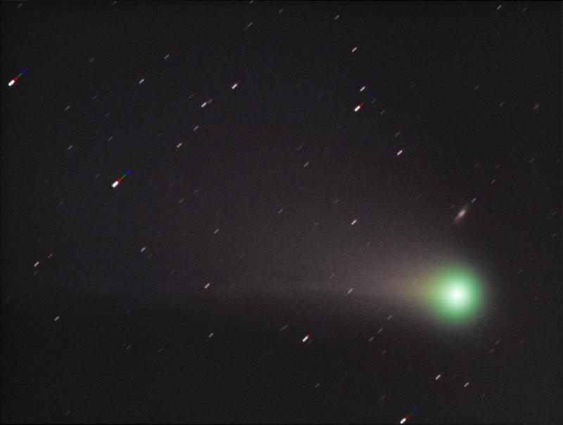 CometsComets are objects that, when getting close to the Sun warm up and release gas. This gas can be seen as a coma and sometimes also as a tail or even double tail. A very bright and recent comet was C/2020 F3 NEOWISE, which was visible to the unaided eye and showed a very nice double tail. The comets shown in this section are all imaged by tracking on the comet. This is done unguided by programming the ephemeris into the 10Micron GM3000HPS and then let the mount do the tracking. Comet processingSome of the comet images shown here do not show star trails, but most of them do. The reason for this is that comets move relative to the background. So if multiple images are used to produce one image, we can either stack them by aligning the comet in them (which causes the stars to trail) or by aligning the stars (but that causes the comet to trail). The star trails show the order in which the filters were used. Stacking is normally done on the comet in a single pass, but by using a threefold processing method it is possible to show the comet as if standing still. First stack on the comet, so with Registration Mode on Comet/One Star, and with Integration set to a Median Filter with Kappa High to approximately 1.5. After LRGB-combine this produces a sharp comet with no stars. I will call this [Plate 1]. [Plate 1] still shows some vague traces, but these can easily be removed with a clone brush. It took me about 5 minutes to clean [Plate 1] a bit further. Then stack on the stars with default settings, followed by LRGB-combine, resulting in a starry sky with a smeared comet. This is [Plate 2]. Pass [Plate 2] through APP's Star Removal Tool, which results in a star-less smeared comet. This is [Plate 3]. Ran all three plates through Topaz to reduce the noise, but above all to reduce the artefacts left over from the Star Removal Tool, otherwise they will reappear later when combining. Load [Plate 3] as a new layer on top of [Plate 2] and set this layer to difference. With this we subtract the smeared comet from [Plate 2], leaving a clean starry sky. This is [Plate 4]. Load [Plate 1] as a new layer on top of [Plate 4] and set this layer on screen, so that the two layers are combined. This is [Plate 5]. Then edit [Plate 5] as a normal deep-sky image until it is to your liking. If you have any questions and/or remarks please let me know. |
