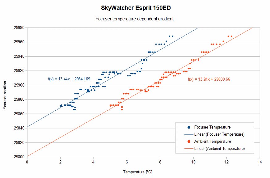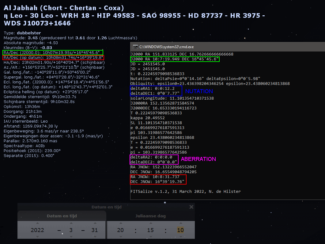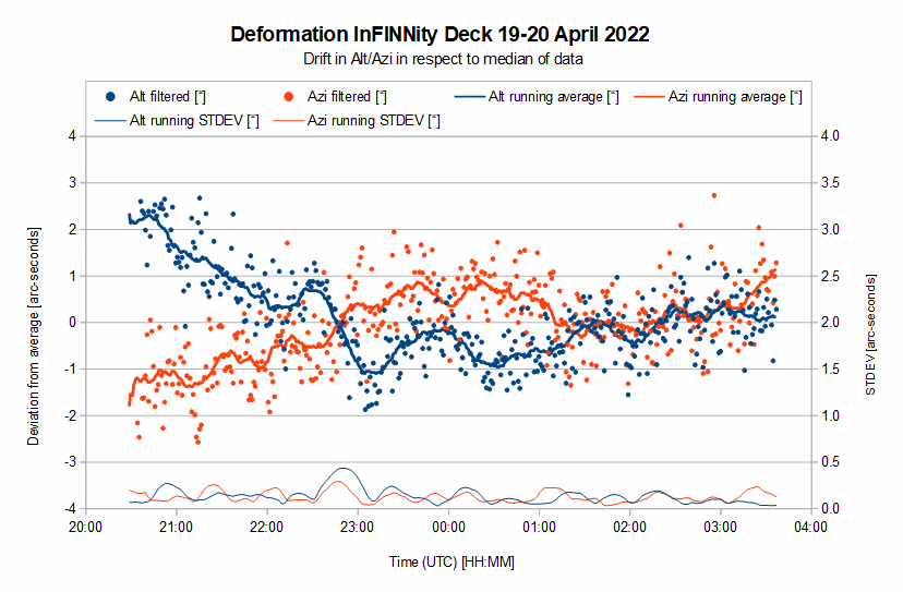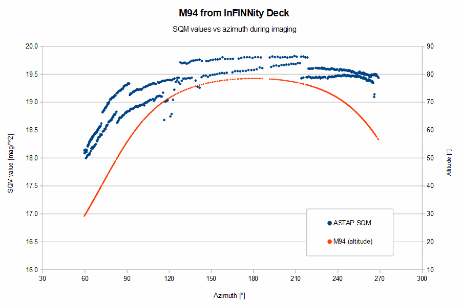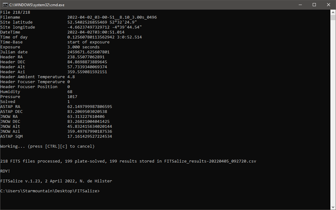 FITSalizeFITSalize is a small command-line toll that analyses a number of FITS-images. From these file the following information is deduced:FITSalize v.1.23 can be downloaded here. The changelog is at the bottom of this page. In order to do its work FITSalize depends on the Astrometric STAcking Program ASTAP. The ZIP-file contains the following: - cmd.bat: double-click this file to start a CMD-terminal; - fits.jar: library for reading FITS headers; - FITSalize.bat: batch-file to run FITSalize. It need the FITS location as a parameter; - FITSalize.ini: Preference file containing settings; - FITSalize_v1.23.ods: OpenOffice Calc spreadsheet for creating graphs; - FITSalize_v1.23.xls: Microsoft Excel spreadsheet for creating graphs (Export of FITSalize_v1.1.ods). FITSalize Set-upIn the FITSalize.ini file various options can be set. The location of ASTAP installation can be set after the line [ASTAP path], see adjacent image for the default location. The option [Timestamp is (start,middle,end) of exposure] defines the reference for the imaging moment, so whether the timestamp in the FITS header is the start, the middle or the end of the image capture. Suppose we start to image at 10:05:15.0pm with an exposure-time of 3 seconds, the FITS-image will show the sky as it was at 10:05:16.5pm. The FITS-header may, however, have stored the start of the exposure as observation time. Setting the Timestamp to "start", half the exposure time is automatically added to the times found in the FITS headers. Setting it to "end" will subtract this amount. Any other setting will cause it not to correct the times. The [Disable Aberration (yes/no)] setting allows to do the calculations without aberration. This can be useful when comparing the calculations to Stellarium as Stellarium does not apply aberration. As FITSalize does not apply proper motion to the calculations a star with limited proper motion should be selected in Stellarium. The [Export failed plate-solves (yes/no)] option allows to only export those files that were solved. When set to "yes" it will output data for each FITS, but only show data for those columns that require a successful plate-solve. For deformation and SQM measurements it is recommended to have the option set to "no" to avoid empty rows in the Alt/Azi and SQM columns. For focuser gradients it is best to have it at "yes". All data is stored in a .CSV-file which can easily be opened in OpenOffice or Excel (two example files are provided). The [Decimal sign] option allows to set the character for decimal symbol as used in the output file for those who have a locale that does not use a dot as decimal sign. The output file starts with a header-line explaining which data resides in which column. A description of the header can be found below. The output file ends with four lines stating at which date/time the processing was done, how many files were processed from which folder, how many were plate-solved and stored, and which FITSalize version was used. Deformation measurement set-upFor my test I recorded a single 3 second exposure image every 60 seconds using NINA. In order to have the correct longitude and latitude in the FITS header a mount has to be selected and active in NINA. For the deformation measurements the simulator mount can be used for this purpose. Simply select it, check if latitude and longitude are properly and accurately set and slew the mount using the virtual controller to approximately the right location in altitude and azimuth (say within 10 degrees). Once all images are taken, open one in ASTAP and load one of the FITS to see if it solves. If not, check if image height is correctly set in ASTAP (Stack-menu -> Alignment tab -> Field of view (height)) and set the Radius search area to 90 degrees (at the same tab). Check if ASTAP now does solve the FITS, and if so, ASTAP can be closed. Double-click the cmd.bat file and type the following command: FITSalize.bat [path to FITS files] The path can be realtive (e.g. ../data/lights) or absolute (e.g. Z:/data/lights), but UNC paths are not allowed (e.g. \\data\lights). Once FITSalize is ready the output file can be opened in your favourite spreadsheet. For convenience OpenOffice and Microsoft Office spreadsheet are supplied in the zip-file. Simply copy the data from the output-file and paste it in the spreadsheet in the tab "Paste data here", starting from cell A1. The other tabs will show the graphs. The Microsoft Excel version of the sheet was exported from OpenOffice Calc version and is bound to be poorly formatted. Astro set-up deformationWhen doing unguided imaging like I do, it is of utmost importance that the mount is set-up in a stable way. Deformation of the set-up may not lead to high eccentricities and should thus be kept low in relation to the FWHM. Suppose we are imaging with a FWHM of 4 arc-seconds and we want to keep eccentricity below 0.5, the allowed deformation is 0.6 arc-seconds at the most. When imaging in narrow-band I take 420 seconds exposures. This means the allowed deformation in my set-up is 3600 / 420 x 0.6 = 5 arc-seconds per hour. In order to measure the actual deformation it is best to fixate a small scope to the base of the pier (or tripod) and to point it at a fixed orientation in altitude and azimuth. For InFINNity Deck I used a Bresser Messier 90/500 f/5.5 achromatic refractor with a ZWO ASI174MM camera @ 300 gain and 3s exposure. Time is of the essence! So either configure Windows Time Synch (w32tm) or Meinberg NTP Package. Stellarium comparisonI have used Stellarium during the implementation of the algorithms to test FITSalize. Already at an early stage I found out that Stellarium did not have aberration included in the calculations. So in order to allow others to do same same comparison, the aberration can be disabled via the ini-file. Adjacent image shows the conversion of Al Jabhah, a star with limited proper motion. The J2000 coordinates are shown in green, the nutation in blue and the 