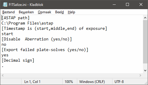 ChangelogChanges made since the tool became available: 220401 - v.1.23: Writing empty cells instead of zeros to output file for those fields that require a successful plate-solve. Added option to INI file to not store unsolved FITS in output file; Replaced the running dots by a rotator to indicate progress; Added FITS folder to the end of the output file; Added processing stats to the end of the output file. 220401 - v.1.22: Addition of non-standard "UTC" keyword; Added one header line to the output file showing version of FITSalize and creation date/time. 220401 - v.1.21: For pressure AOCBAROM is used when PRESS and PRESSURE are not available in the FITS-header; Takes FOCTEMP as temperature for the refraction calculation when AMBTEMP is zero (and vice versa); Exporting refraction to spreadsheet; Removed bug from spreadsheet (in calculation tab columns C and D referenced to one line above); Added column for refraction to spreadsheet. 220331 - v.1.2: Fixed bug in calculation of Nutation in Longitude of the Ecliptic; Calculations of nutation and the obliquity of the ecliptic are now based on JDE instead of JD; Improved output to console (Number of lines now match standard console, degrees sign now properly shows); Allowed changing decimal sign from dot to comma via the ini-file; Spreadsheets have same versioning as main program. If you have any questions and/or remarks please let me know. |