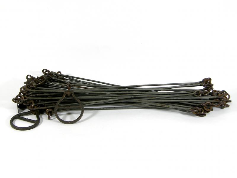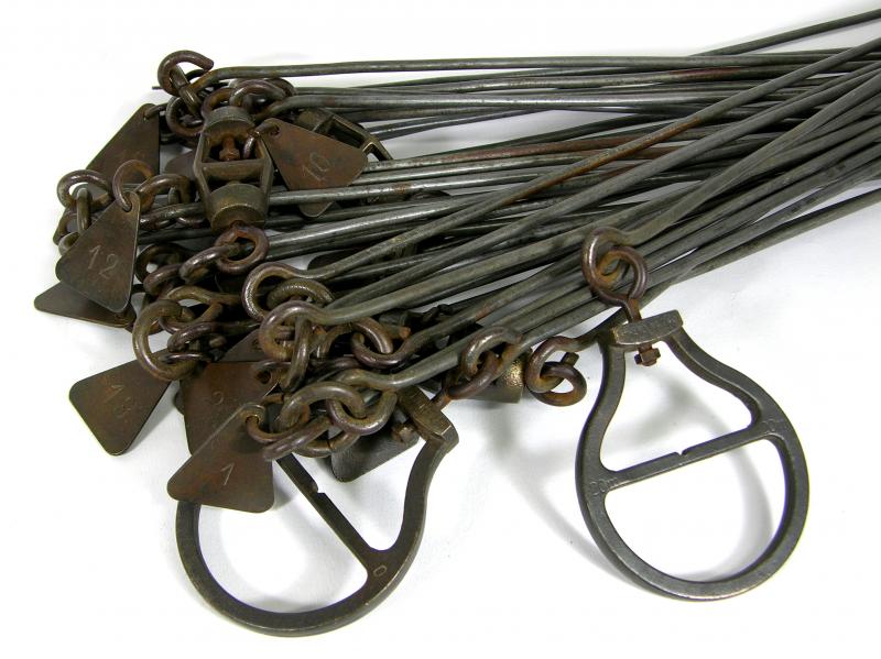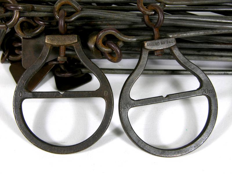 20th century Ahrend 20m chain nr. 7401This chain appeared on a Dutch on-line auction site in October 2018. Although I had already quite a few chains in my collection, the one shown here was of interest as it was 20 metres long, made of 40 half metre links. This makes it double the size of the 19th c. Lerebours chain in the collection and about the length of the imperial 19th c. Doyle and Son Chain. The links are connected with each other using rings of the same material of the links themselves. Every second ring a triangular label indicates the length along the chain. At 10 metres a barrel shaped connector is used. This connector allows rotations along the chain, but also adjusting the length of it as it is fastened to the links with threaded eyes. This type of adjustment was however not very practical as the screws would get clogged with rust and sand,1 and it was therefore recommended to either adjust or to keep track of its true length.2 Chains of this type, so containing 40 links of half a metre each, have already been described in the nineteenth century by Brandenburg,2 but this particular example most likely dates from the 20th century as the firm Ahrend was established in 1896. In general the handles of chains and steel tapes have grooves, sometimes both pointing towards the chain, sometimes pointing in opposite directions. These grooves were to place the handle correctly against the 6 or 11 skewers that were used to stake out or measure a length. When pointing in opposite directions one is not dependent on the thickness of the skewers.3 This Ahrend chain has them both pointing towards the chain for which one had to use skewers of the correct thickness. Although the handles are identical in shape, one is punched with the indication "0m", the other with "20m" (see figure 5). Both handles bear the text "AHREND NO. 7401" and the text "NIET VOOR HANDELSDOELEINDEN", the latter indicating that the chain should not be used for trading purposes (i.e. for taking measurements of products that are sold by length). Notes[1]: G.A. van Kerkwijk, Geodesie voor de Kadetten van alle Wapenen: Wiskundige Leer-cursus ten gebruike Der Koninklijke Militaire Akademie, (Breda, 1842), p.7.[2]: P.J. Brandenburg, Beginselen der Werkdadige Meetkunst: voornamelijk voor de aanstaande officieren der infanterie bij het Nederlandsch-Indische Leger, ('s Gravenhage, 1888), paragraph 36. [3]: Ch.M. Schols, A.C.C.G. van Hemert, Landmeten en Waterpassen: Met een Atlas van 19 Platen, (Breda, 1899), p.102. If you have any questions and/or remarks please let me know. |