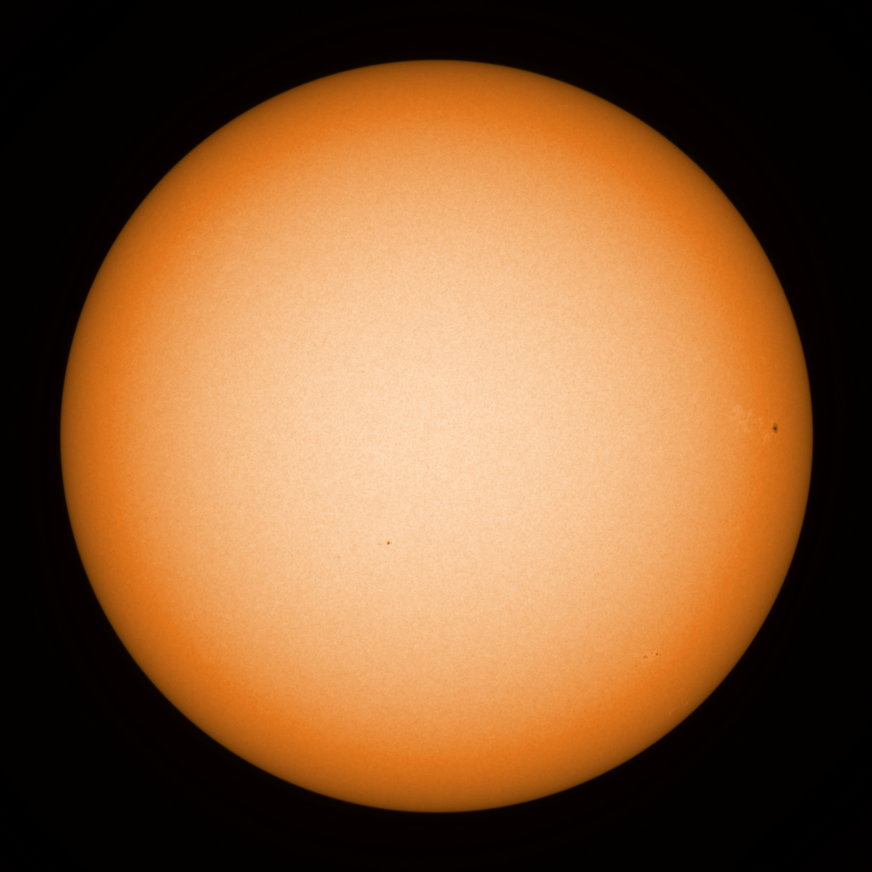 Observation date/time: 6 June 2021 @ 07:25 UTC Telescope: GTT60 (Galileo Type Telescope) Focal length: 1490mm (plano convex singlet) Aperture: 60mm Stop: 30mm Eyepiece: -75mm (plano concave singlet, 24mm aperture) Observation type: projection (353mm distance, 80mm diameter) Reference: Earth's rotation axis =================================================================== Total number of sunspots: 3 | |