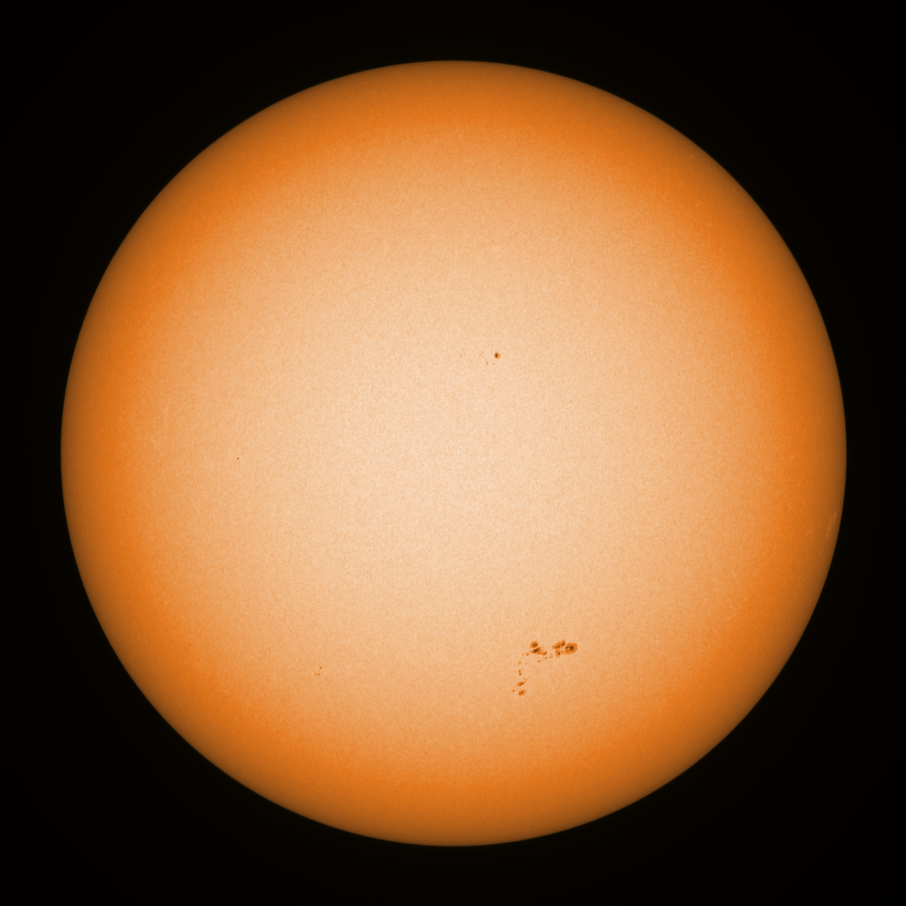 Observation date/time: 28 August 2021 @ 08:14 UTC Telescope: GTT60 (Galileo Type Telescope) Focal length: 1490mm (plano convex singlet) Aperture: 60mm Stop: 30mm Eyepiece: -75mm (plano concave singlet, 24mm aperture) Observation type: projection (351mm distance, 80mm diameter) Reference: Earth's rotation axis =================================================================== Total number of sunspots: 15 | |