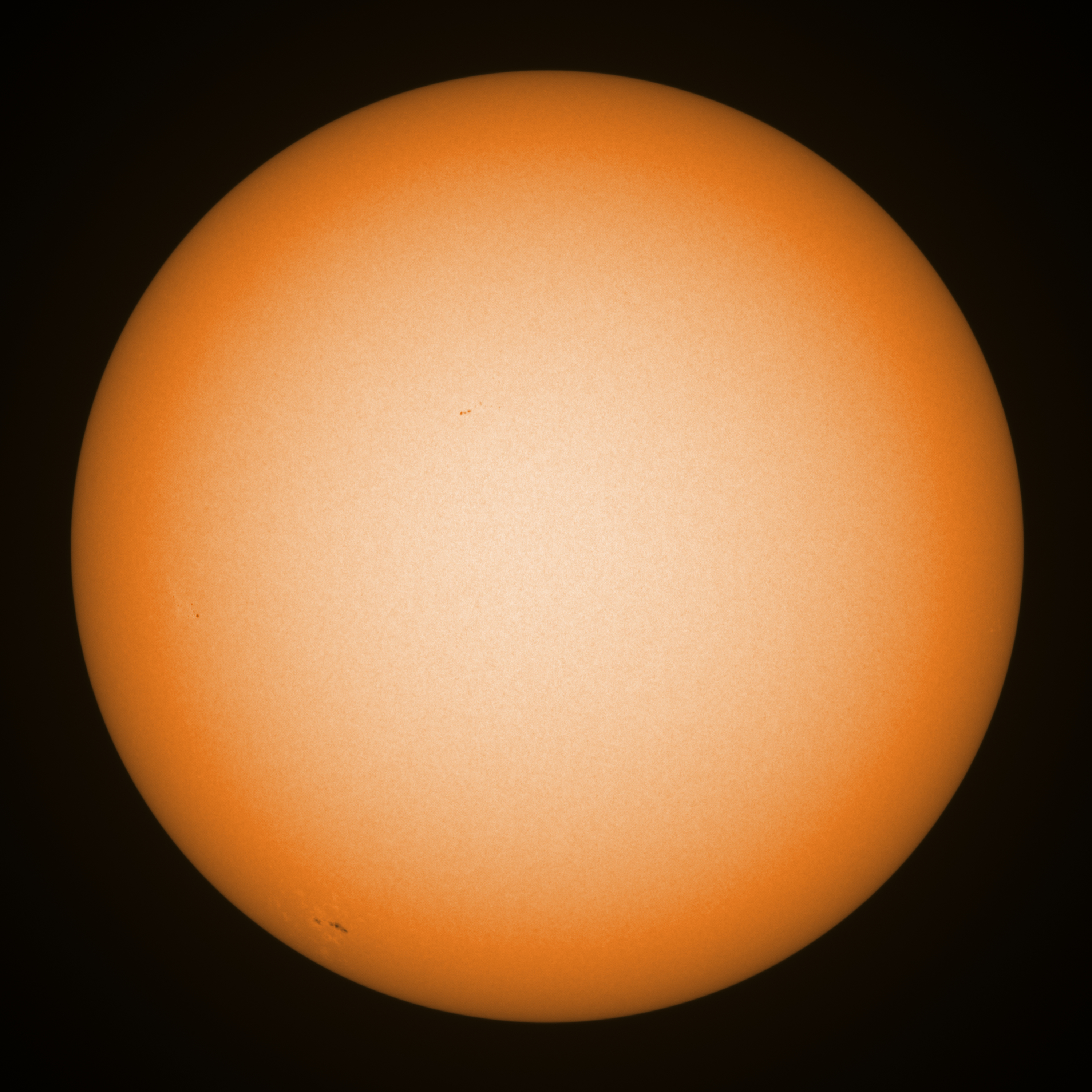 Observation date/time: 20 September 09:51 UTC Telescope: GTT60 (Galileo Type Telescope) Focal length: 1490mm (plano convex singlet) Aperture: 60mm Stop: 30mm Eyepiece: -75mm (plano concave singlet, 24mm aperture) Observation type: projection (351mm distance, 80mm diameter) Reference: Earth's rotation axis Exposure (transparency): 0.270ms Seeing (SSSMon): 4.0-4.5" =================================================================== Total number of sunspots: 3 | |